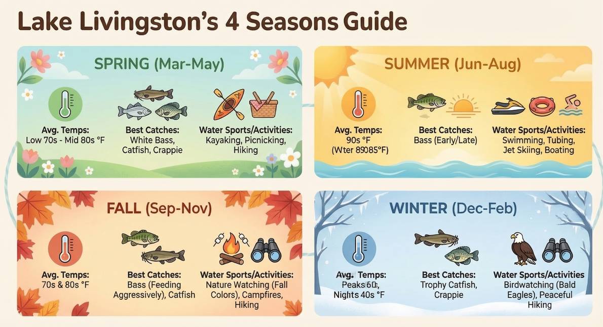 At BeachBox, we love helping families plan the perfect Texas getaway. Just over an hour north of Houston, Lake Livingston is a massive and beautiful lake tucked into the Piney Woods. It offers 90,000 acres of water and endless outdoor fun. But when is the best time to visit Lake Livingston?