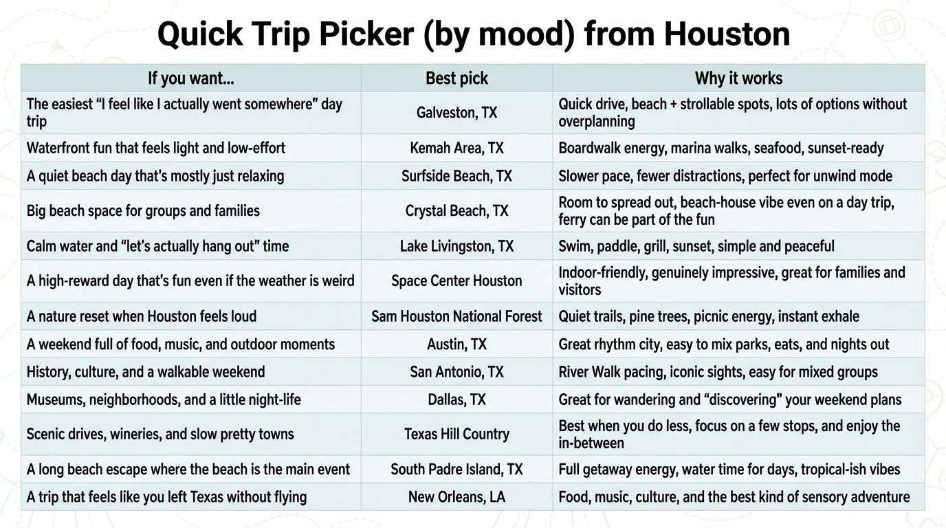 Galveston is one of the quickest “feels like a real trip” options, with beach time, The Strand, and plenty of food spots.