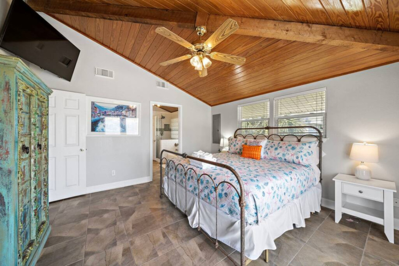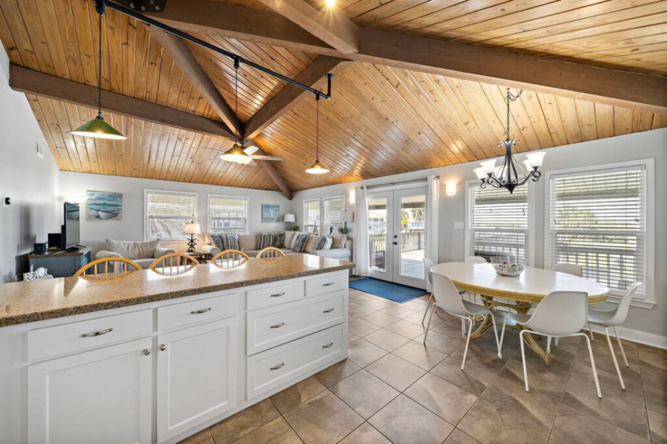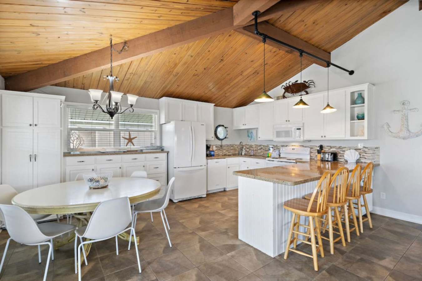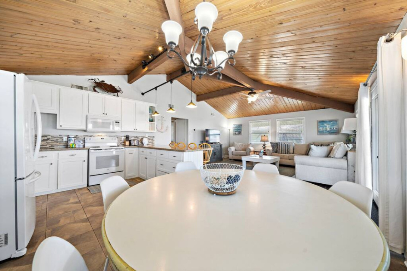 Unwind and connect at Anchor Down! The open-concept living area seamlessly blends the kitchen, dining, and living room, creating a perfect space for sharing stories and meals. Whip up feasts in the modern kitchen, gather around the dining table, or relax with a movie on the large flat-screen TV.