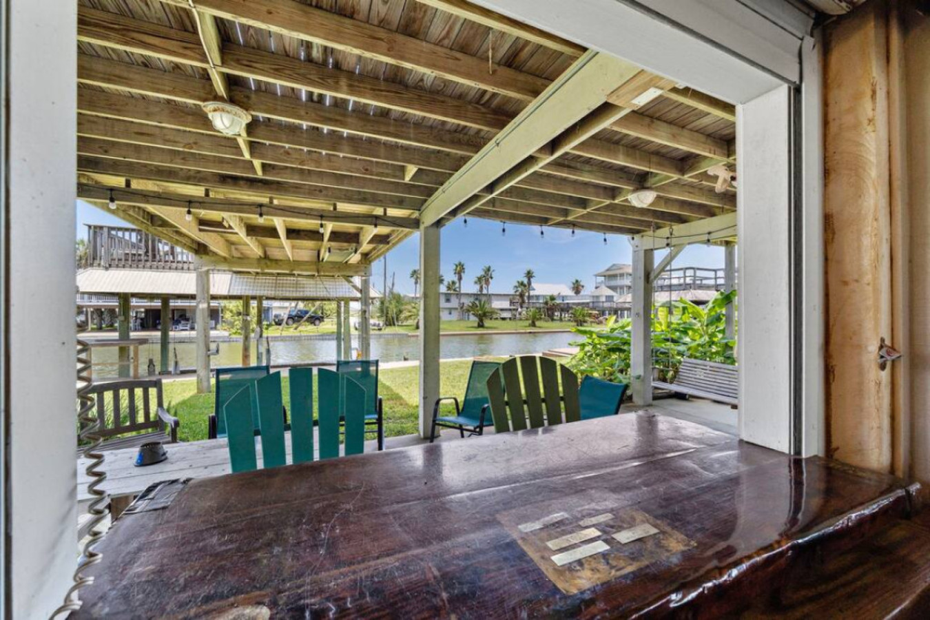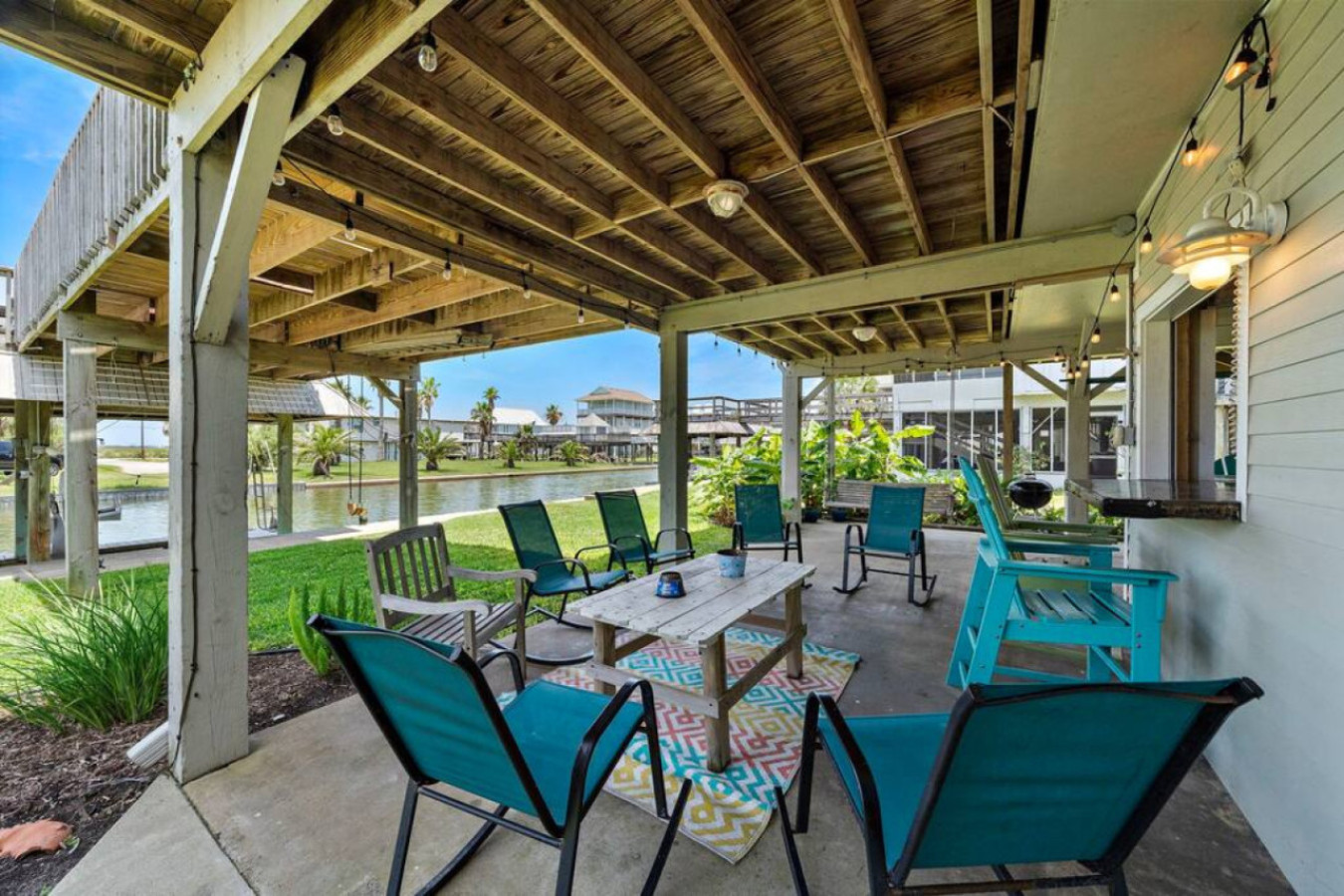 The fun spills outside! The expansive wraparound porch boasts stunning canal and bay views. Soak up the sun on the deck, enjoy al fresco meals under the shade, or simply relax with a cool drink. Downstairs, the tiki bar with a full kitchen creates another entertaining space. Grill up a feast on the BBQ pit, play games at the bar, or unwind by the water on the comfy seating or swinging bench.