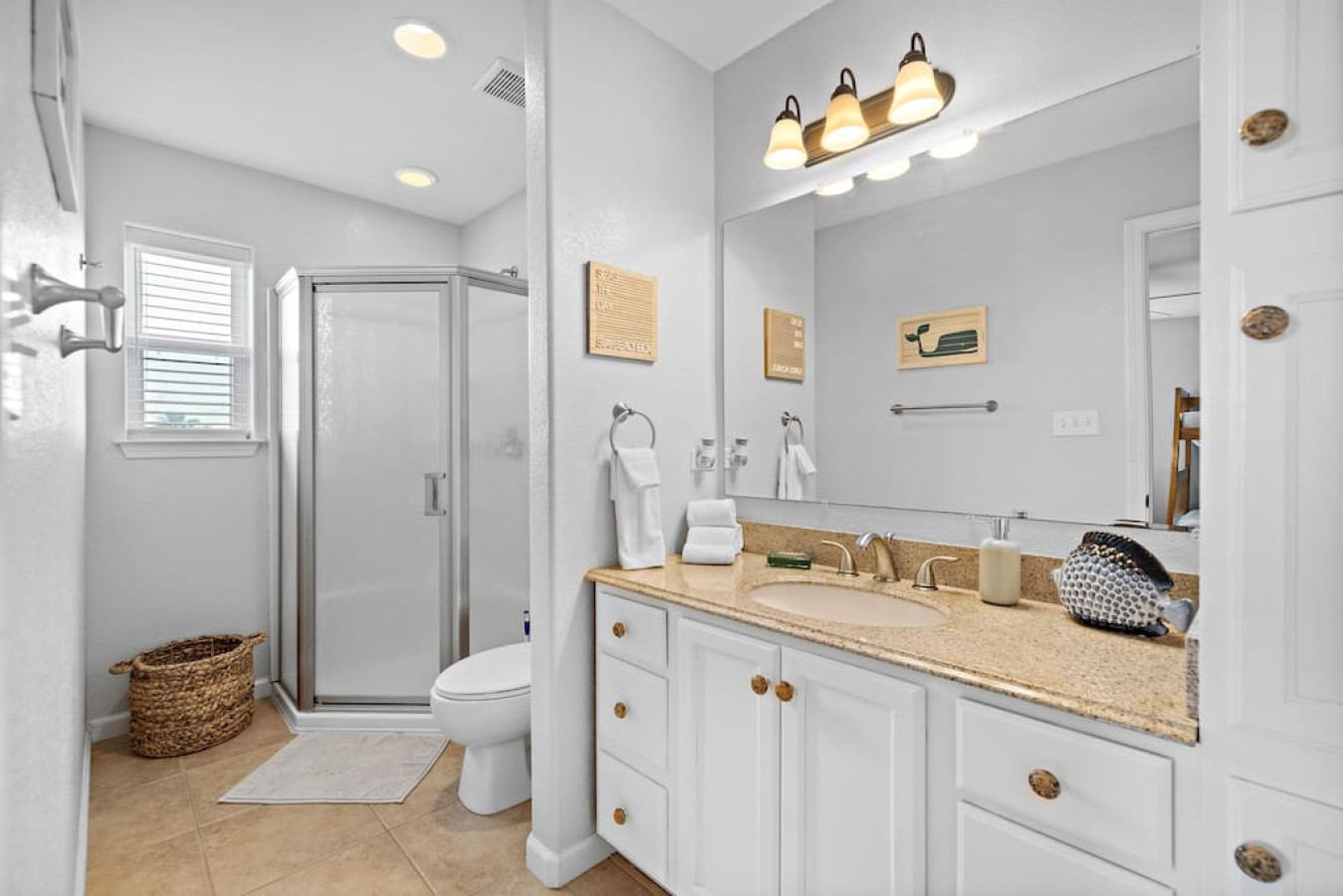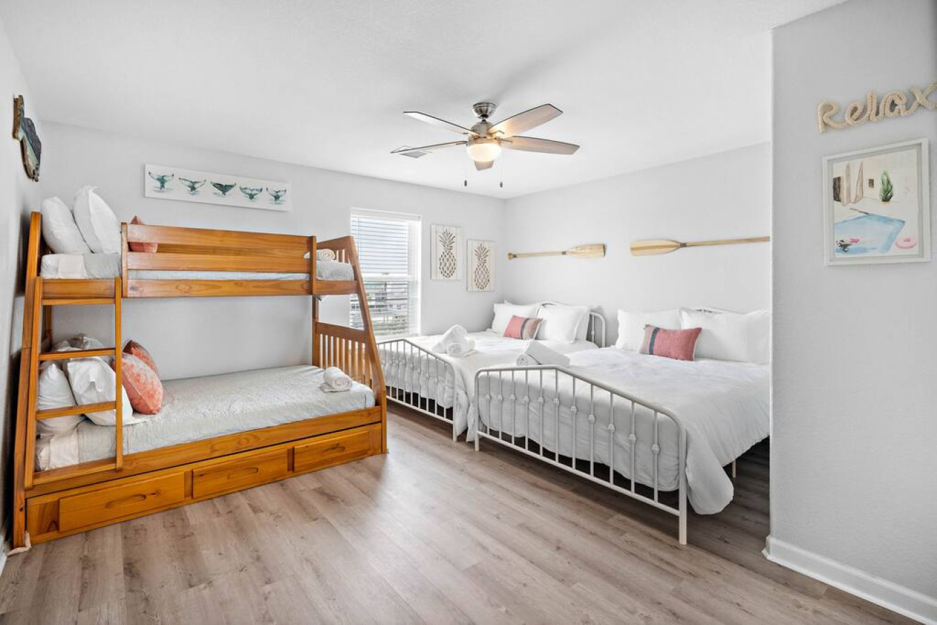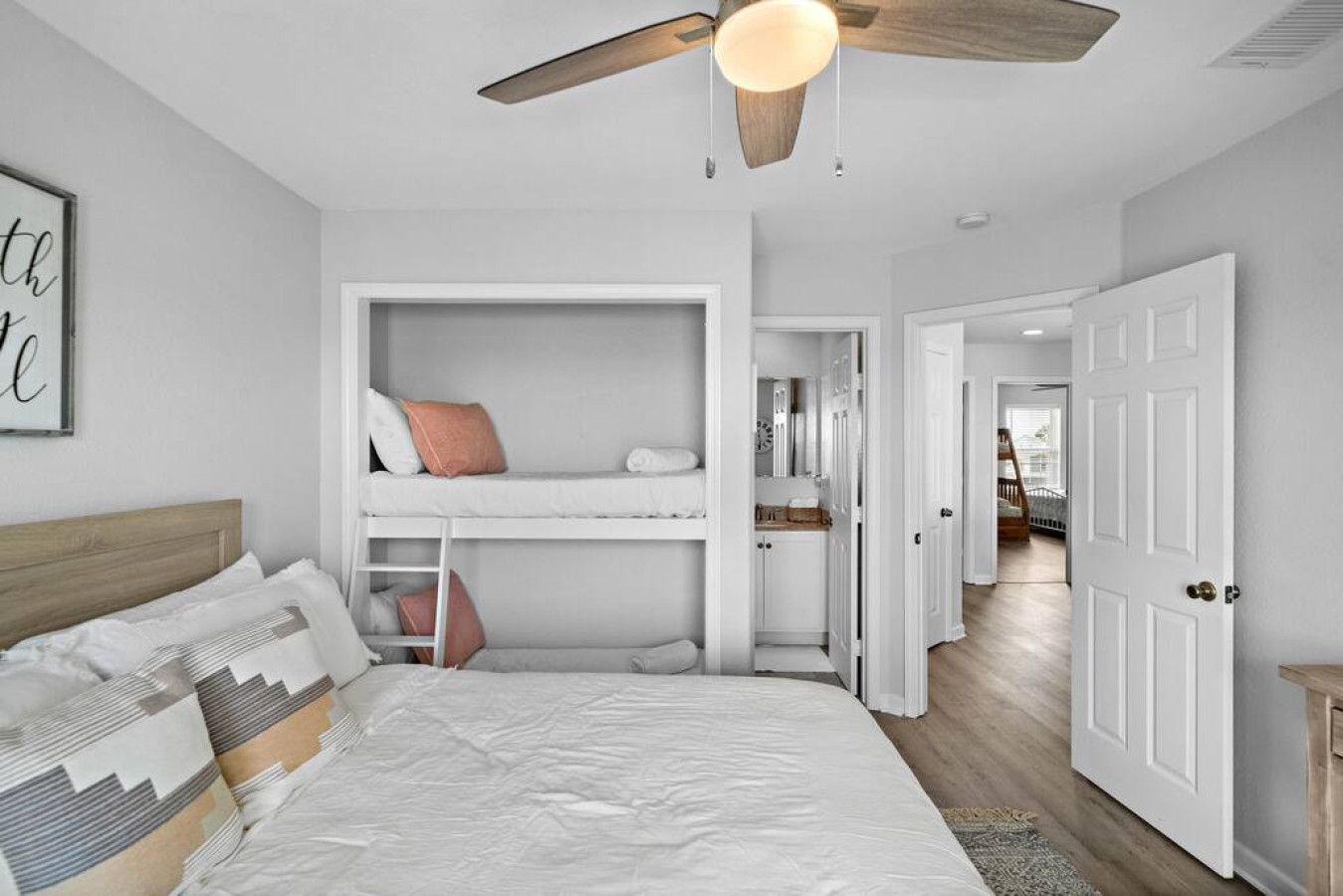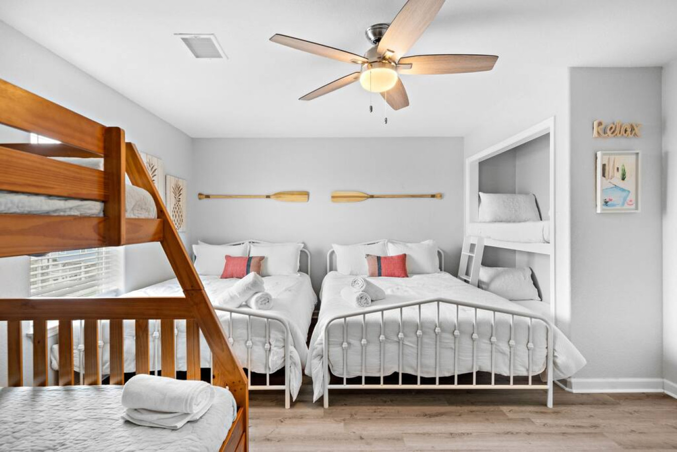 Down the hallway from the living area, the master bedroom has a king-size bed. The attached ensuite bathroom has a separate shower, soaking tub, and marble-topped vanity. Upstairs on the third level, there are three more bedrooms— each with their own private, attached bathrooms. The first bedroom has two queen-size beds and a twin-over-full bunk bed with twin trundle. The second bedroom has a king-size bed and access to the third-floor deck space overlooking the canal. The third bedroom on this floor has a king-size bed and twin-over-full bunk bed.