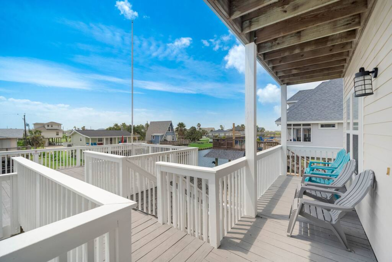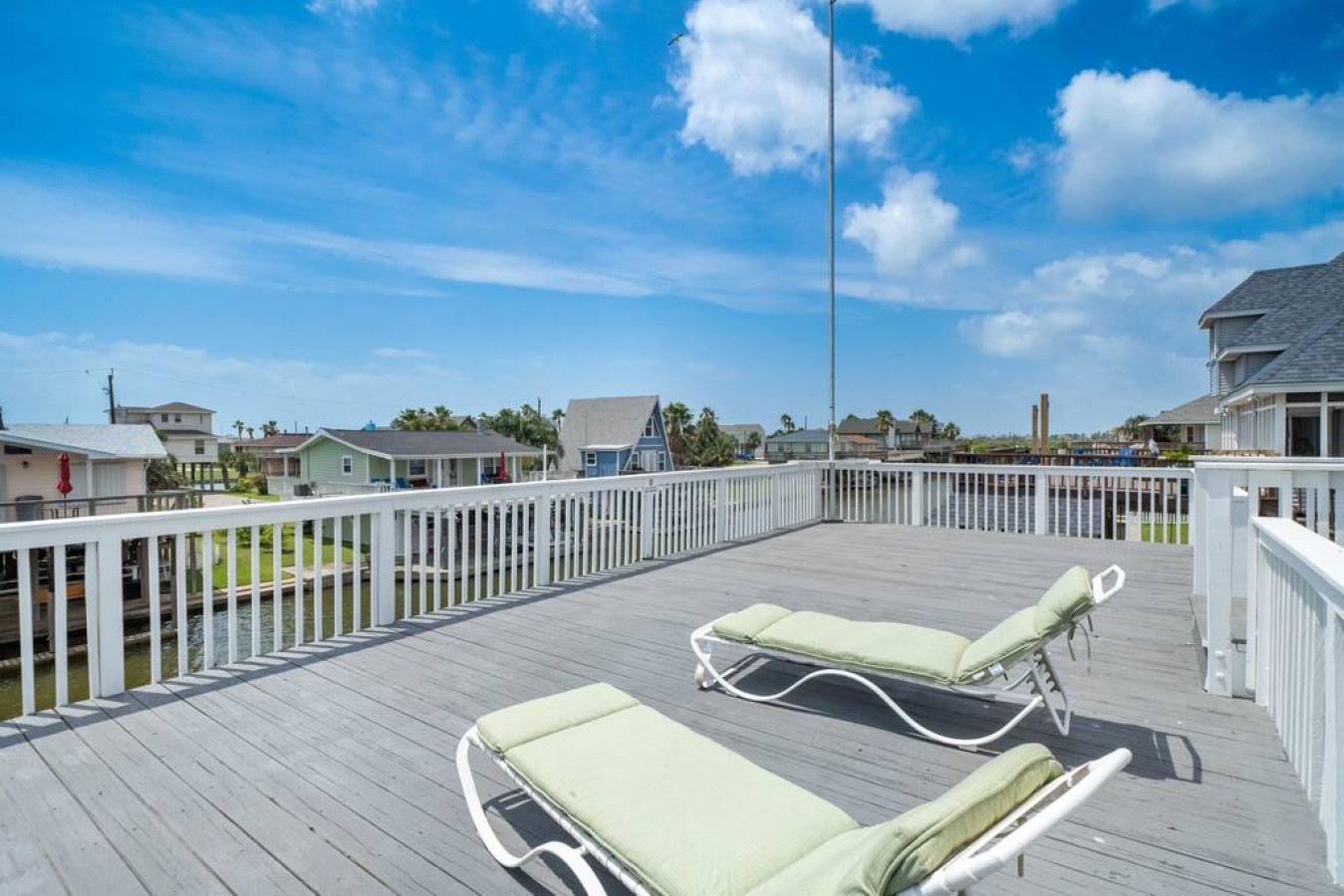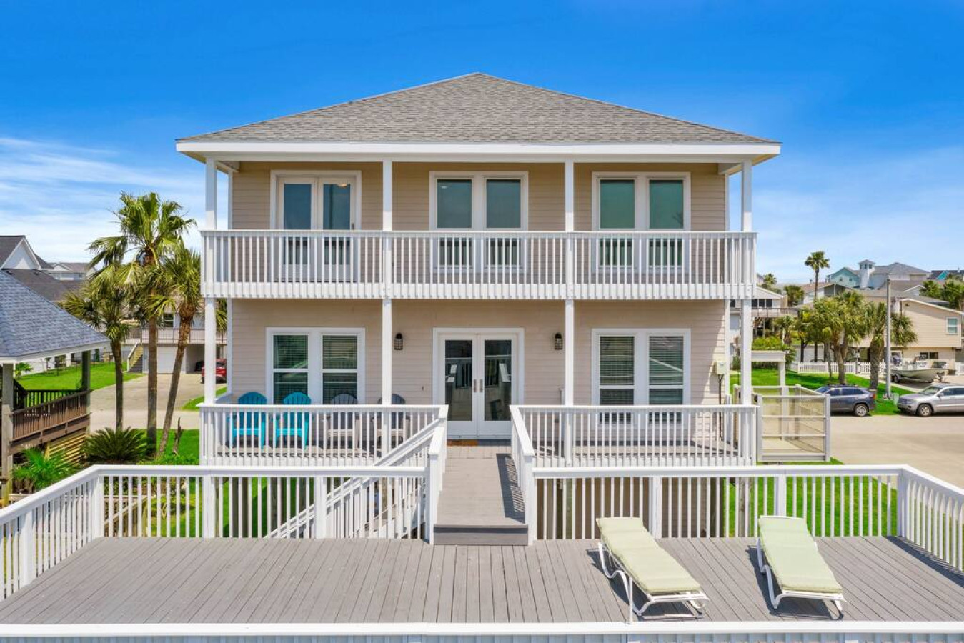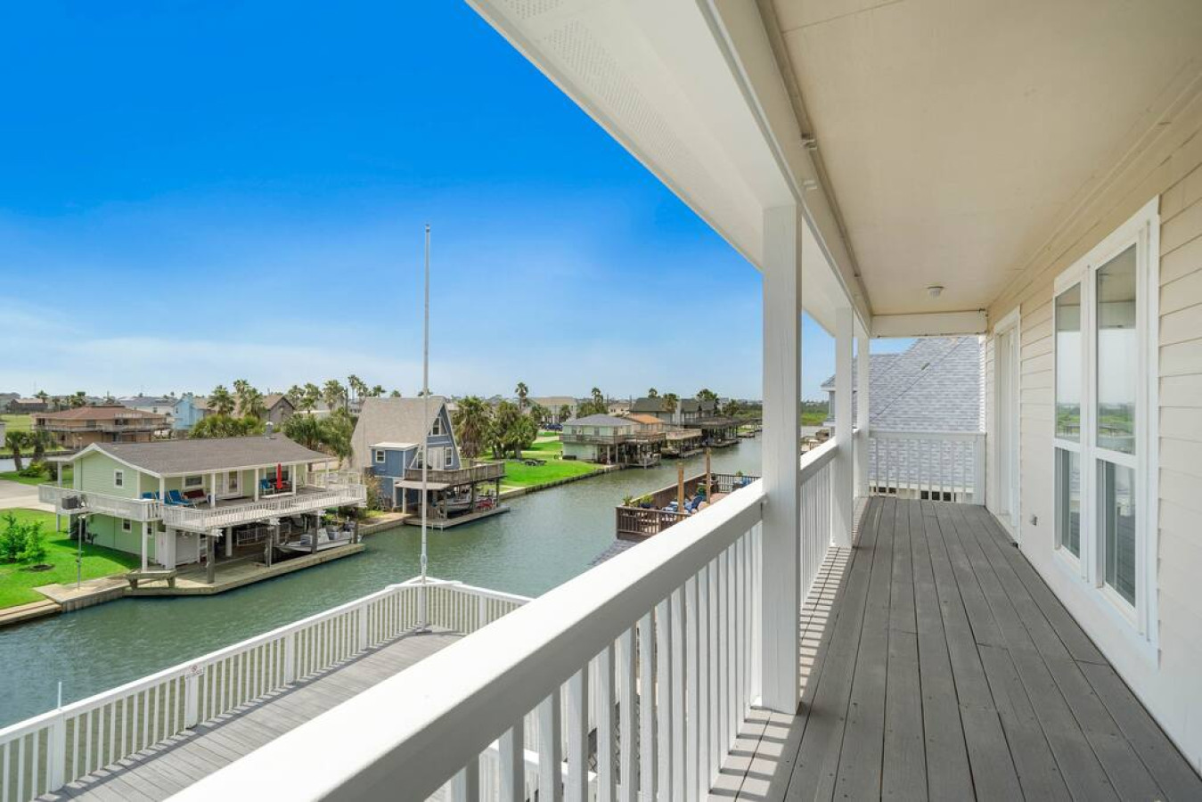 Tucked into the quiet seaside community of Terramar Beach, Big Kahuna is a large waterfront home with a fresh and modern vibe. The home is located on a deepwater canal just 2 minutes from the beach and has tons of spacious, sun-drenched deck space, an outdoor shower, a boat slip, and a charcoal grill. There’s enough space at Big Kahuna for up to 22 people— so invite the whole crew to join you for an unforgettable group getaway to the Texas coast.