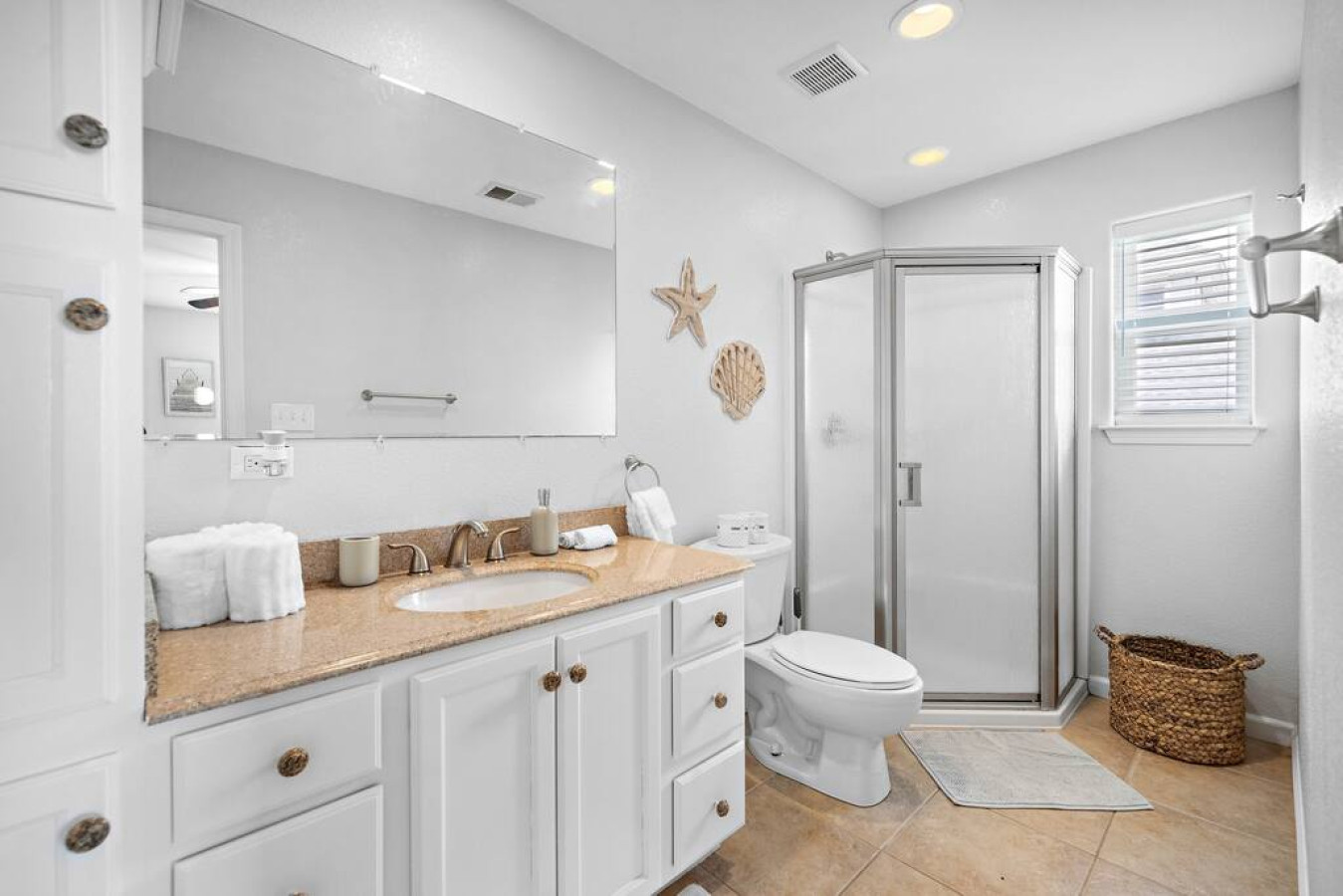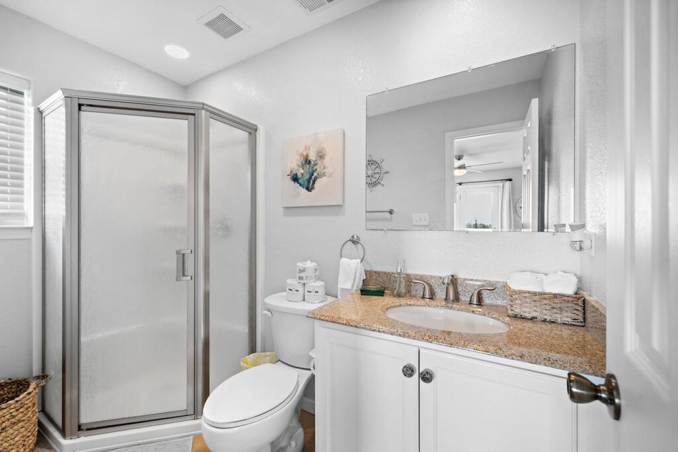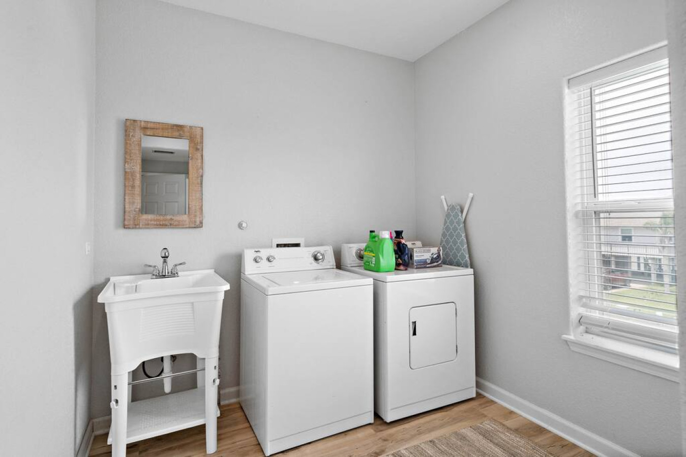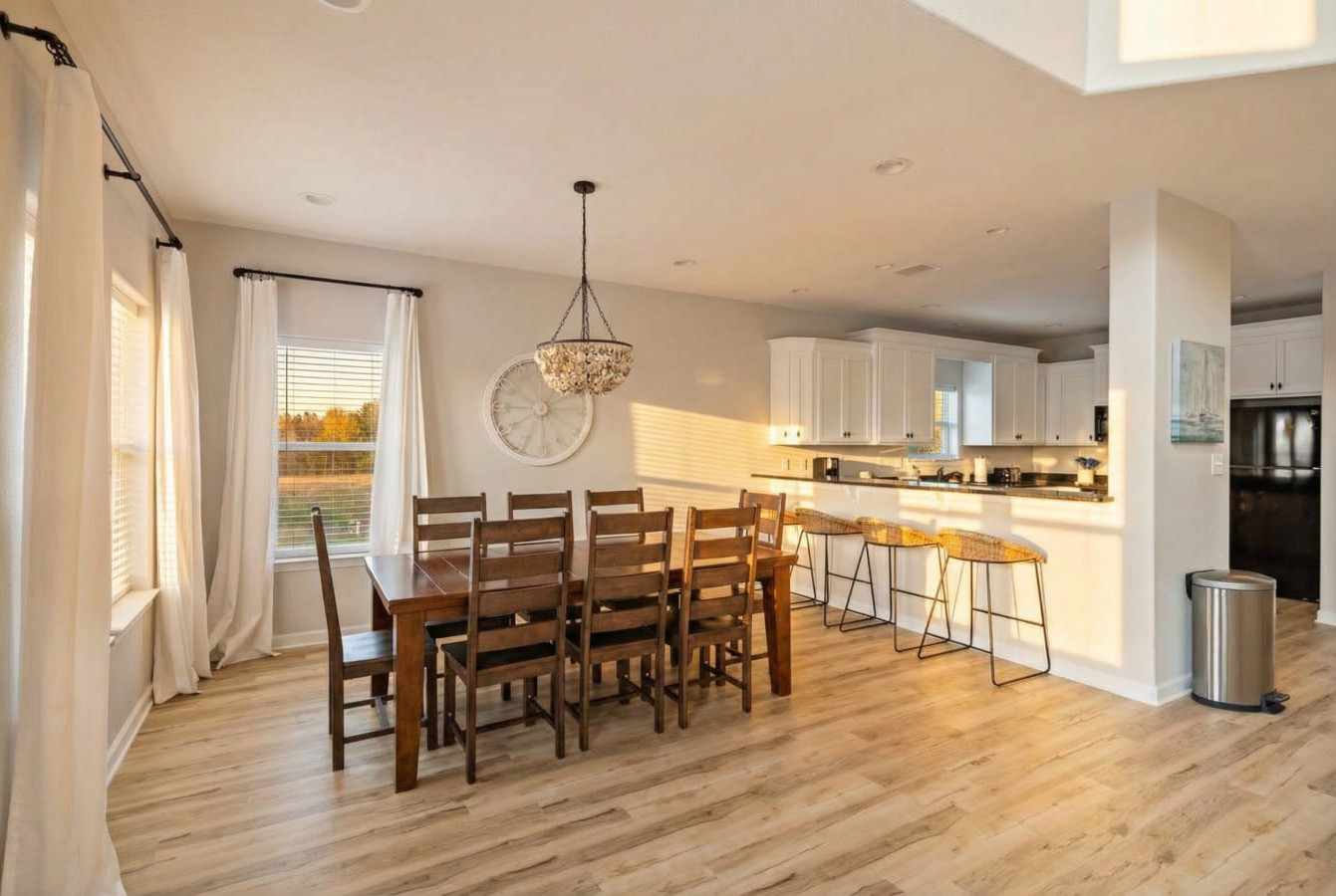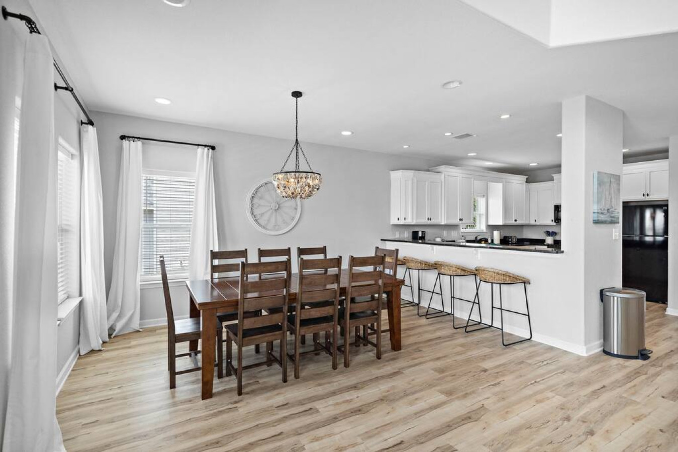 The kitchen is laid out in an efficient u-shape and features quartz countertops with a tiered peninsula bar. Flip a stack of fluffy banana pancakes in the mornings, or mix a batch of frozen margaritas at happy hour— the kitchen is fully equipped to handle it all. The bar space has seating for four people, while the dining table has seating for eight. A half bath and laundry room are located around the corner.