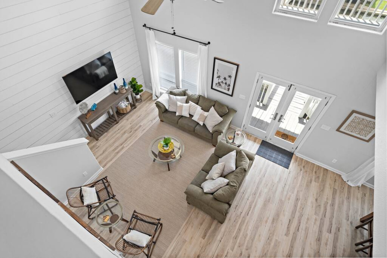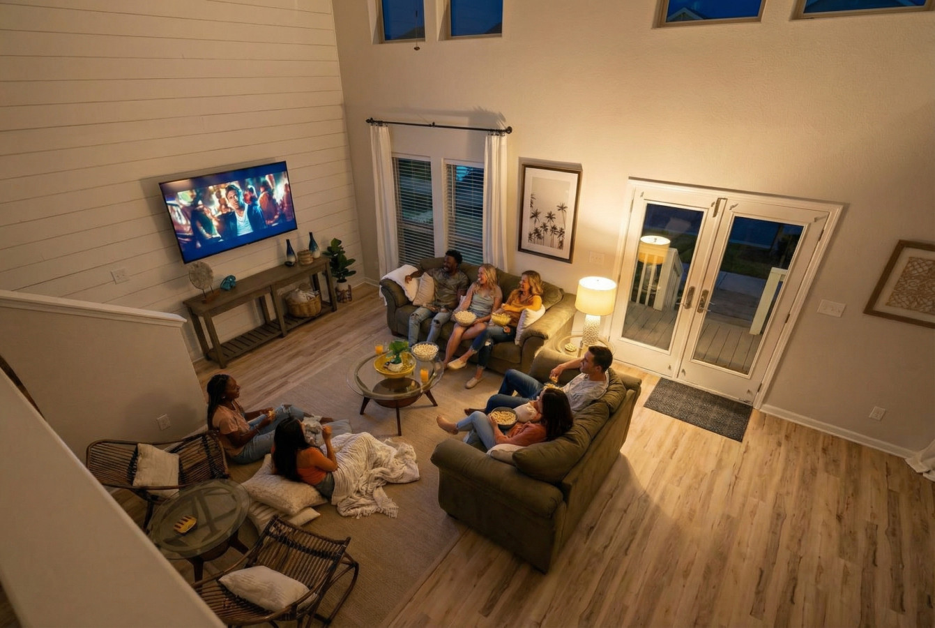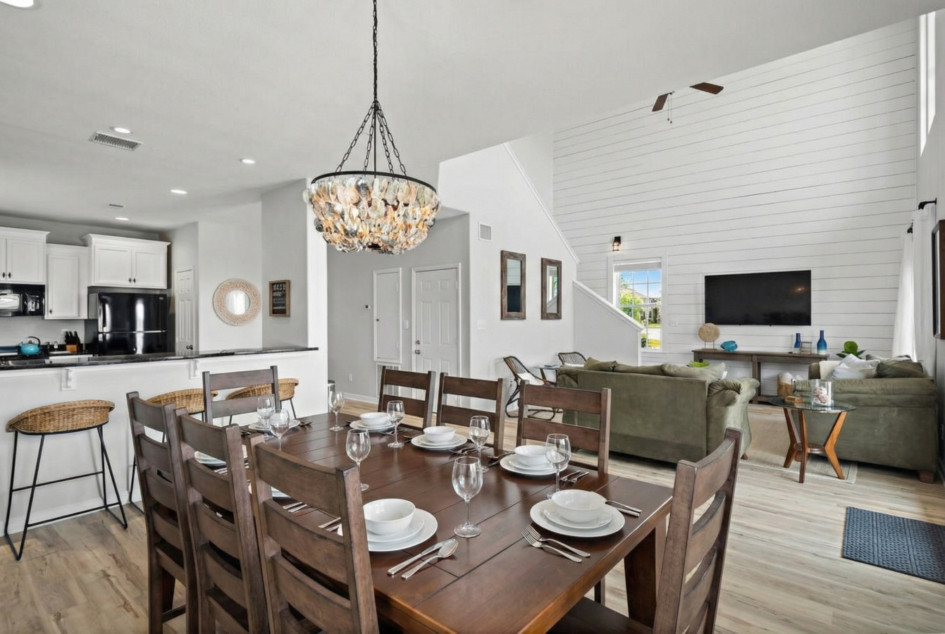 The soaring, two-story, contemporary living area has plenty of space for your whole group to unwind and spend time together. Plush, overstuffed sofas face a flatscreen television that’s mounted to a crisp white shiplap wall. Kick back here in the evenings with some snacks and a favorite movie. Glass accent tables and stylish armchairs complete this comfy, modern space.
