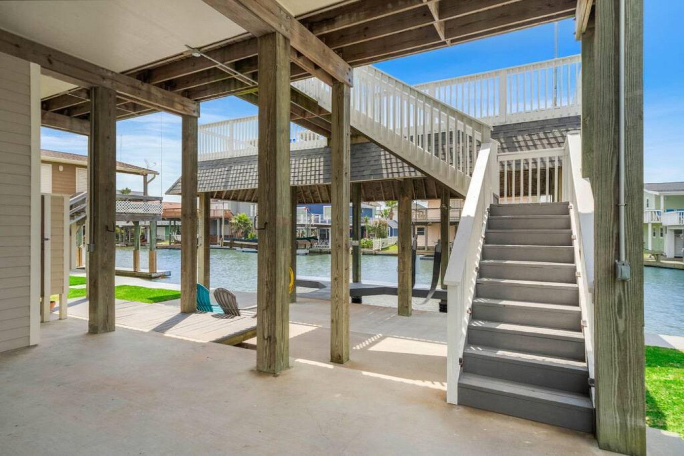 On the ground level, a fifth bedroom that doubles as a game room has a full-over-queen built-in bunk space, flatscreen television, and a bar top table for card games or board games. This room is connected to the main house through an interior staircase. Outside, there’s an outdoor shower for rinsing off after a day of fishing or hanging out at the beach. The covered dock space has a slip for parking your boat. Make sure to bring your fishing gear— there’s great fishing in the canal. And the Terramar Beach access point is a quick 2-minute drive from the home.