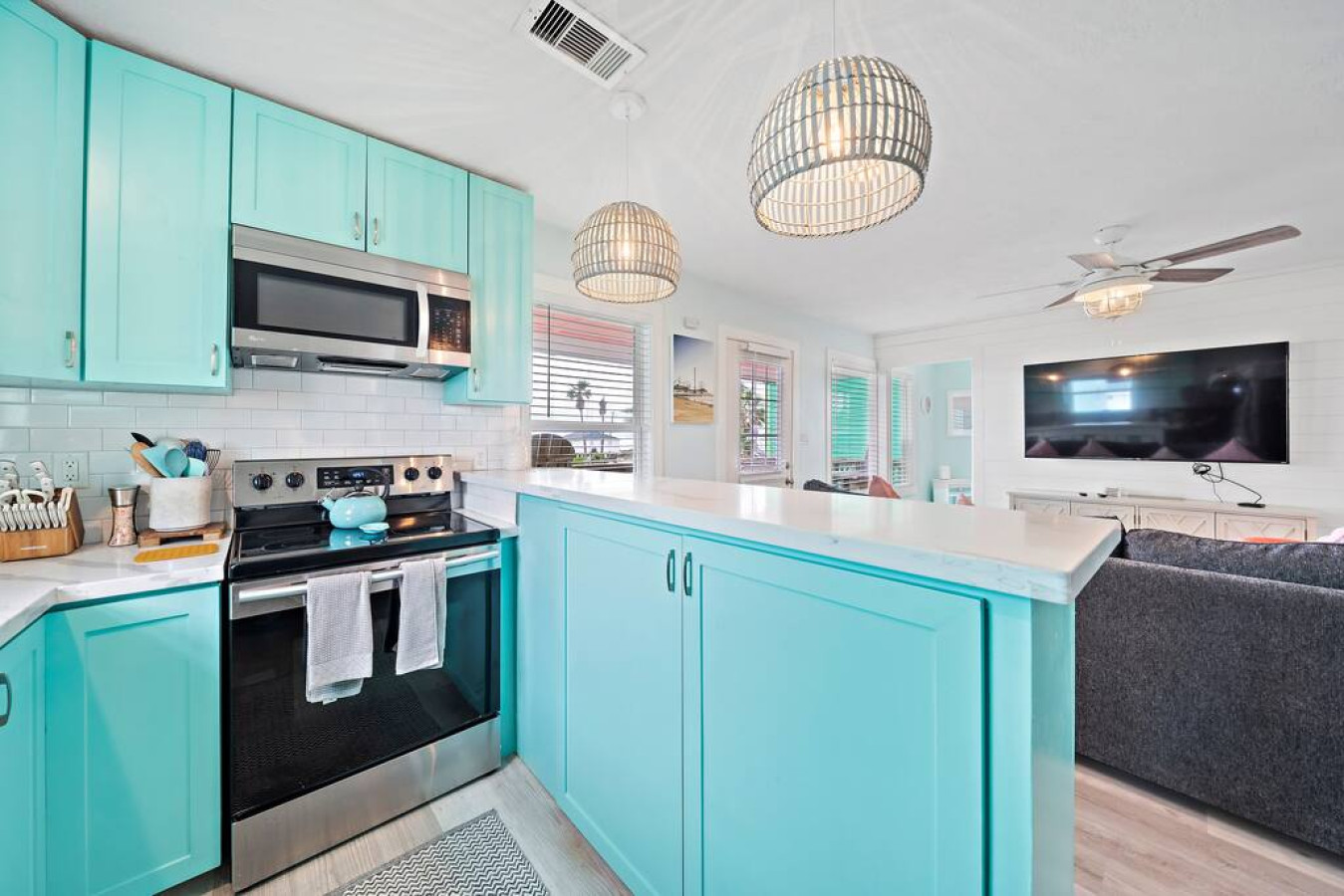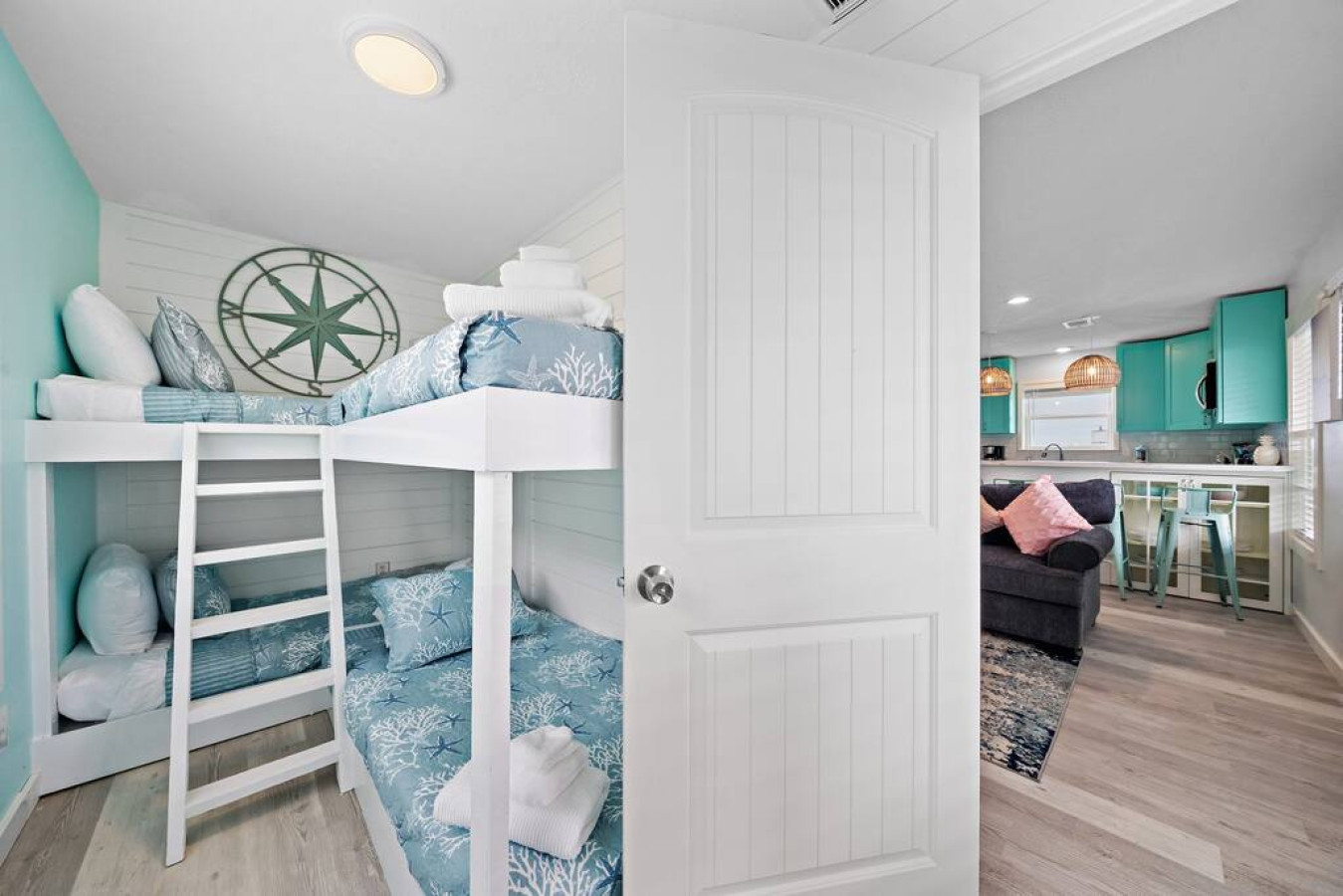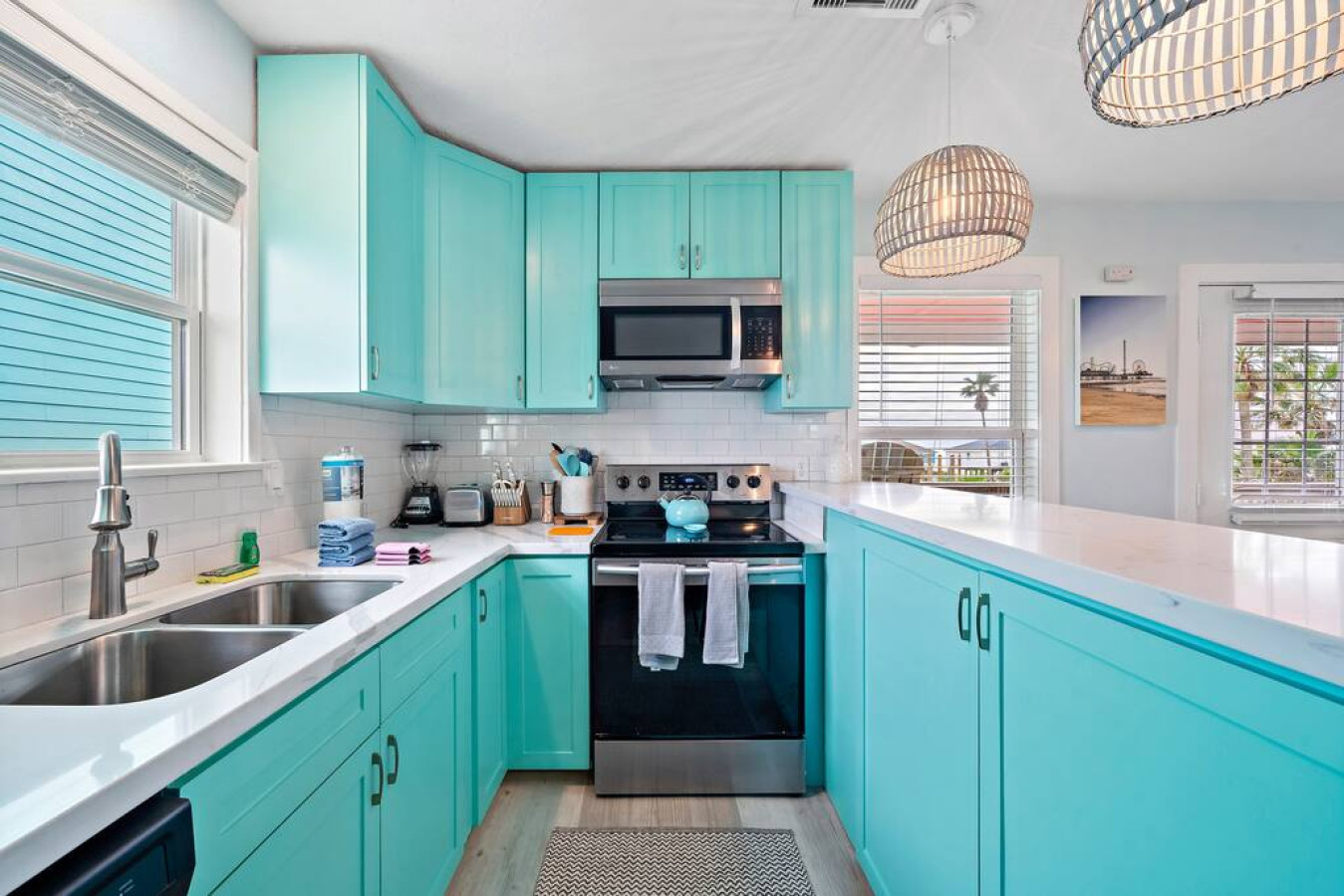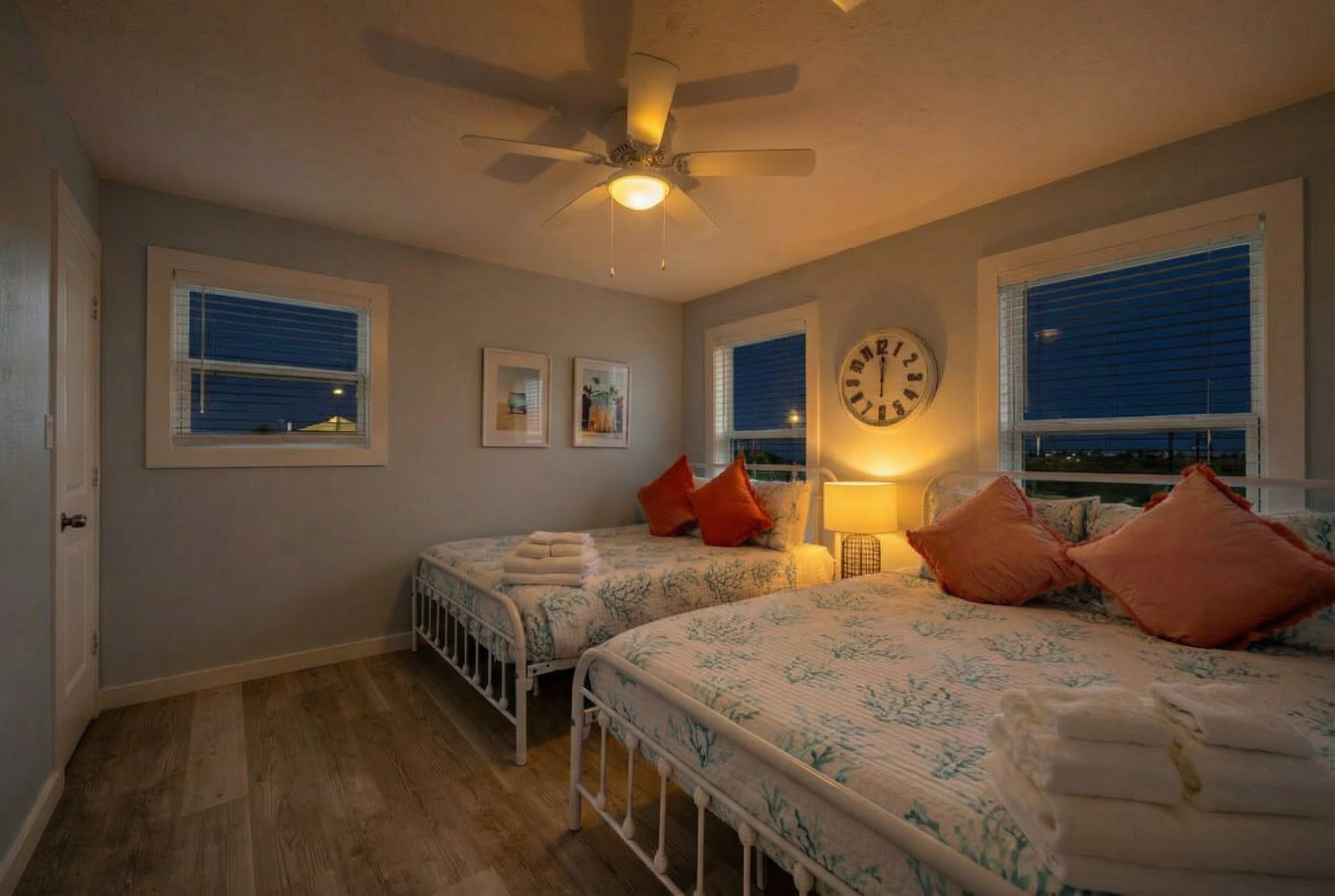 Step inside Blue Beard’s Cove and feel the stress melt away. The entire home is conveniently located on one level, featuring an open-concept kitchen and living room. After a day of exploring Galveston, sink into the plush couch and share stories about your adventures. The fully-equipped kitchen allows you to prepare delicious meals, while the washer and dryer make packing light a breeze. Tucked away on the same level are 3 bedrooms offering a peaceful retreat for everyone. There’s the master suite with a luxurious king-sized bed. Then a guest bedroom equipped with two queen-sized beds. Perfect for families or groups of friends. Finally the third bedroom has two twin bunk beds which offer a fun and cozy space for anyone to enjoy