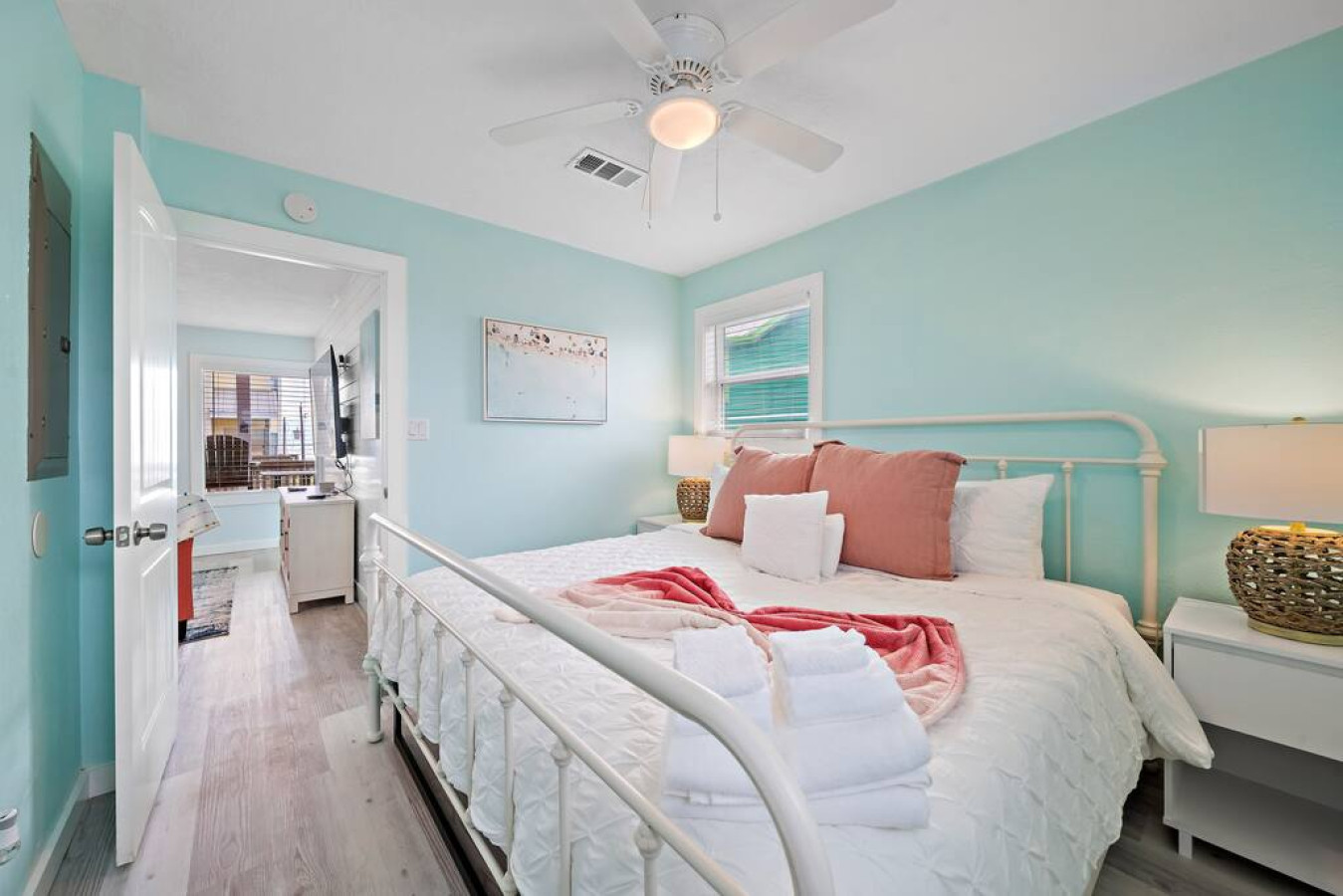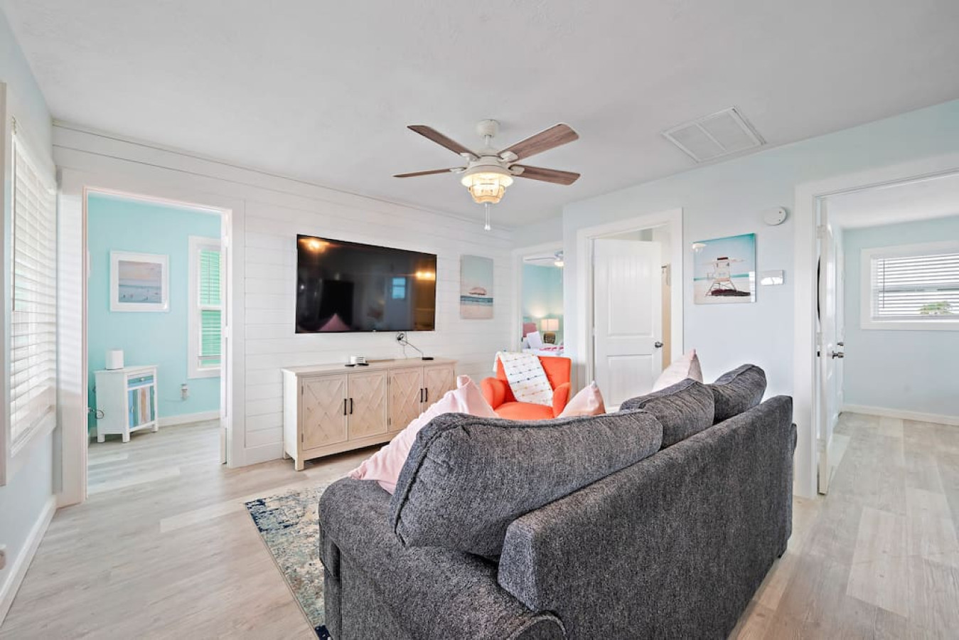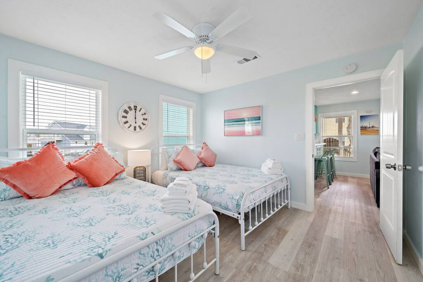Step inside Blue Beard’s Cove and feel the stress melt away. The entire home is conveniently located on one level, featuring an open-concept kitchen and living room. After a day of exploring Galveston, sink into the plush couch and share stories about your adventures. The fully-equipped kitchen allows you to prepare delicious meals, while the washer and dryer make packing light a breeze. Tucked away on the same level are 3 bedrooms offering a peaceful retreat for everyone. There’s the master suite with a luxurious king-sized bed. Then a guest bedroom equipped with two queen-sized beds. Perfect for families or groups of friends. Finally the third bedroom has two twin bunk beds which offer a fun and cozy space for anyone to enjoy