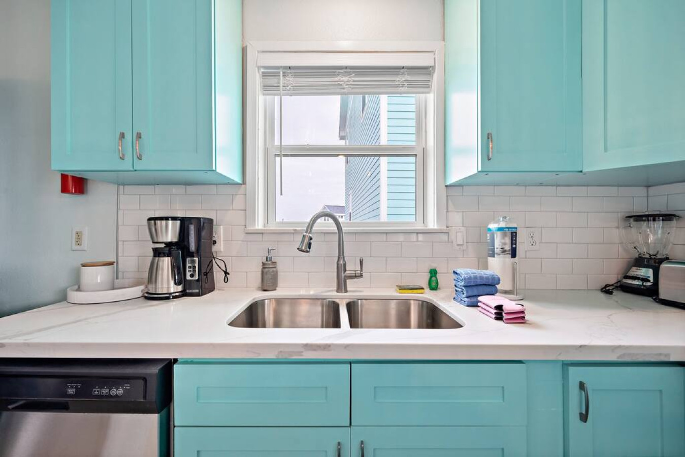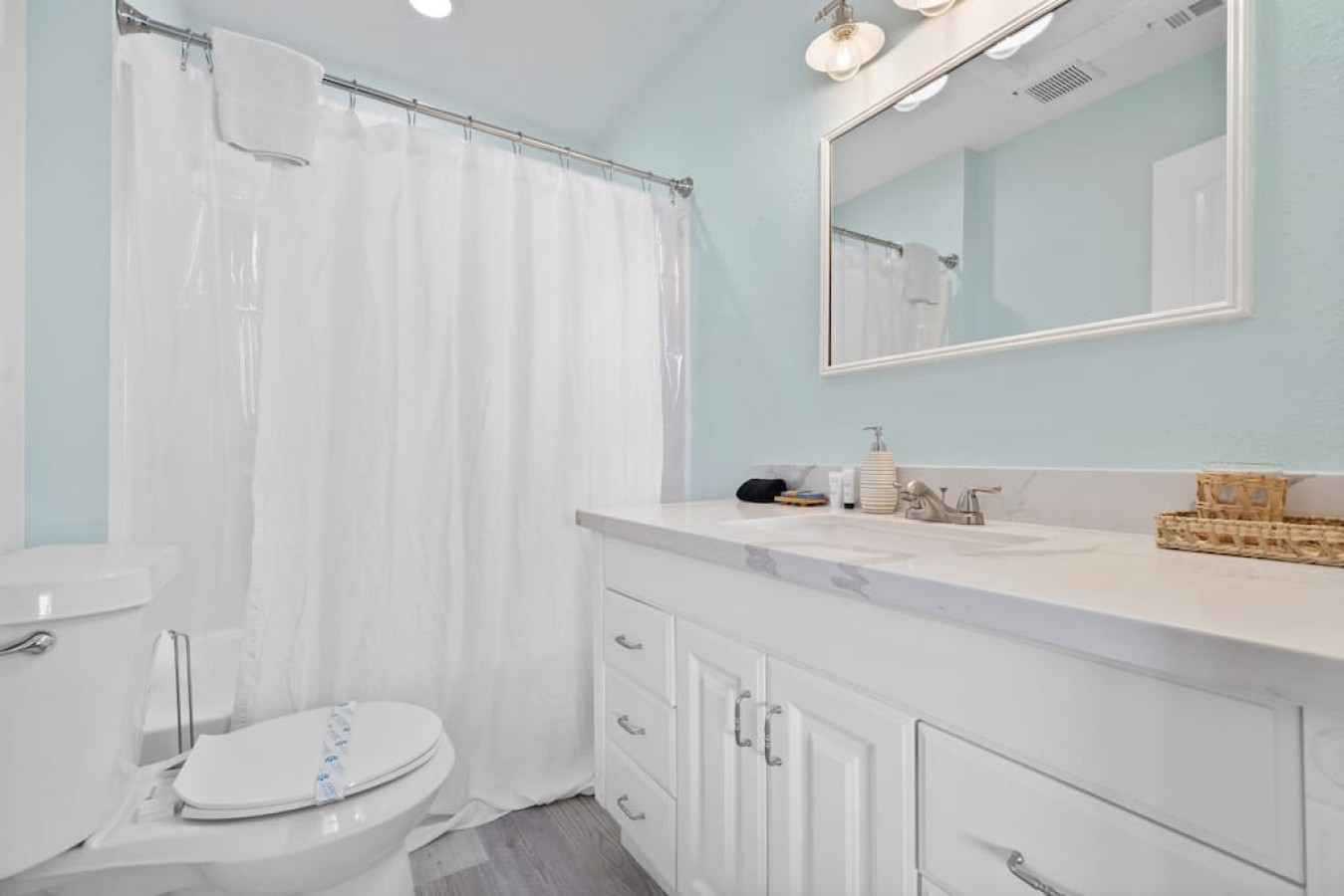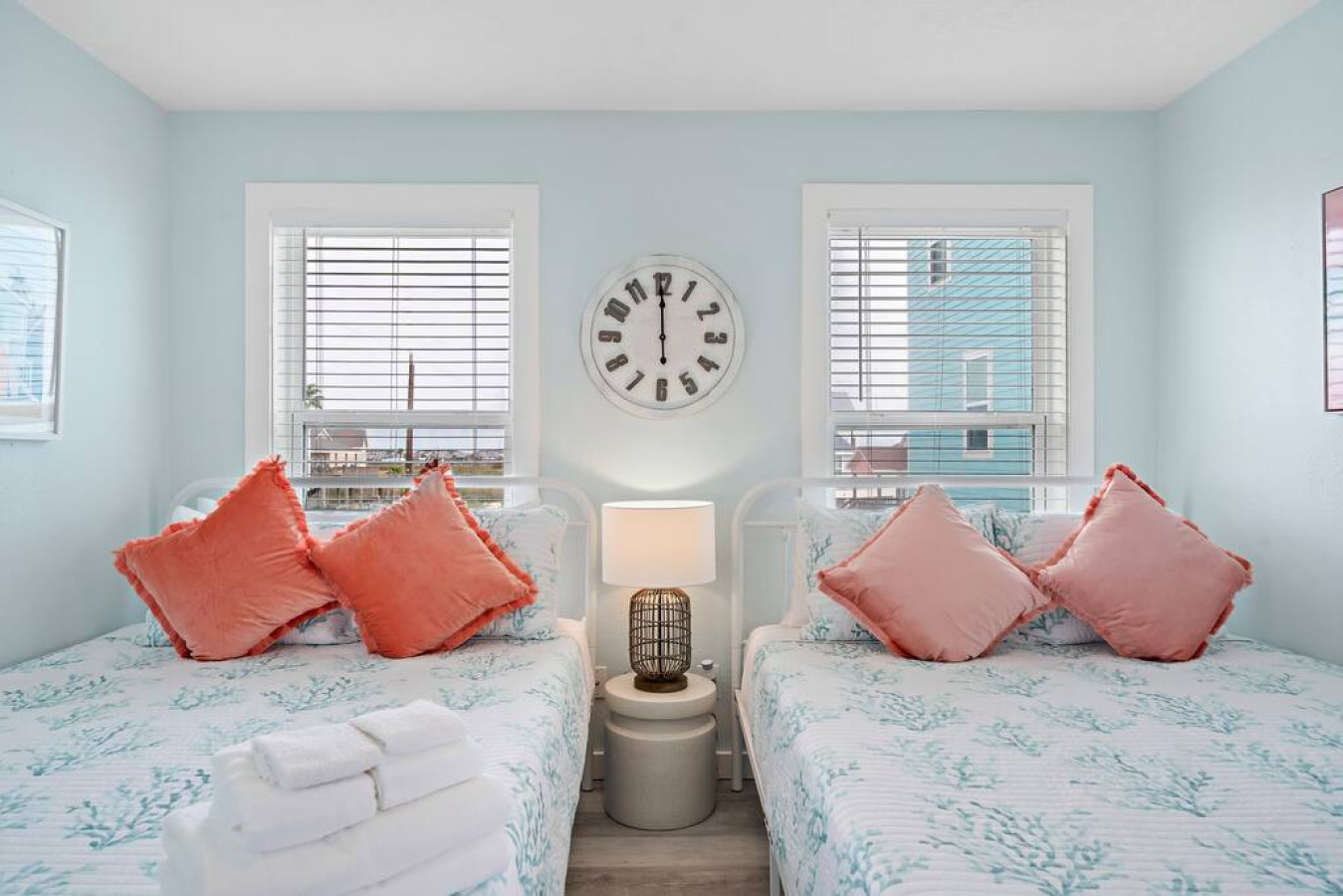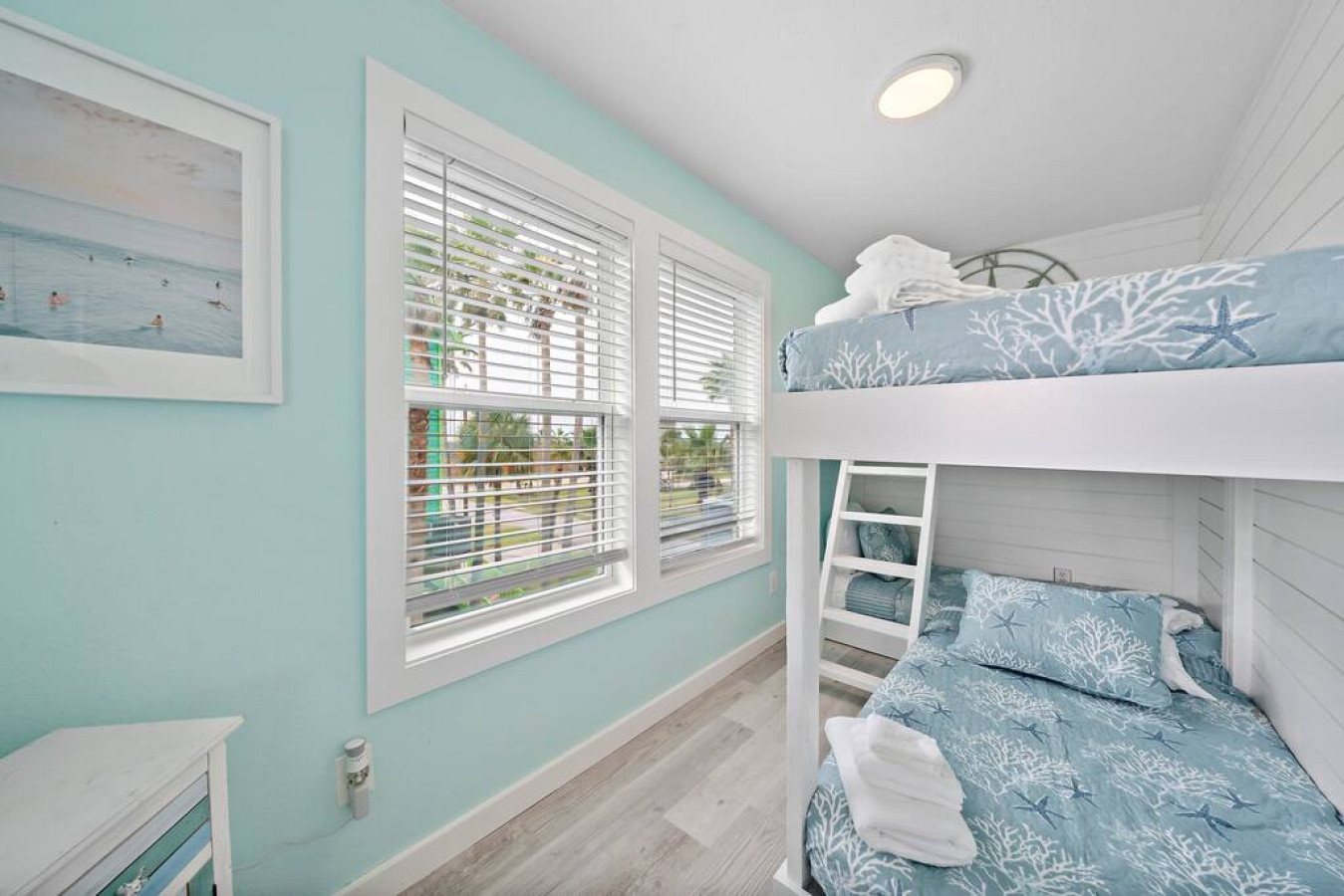 Step inside Blue Beard’s Cove and feel the stress melt away. The entire home is conveniently located on one level, featuring an open-concept kitchen and living room. After a day of exploring Galveston, sink into the plush couch and share stories about your adventures. The fully-equipped kitchen allows you to prepare delicious meals, while the washer and dryer make packing light a breeze. Tucked away on the same level are 3 bedrooms offering a peaceful retreat for everyone. There’s the master suite with a luxurious king-sized bed. Then a guest bedroom equipped with two queen-sized beds. Perfect for families or groups of friends. Finally the third bedroom has two twin bunk beds which offer a fun and cozy space for anyone to enjoy