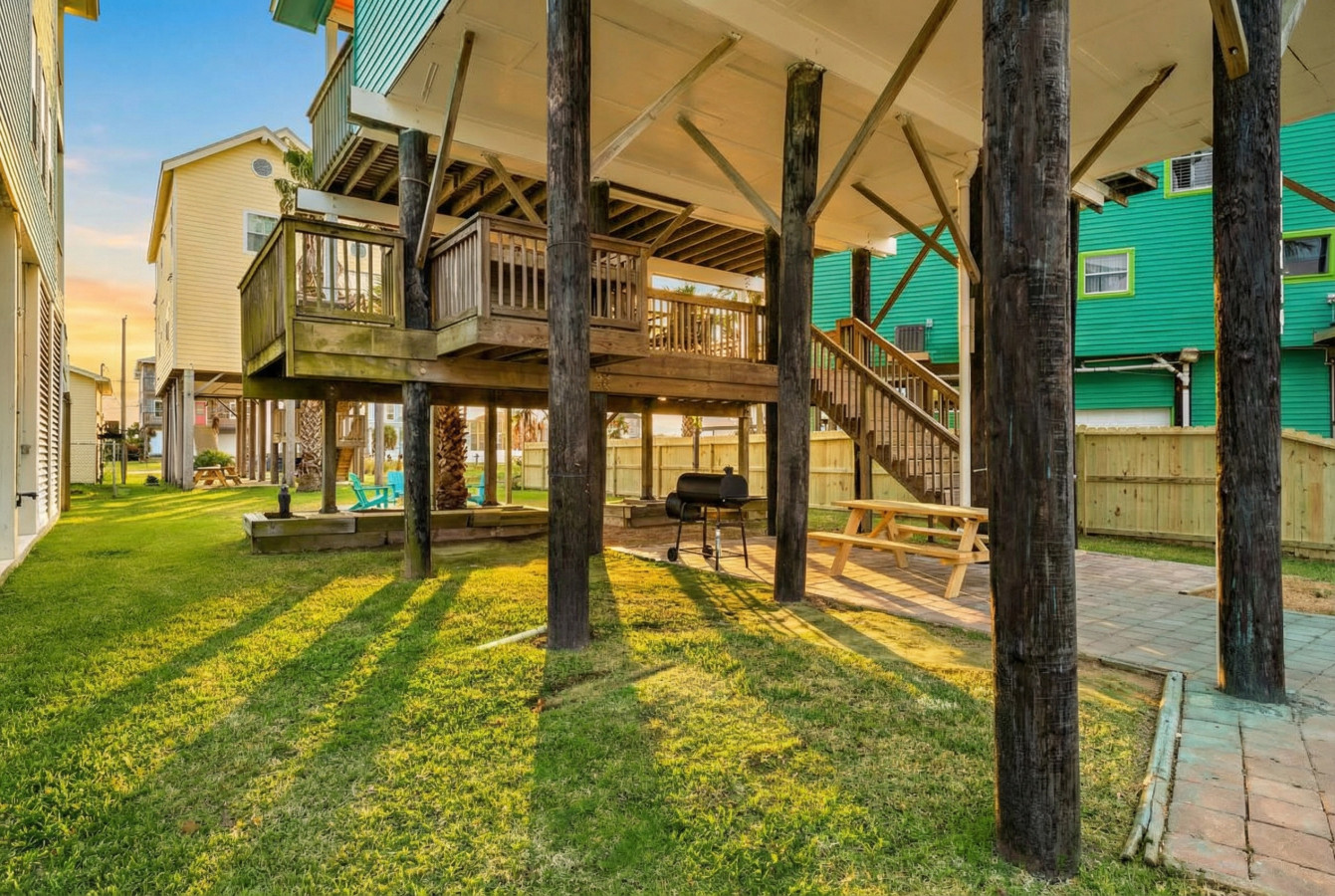 This stylish 3-bedroom cottage is just steps from the beach in Sunny Beach, one of Galveston’s historic beachfront communities. Unwind on one of the two patio decks after a day of fun, or gather around the fire pit for an evening under the stars. Kids will love the close proximity to the beach, while everyone can enjoy the on-site cowboy soaking pool for a relaxing dip. Moody Gardens and Schlitterbahn are just a short drive away for even more excitement.