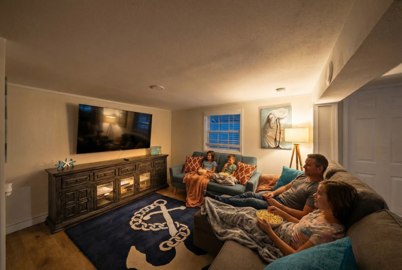 “Clean and cozy. Downstairs arcade room had plenty of large arcade games plus a huge tv and loads of couches to lounge on. Upstairs had a kitchen to cook in. Great spot for dropping a line. ”