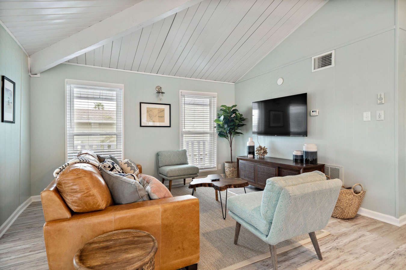 When you arrive at Bluewater Bungalow, the cheerful, exterior and swaying palm trees will instantly transport you into vacation mode. The main level great room is bright and beachy, with a soaring cathedral ceiling with painted shiplap detail. The kitchen has a peninsula bar with seating while a flexible passthrough space opens to allow access to the back porch living area. Through the sliding glass doors, a spacious, screened-in living space will be a popular spot for your whole crew. Overlooking the sparkling canal below, your family will love to spend time out here— dining, snacking, playing games, or watching tv.