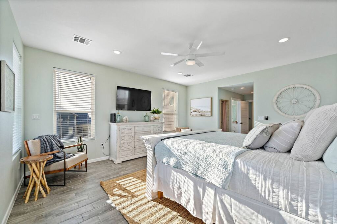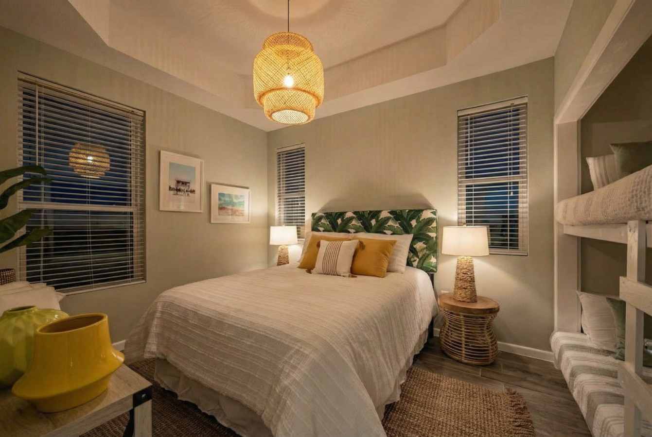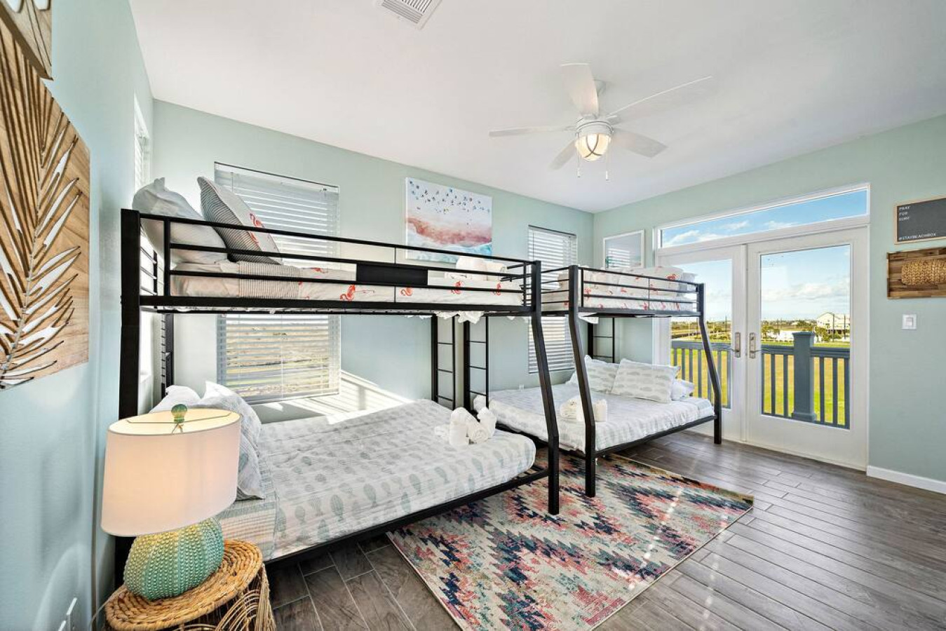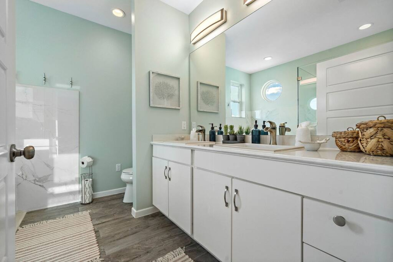 Upstairs, the grand master suite has a sumptuous king-size bed and a small sitting area. Glass doors flood the room with natural sunlight and lead out to the sun-kissed private balcony with views of the peaceful neighborhood and the ocean beyond. The master bathroom has a soaking tub and a step-in shower that are surrounded with slabs of gorgeous Carerra marble, and double vanity. A small room off the master suite has a triple stack of twin-size bunk beds. An additional bunk room on this floor has two full-over-queen size bunks, while another full bathroom with a step-in shower can be accessed from the hallway.