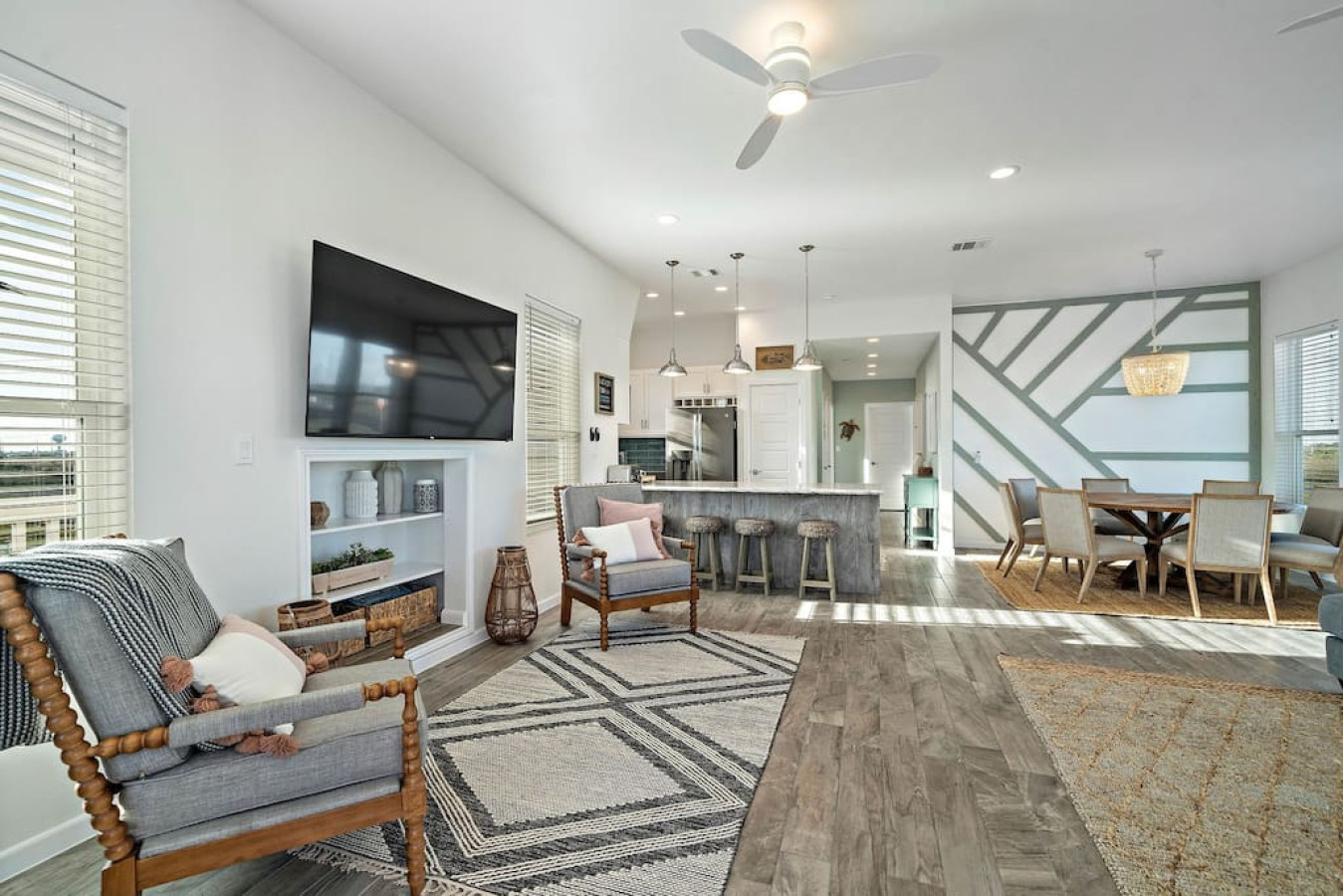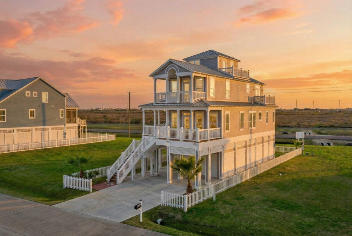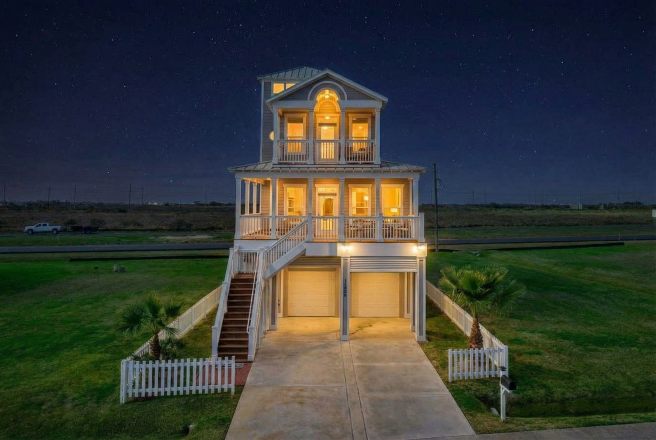 Effortlessly elegant, this three-story Beachside Village home has a chic, polished style and a picture-perfect, private location. With four breezy balconies, a barbeque area, an inviting open floor plan, a lush green lawn, and room for 18 people— this holiday home is also just steps away from the sandy beach. You’ll also be tucked safely into a private, gated community and be close to the Seawall and the Strand. Relax, recharge, and reconnect at this dazzling Texas Gulf Coast vacation home.