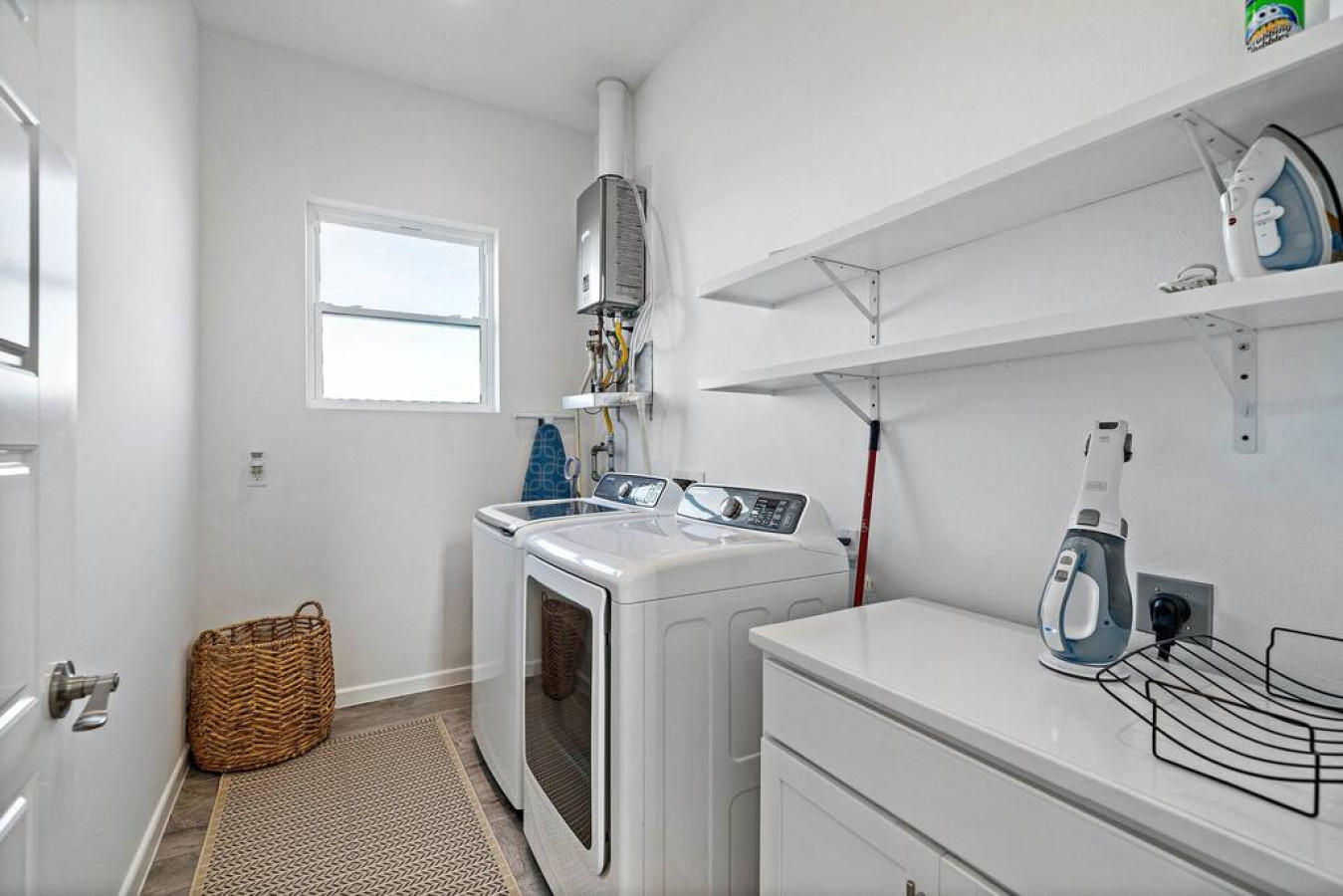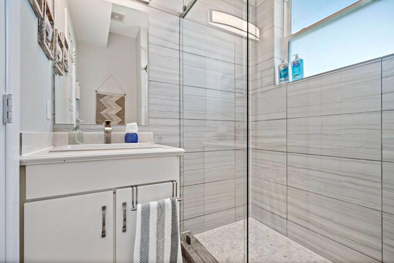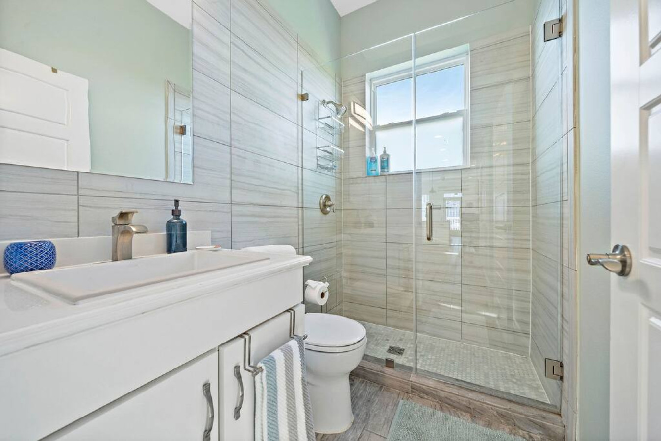 Down a short hallway are a laundry room, two bedrooms, and a full bathroom. The first bedroom on this floor has a queen-size bed with custom built-in twin-size bunk beds. The second bedroom has a king-size bed. The full bathroom can be accessed from the hallway and features a glass-enclosed, step-in shower with spa-like tile details.