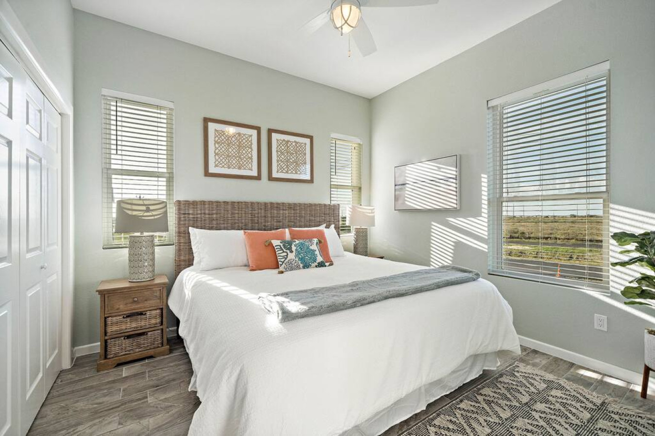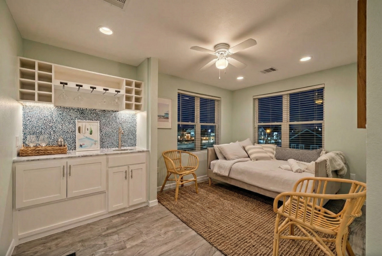 On the penthouse level, a private den space has a wet bar with a mosaic tile backsplash and a full-size daybed. The soaring balcony provides sweeping views of the Beachside Village neighborhood and the ocean. Relax at the pub table with a frosty cocktail and take in the magnificent view.
