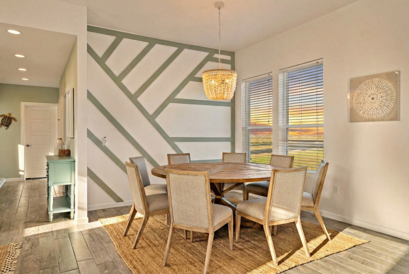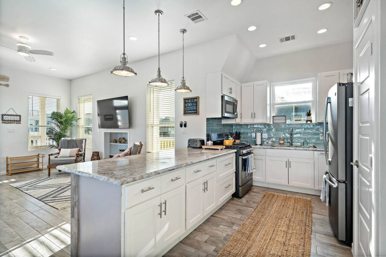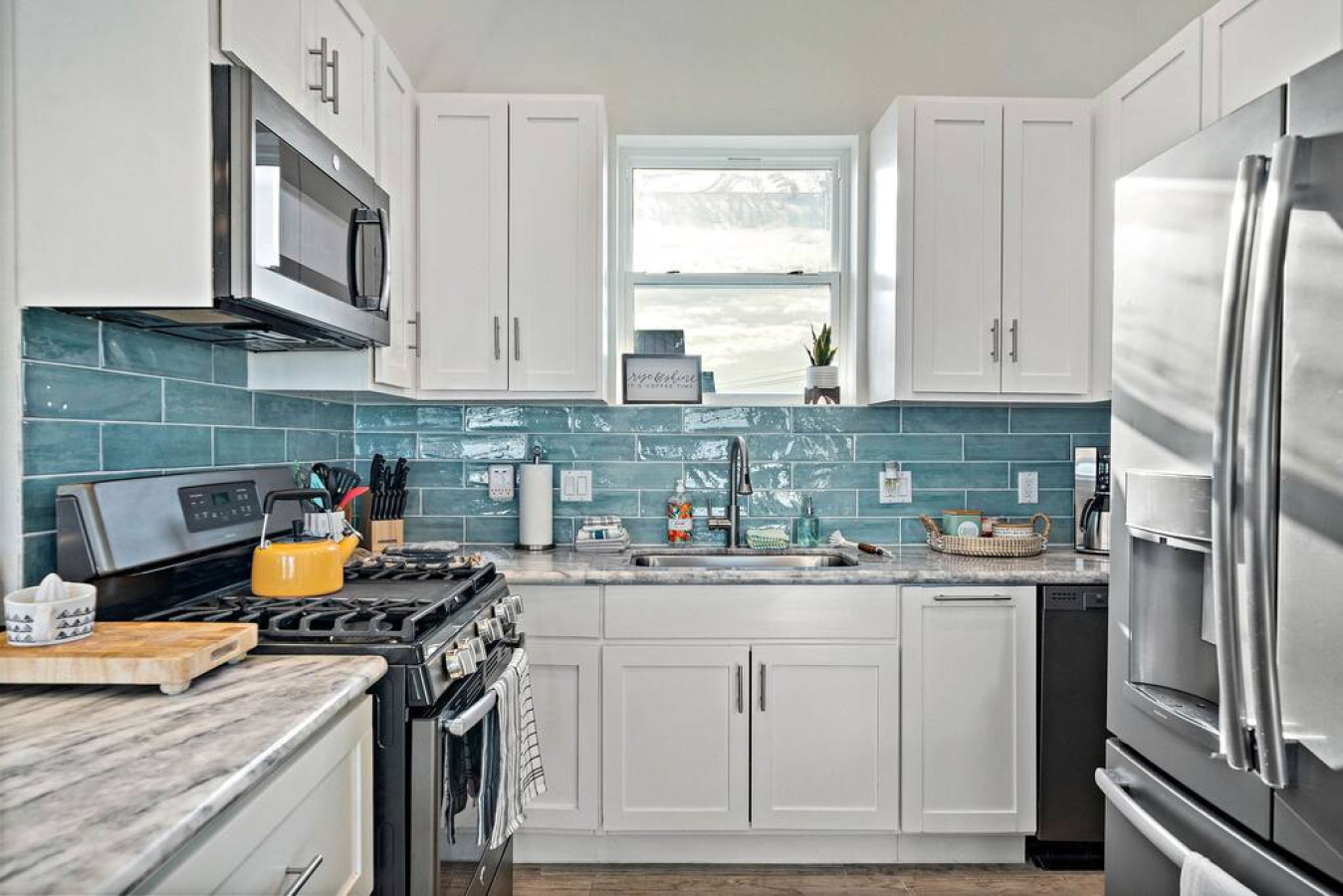 A peninsula island leads into the completely open and vibrant kitchen. A shimmering backsplash the color of sea glass compliments the white shaker cabinets and stainless steel appliances. The kitchen is fully equipped with everything you need— from brewing the morning coffee to preparing an intimate family dinner. Chic metal pendant lights illuminate the gleaming marble-topped workspaces.