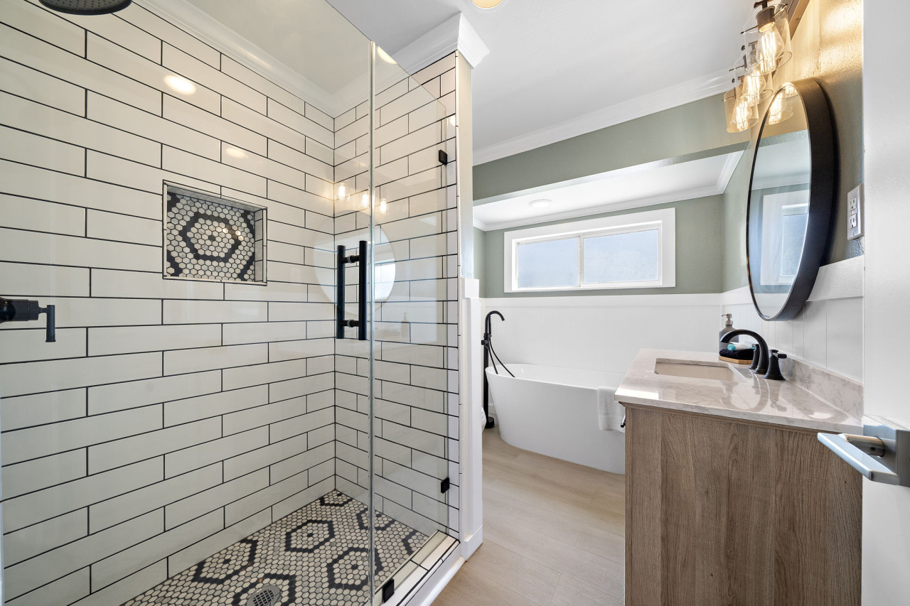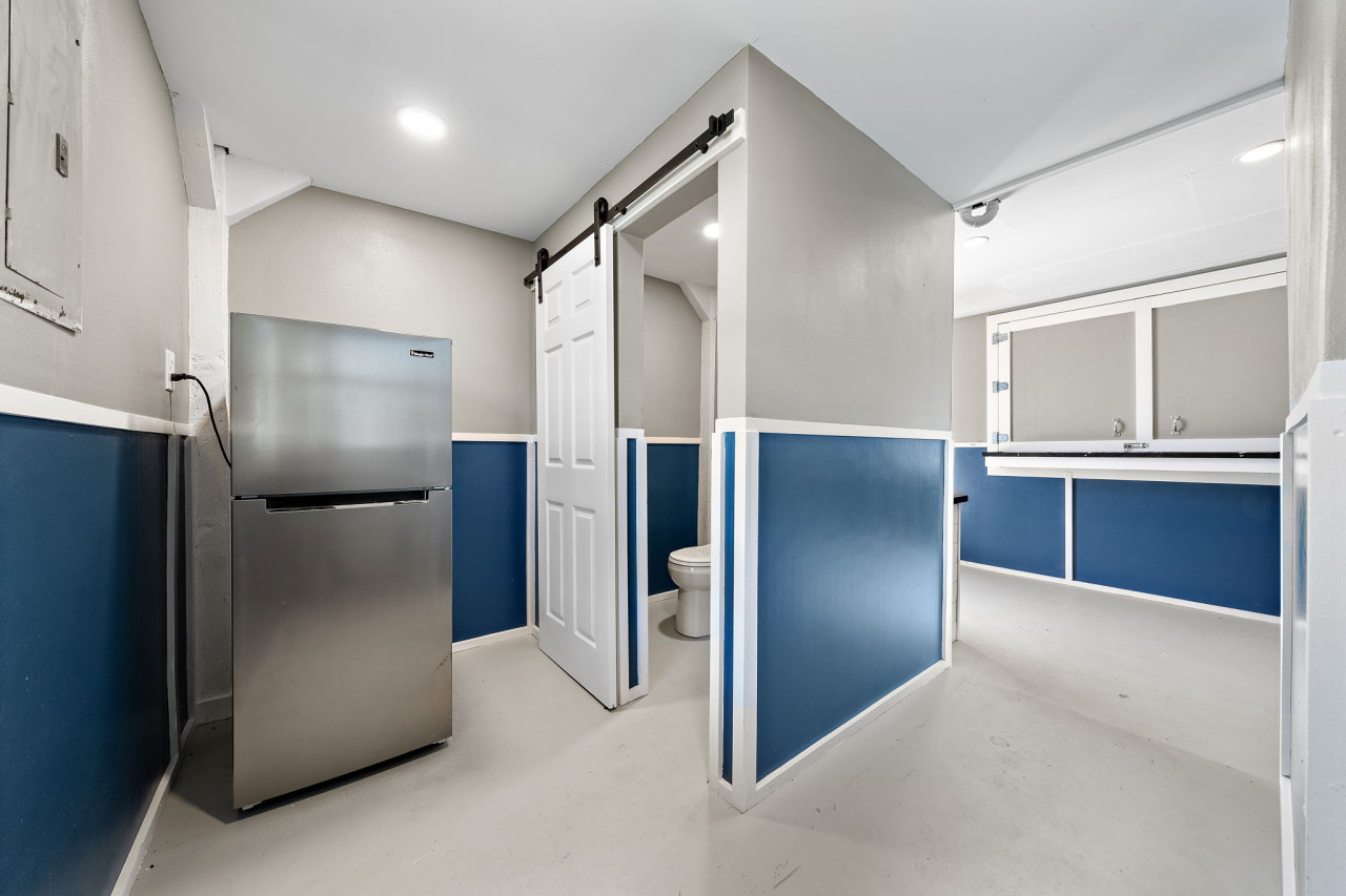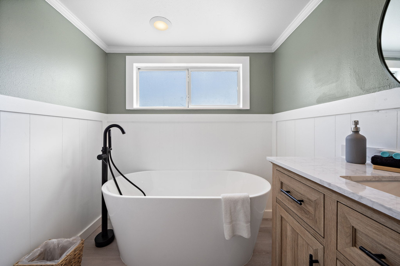 The second bedroom is a camp-like bunk room and is located off a short hallway. With two twin-over-twin bunks, plus another built-in twin-over-twin space, there’s room for six people in this room. Across the hallway, the master bedroom has a king-size bed and a full ensuite bathroom. Another full bathroom with a tiled step-in shower and a beautiful soaking tub is accessible from the hall.