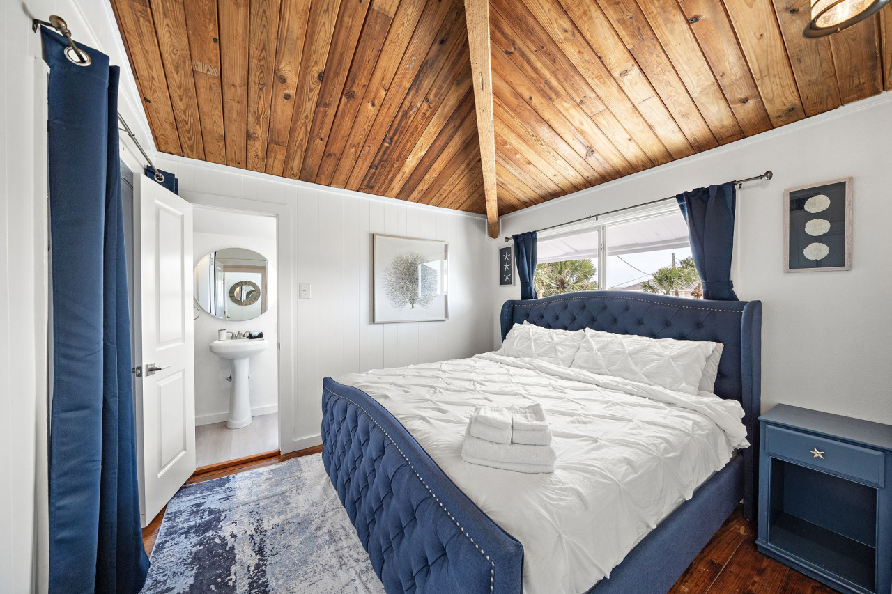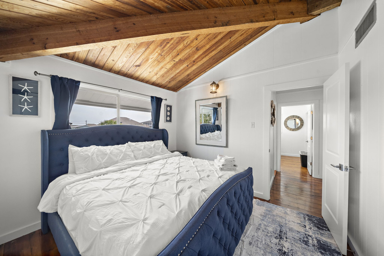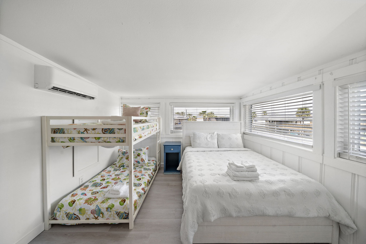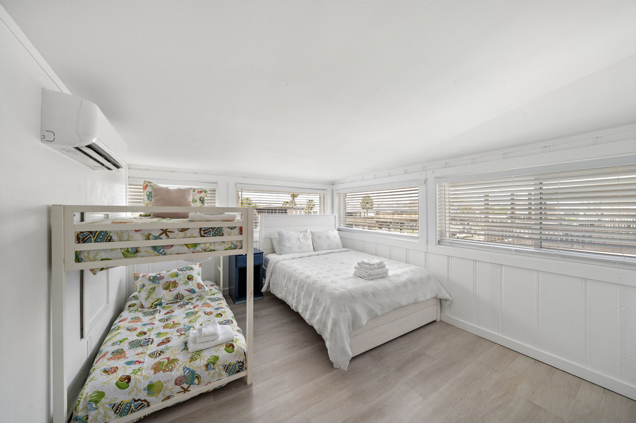 The first of three bedrooms is located just off the living area, allowing for sparkling views of the canal. This bedroom has a queen-size bed and a twin-over-twin size bunk. Lots of windows flood the room with bright, shimmering Texas sunshine.