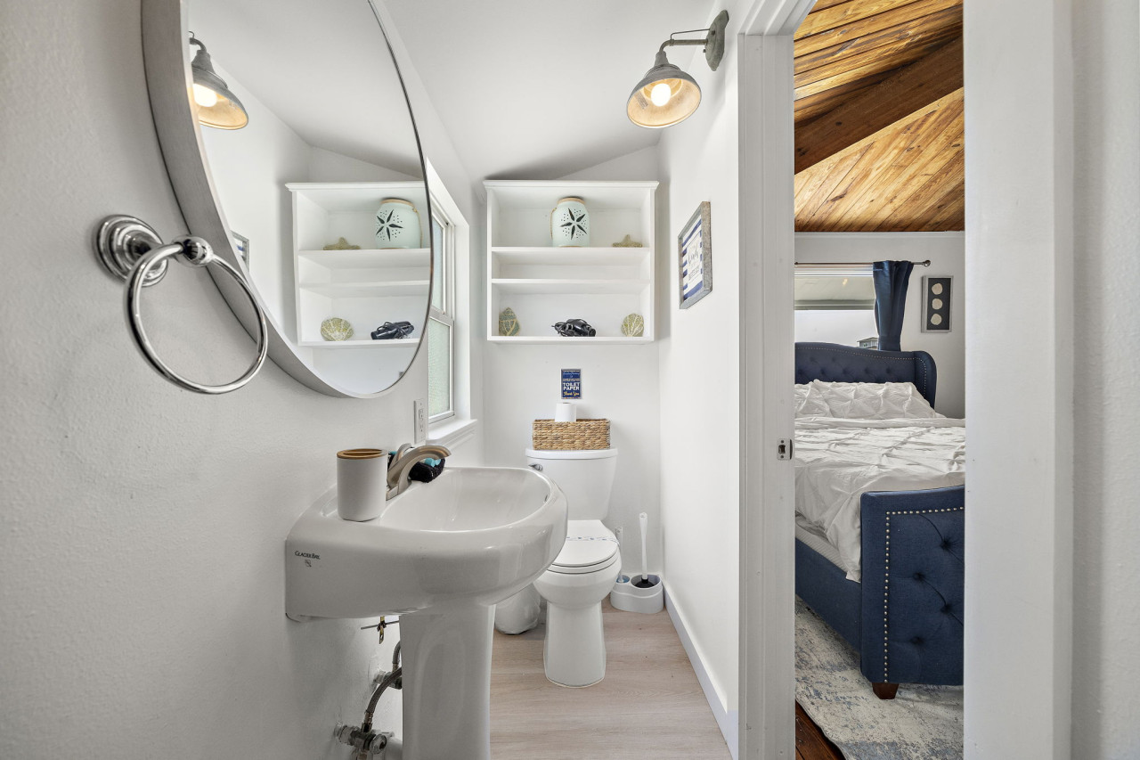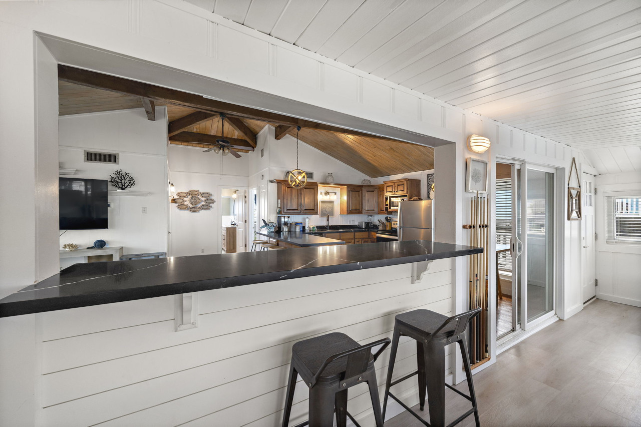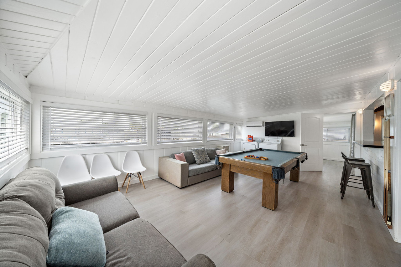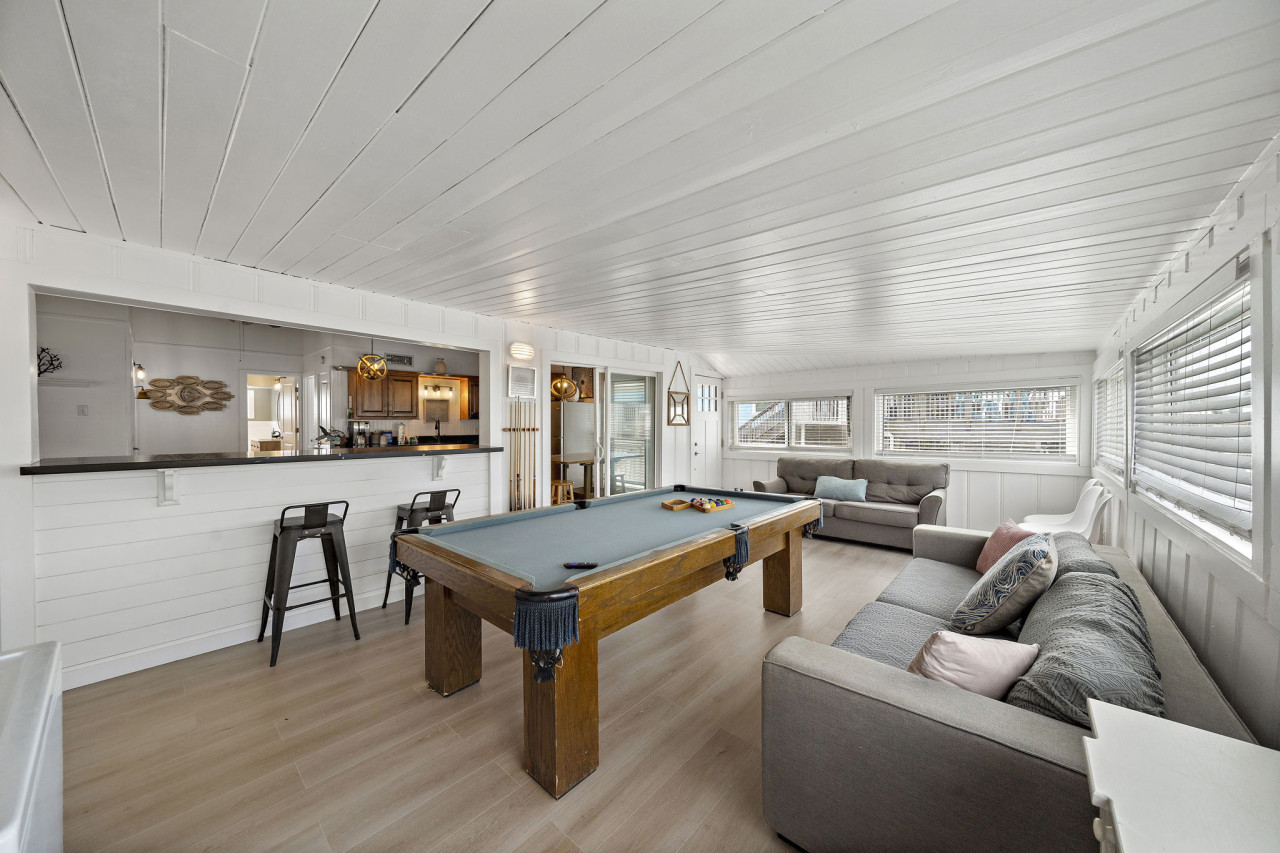 A pass-through bar has even more seating and leads into the spacious and bright game room. With a full-size pool table, a comfy futon, and sweeping views of the canal below, this is a family-favorite spot to unwind with a game or two— and maybe a friendly wager. A washer and dryer are located nearby.