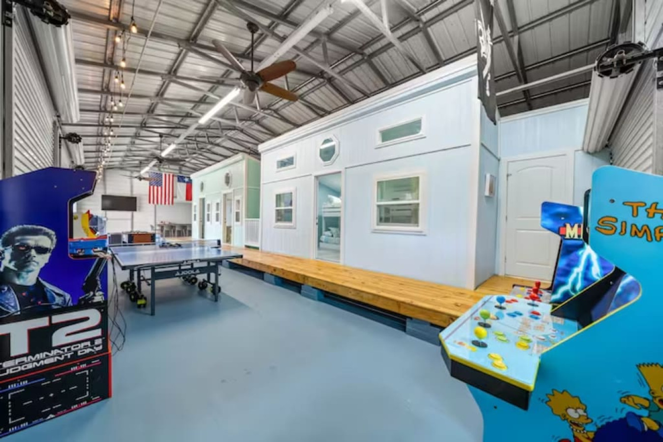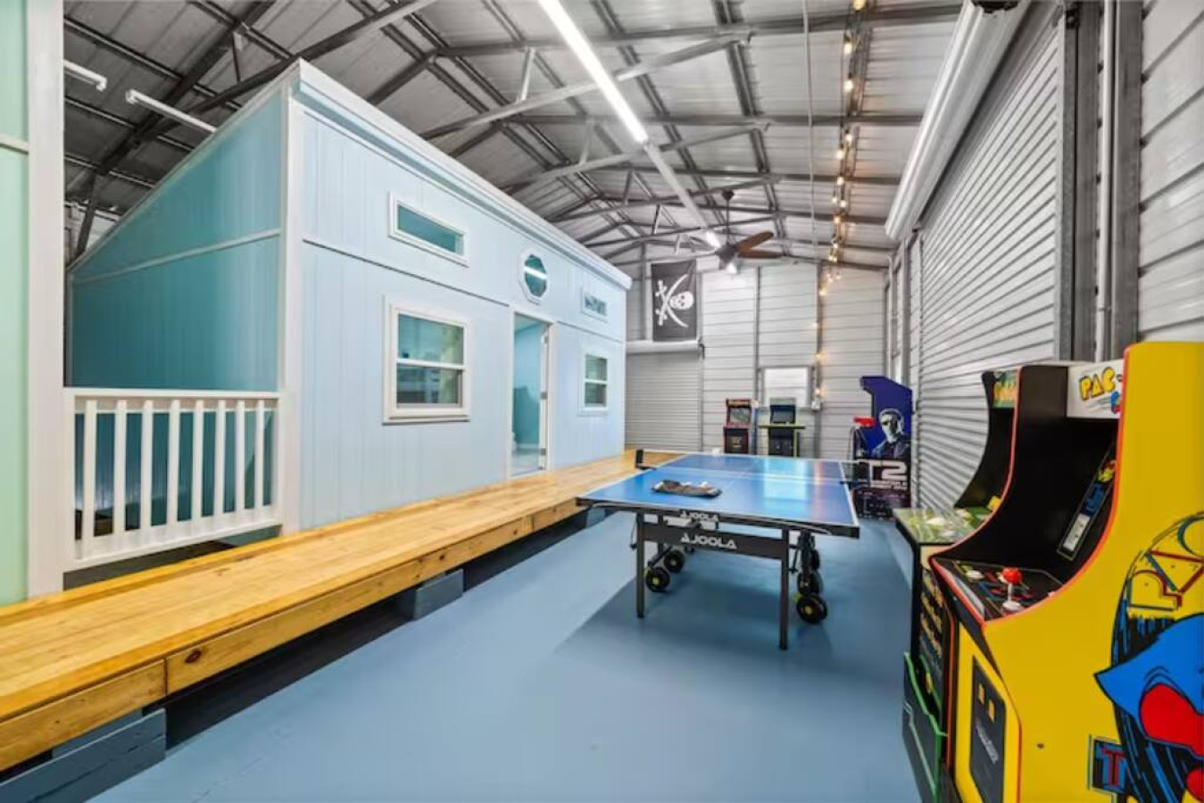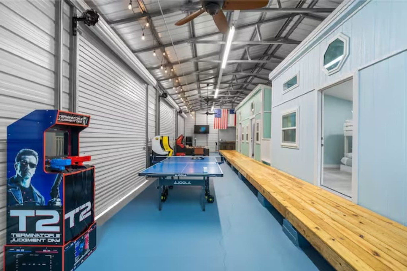 Head over to the incredible barn game room, where the fun truly begins! This expansive space features classic arcade games, a foosball table, a ping pong table, and a big-screen TV, providing endless entertainment options. Three additional bedrooms are cleverly tucked away within the barn in tiny-home style buildings, offering unique and cozy sleeping quarters. One room boasts double the bunk beds with two full-over-queen configurations, ideal for larger groups. The other two barn bedrooms each have comfortable king-size beds.
