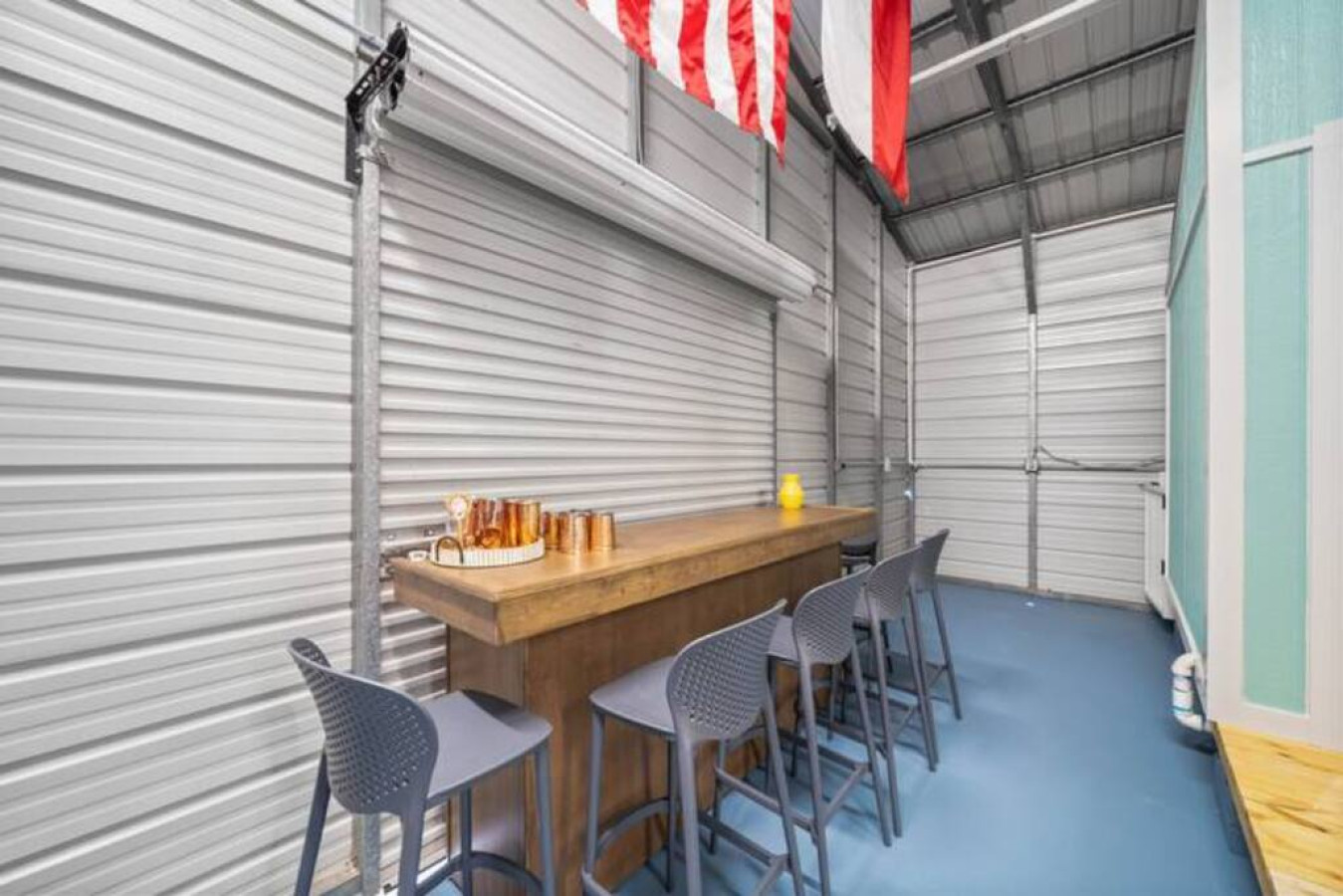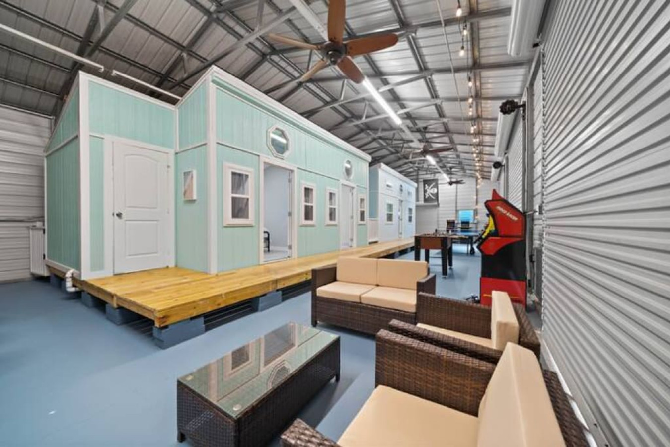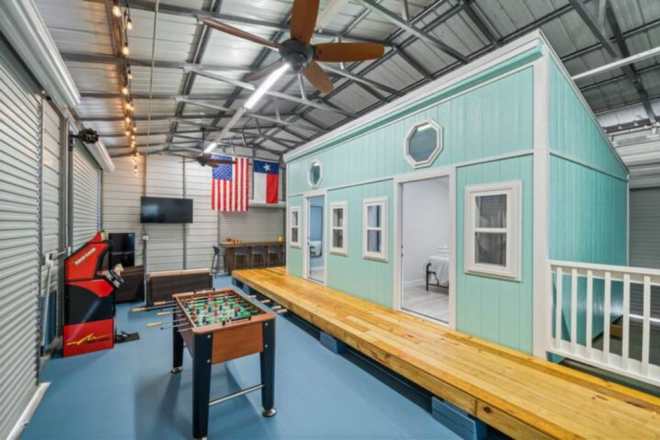 Head over to the incredible barn game room, where the fun truly begins! This expansive space features classic arcade games, a foosball table, a ping pong table, and a big-screen TV, providing endless entertainment options. Three additional bedrooms are cleverly tucked away within the barn in tiny-home style buildings, offering unique and cozy sleeping quarters. One room boasts double the bunk beds with two full-over-queen configurations, ideal for larger groups. The other two barn bedrooms each have comfortable king-size beds.