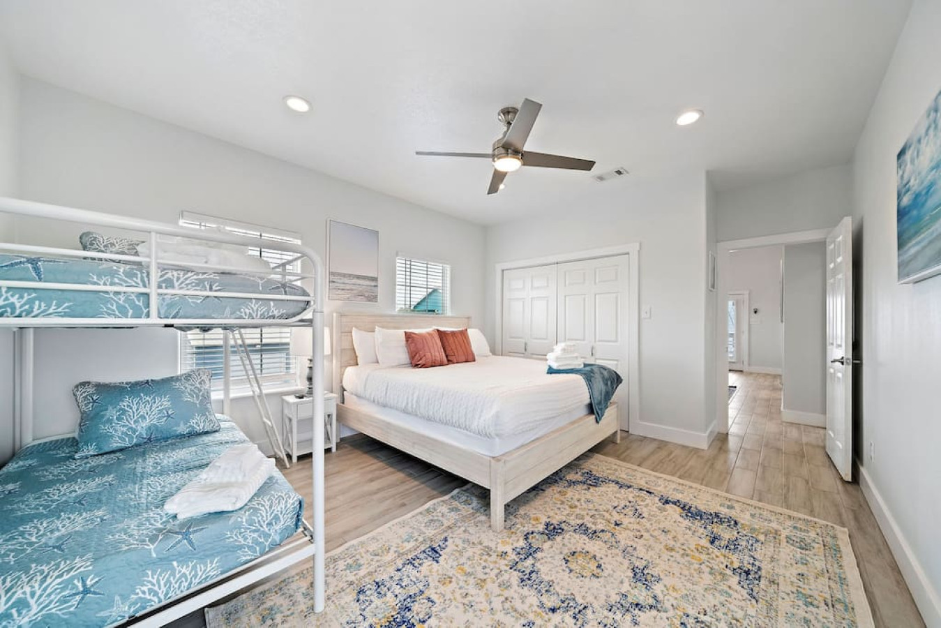 Upon entering, you’ll find a welcoming living room that opens up to a well-equipped kitchen with ample counter space for whipping up delicious meals. Two bedrooms with comfy sleeping arrangements are conveniently located in the main house. One features a king-size bed and a twin bunk bed, perfect for a family. The other offers a queen-size bed and a full-over-full bunk bed, providing additional sleeping options.