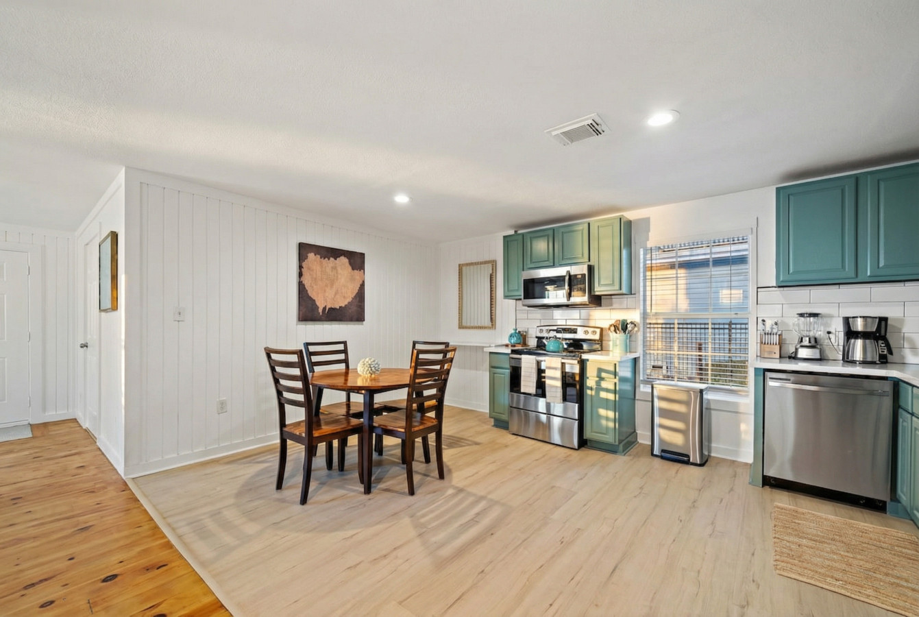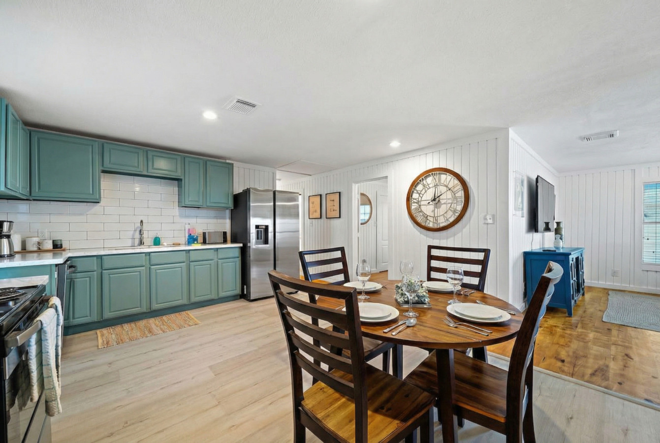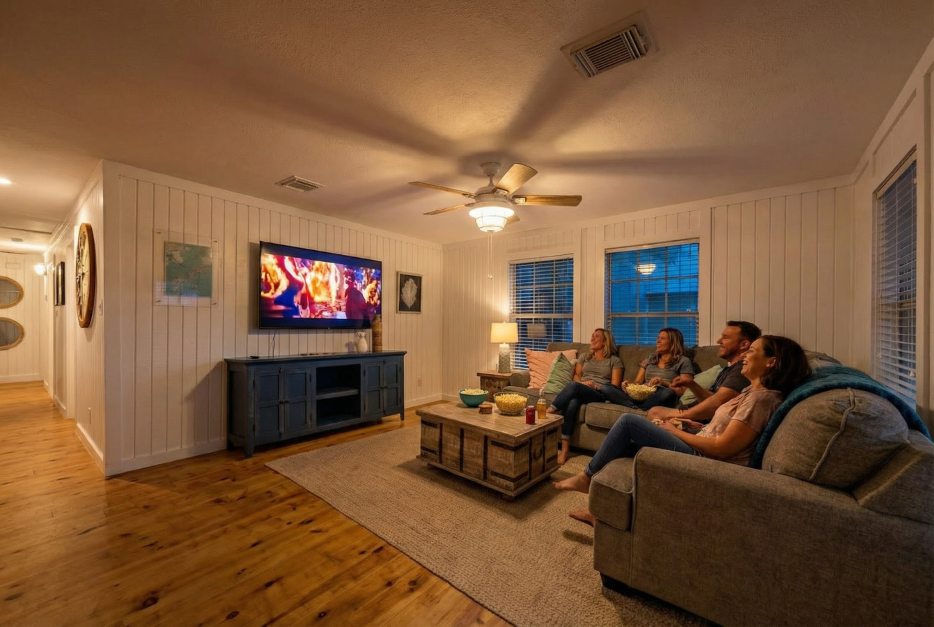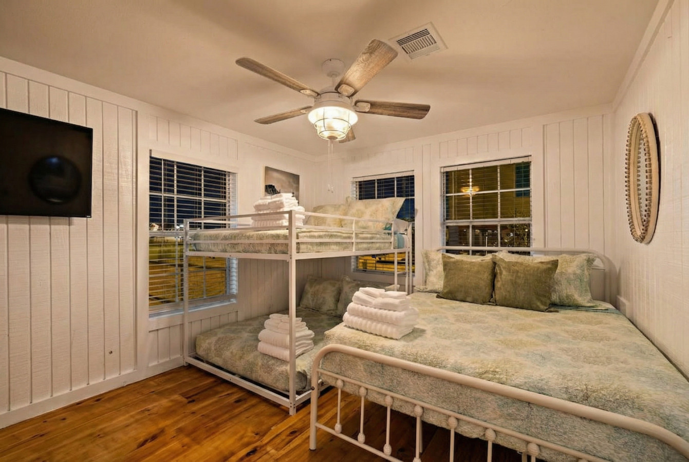 Whip up delicious meals in the fully-stocked kitchen, then gather for laughter and games in the spacious living area. Later, retreat to one of the four comfortable bedrooms, each offering a relaxing escape after exploring Galveston’s vibrant attractions. Two of these rooms have king-size beds, while the other two rooms each have one queen-size bed and a full over full bunk bed.