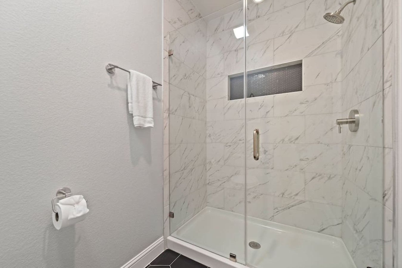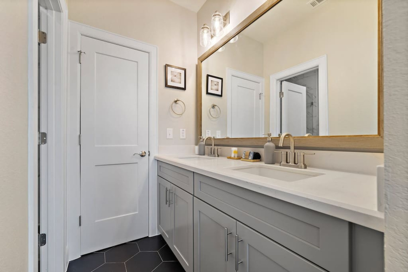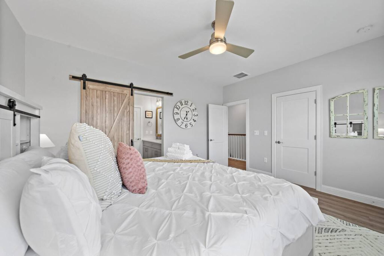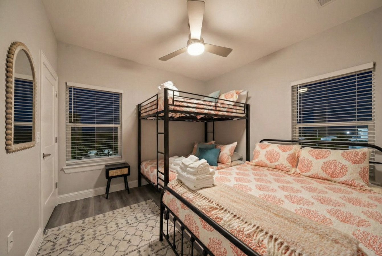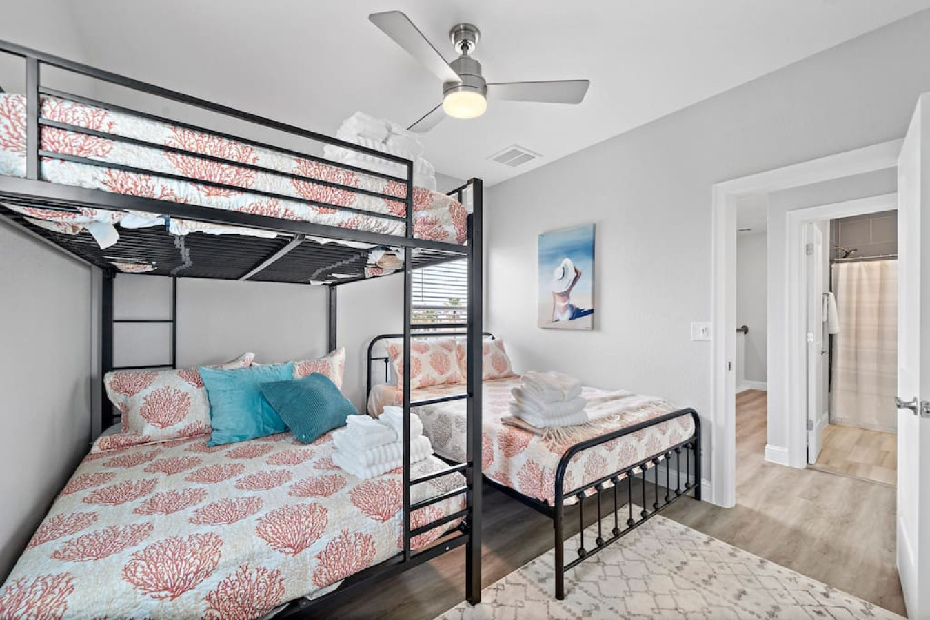 Venture upstairs to find your peaceful retreat. The primary bedroom has a plush king-size bed, a walk-in closet, and a bathroom with a luxurious shower and double sinks. Down the hall, two more inviting bedrooms await, one offering a queen-size bed and a full-over-full bunk bed, perfect for kids or extra guests. The third bedroom features a queen bed with twin bunk beds, providing ample sleeping space for the whole family.