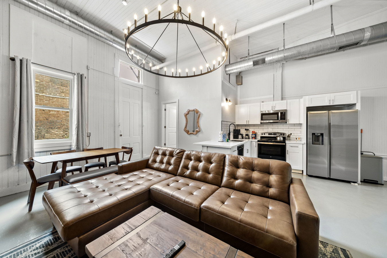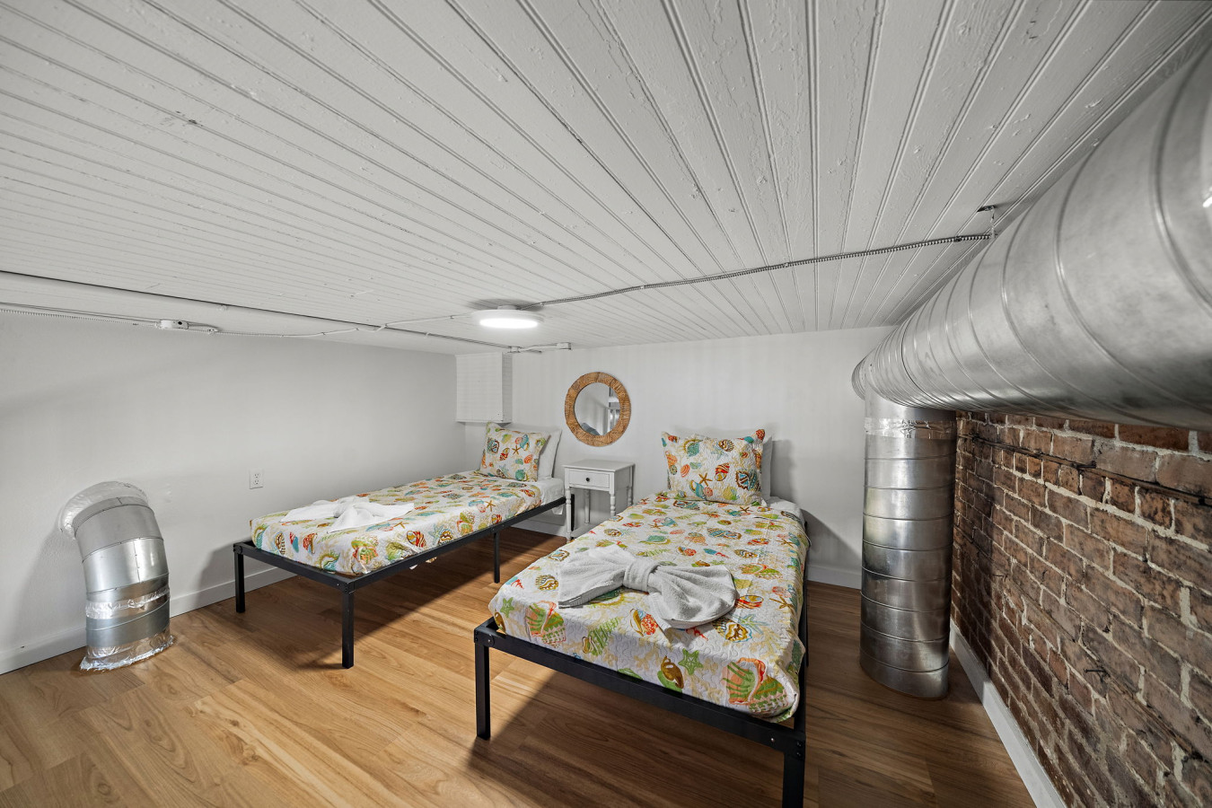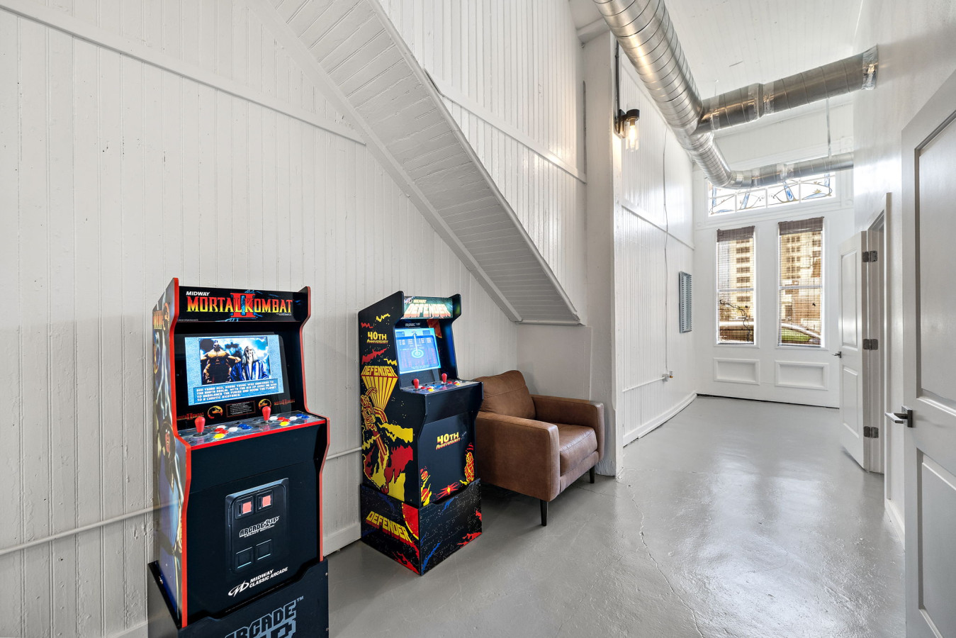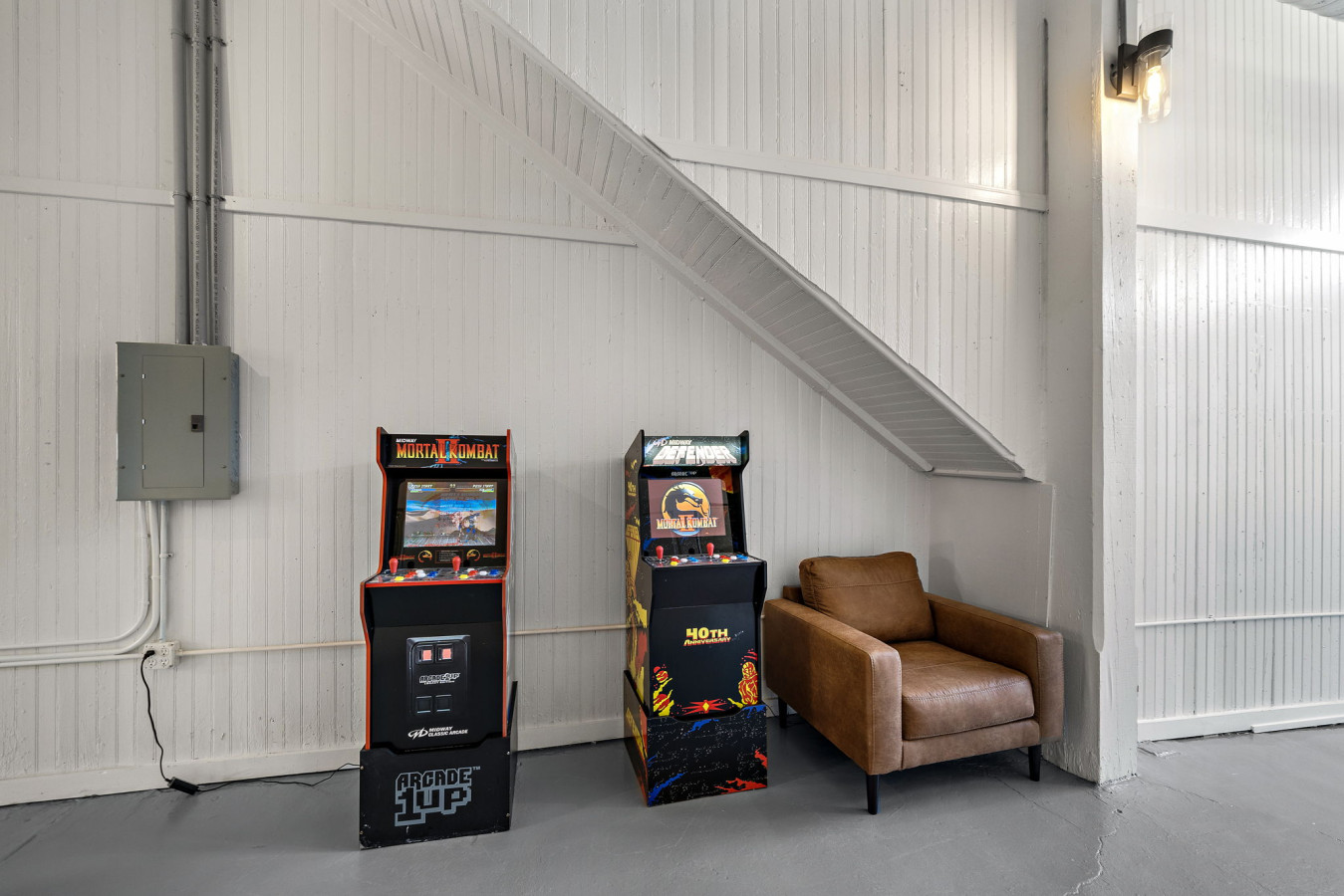 Located in the heart of Galveston’s Strand District, Cruzin Galveston is a spacious loft-style retreat designed for groups and families. As you enter you are greeted by a private entryway and hallway featuring arcade games and comfy seating. The hallway leads you into the heart of the loft, where a light-filled living area with a flat screen TV provides a perfect spot to unwind after a day of exploration. The adjoining galley kitchen is well-equipped for whipping up meals.