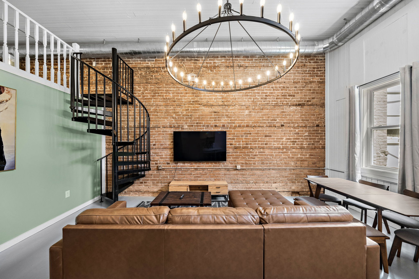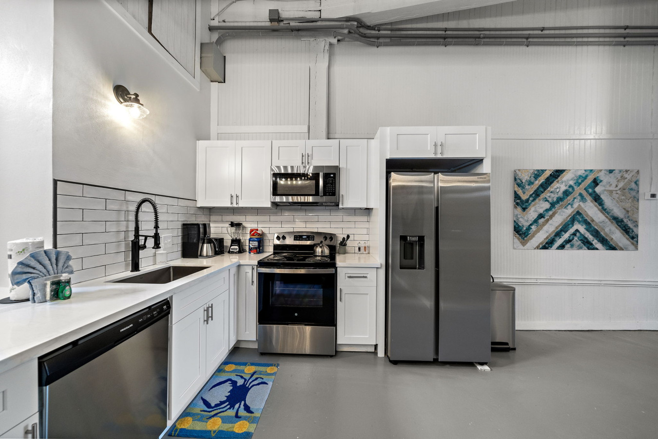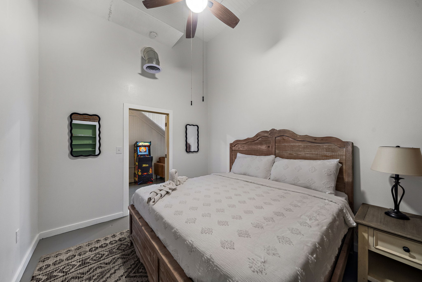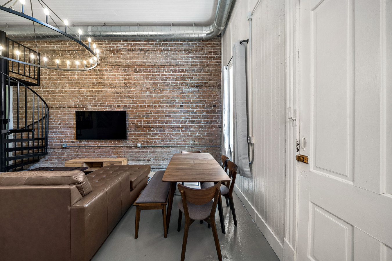 Located in the heart of Galveston’s Strand District, Cruzin Galveston is a spacious loft-style retreat designed for groups and families. As you enter you are greeted by a private entryway and hallway featuring arcade games and comfy seating. The hallway leads you into the heart of the loft, where a light-filled living area with a flat screen TV provides a perfect spot to unwind after a day of exploration. The adjoining galley kitchen is well-equipped for whipping up meals.