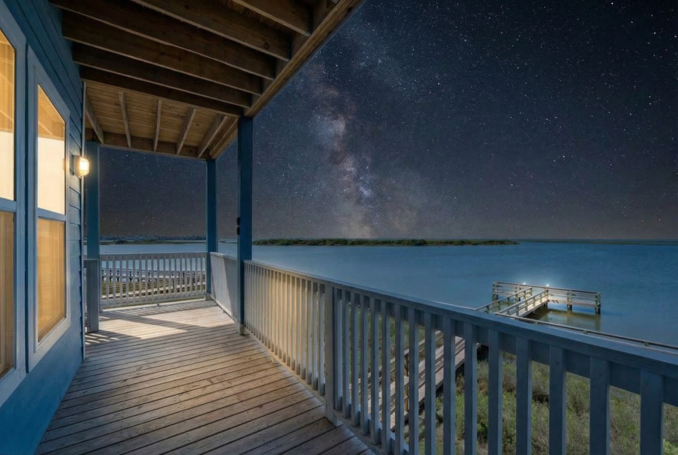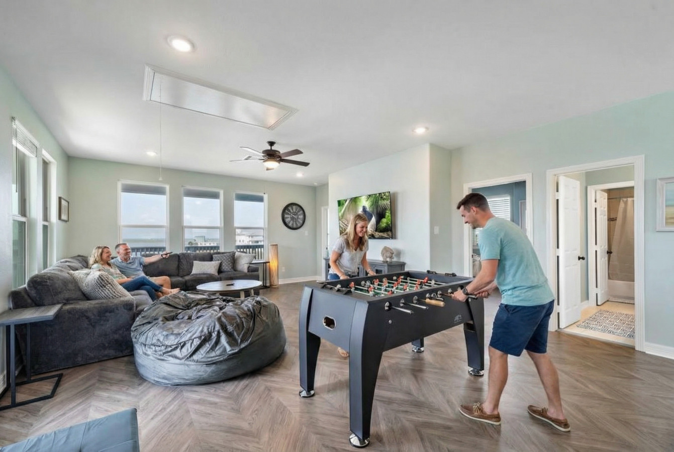 Breathtaking sunrises, tranquil bay views, and unforgettable Texas Gulf Coast memories are waiting for you at Deja Blue. Located in one of Galveston’s premier West End communities, this sprawling stilt home has room for the whole gang— and then some. With 4 bedrooms, 2 living areas, 2 covered decks, a game room, a barbeque patio, a short drive to the beach, and private access to the best fishing pier in the area, your family will love to spend a little time at Deja Blue.
