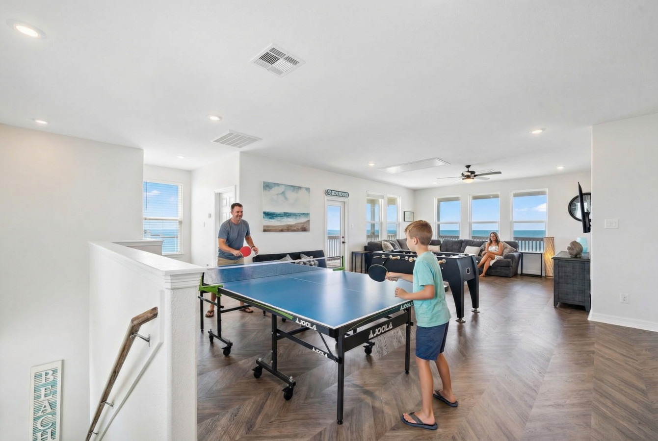 “We really enjoyed our time at the house! The layout was perfect for our group (two families plus grandparents). The kids loved the foosball and ping pong tables. I saw other reviewers had issues with the Wi-Fi. We couldn’t find one of the networks but Beach Box was responsive and got us connected to another network that worked great! The private pier was awesome for fishing. Our boys caught catfish, stingrays, blue crabs, and a redfish! I would trade not being on the beach for a safe, private pier where the kids could run around anytime, and Bermuda Beach was just a 5-minute drive. The house wasn’t super well-equipped but we were still able to cook some good meals in the house. The cleaning company did a decent job, but the floors and carpets need a good cleaning and some of the linens had hair. Truly, we loved this house and our family had a great time! We’d love to come back!”