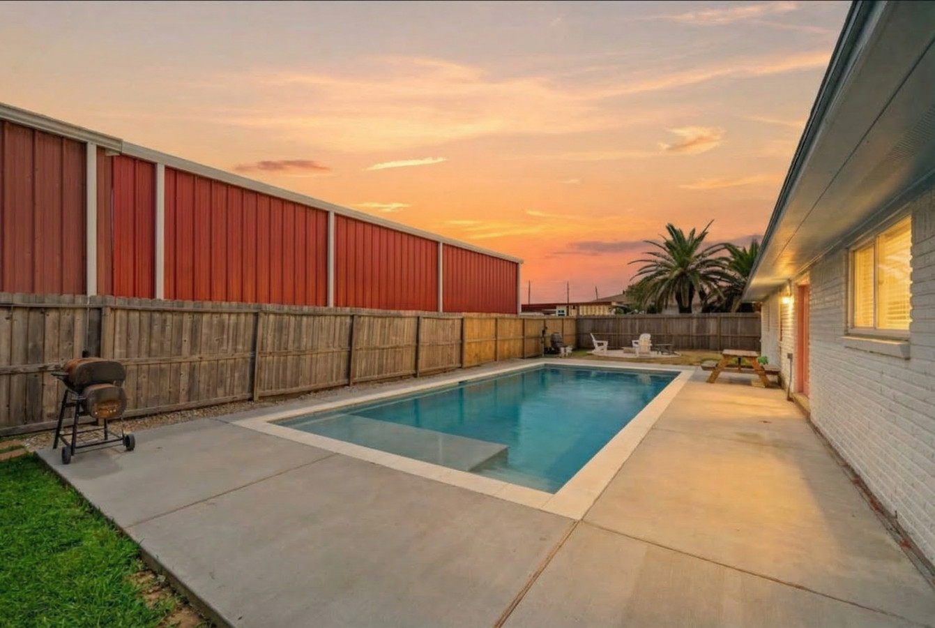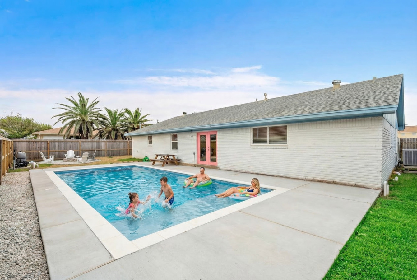 This 5 bedroom, 3 bath house is perfect for your family getaway to Galveston Island! Just down the street from Galveston Island Brewery and only 1 block from the Seawall, the location can’t be beat. Imagine spending evenings gathered around the fire pit in the backyard, roasting marshmallows, while behind it all stretches a sparkling large pool, perfect for cooling off on those hot Texas days. The kids will love the bunk room that has arcade games, foosball, and a TV!