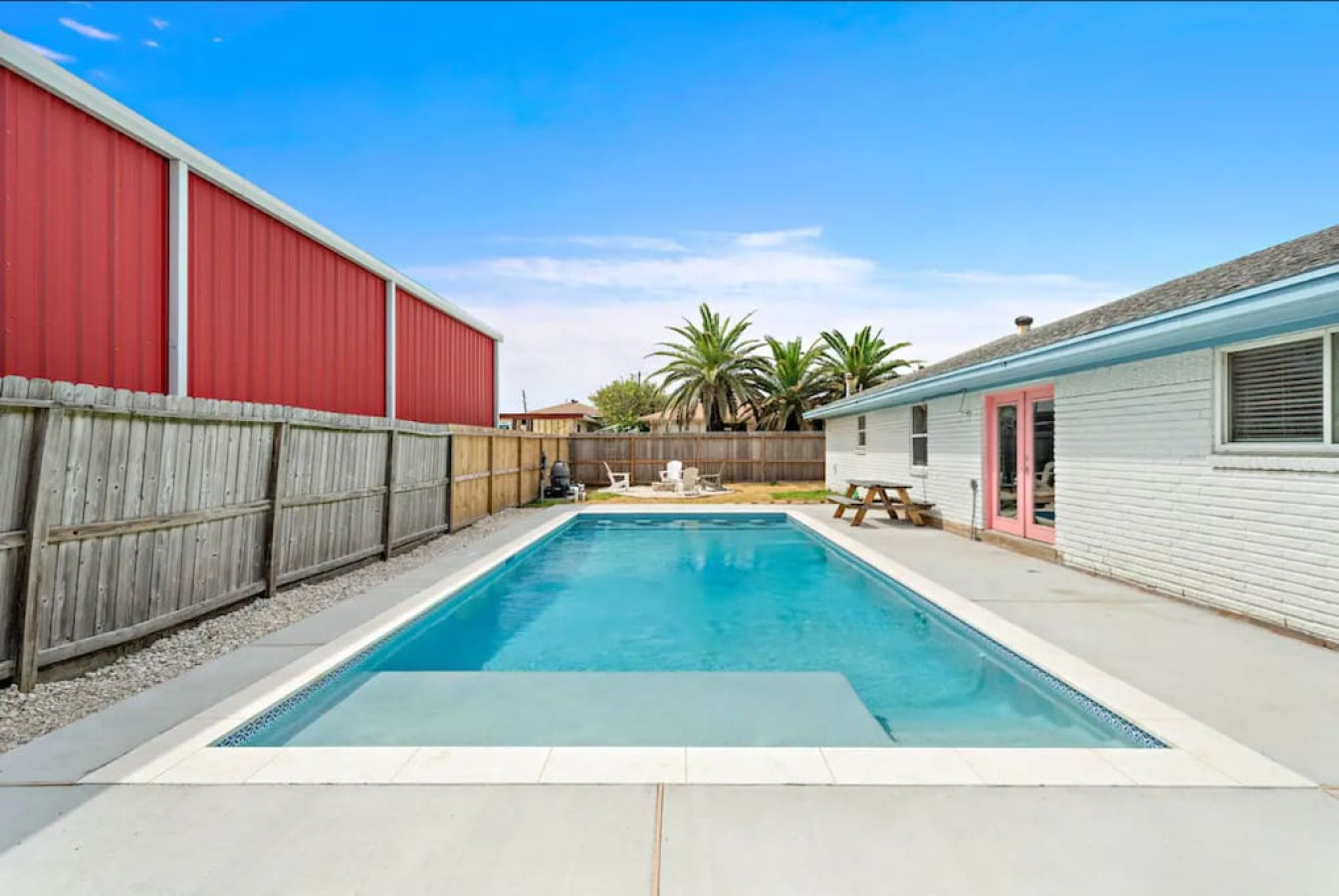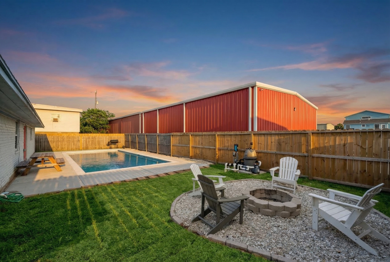Step outside, and you’ll be delighted by a large swimming pool, perfect for cooling off on hot summer days. A cozy fire pit with seating surrounds the pool, creating an inviting space for evening gatherings and relaxation.