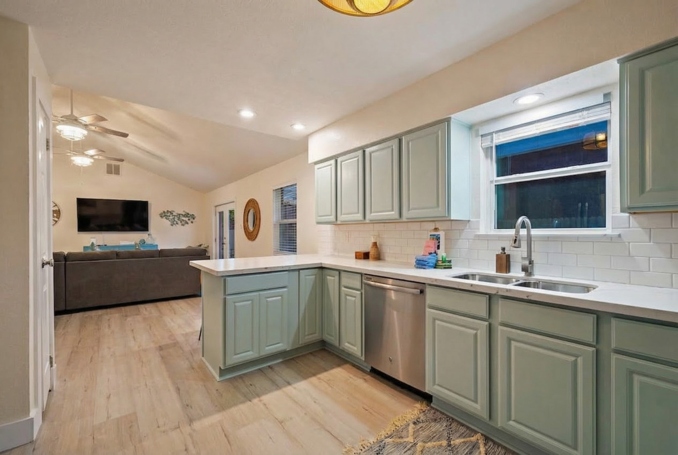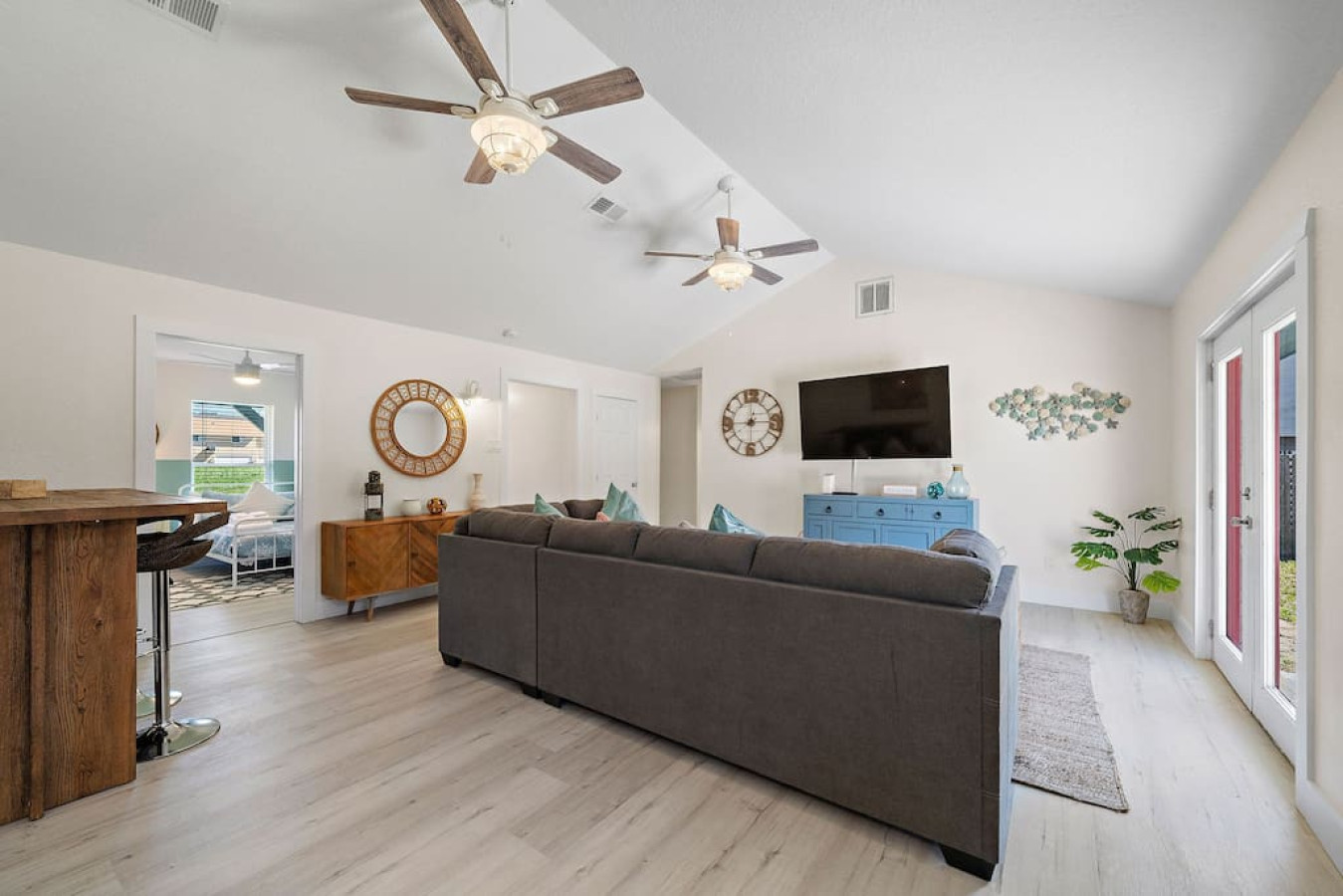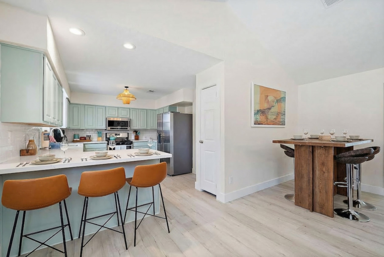 As you step into the home, you’ll be greeted by a spacious living room featuring a comfortable sectional sofa and a flat-screen TV. Adjacent to the living room is a well-equipped kitchen with a breakfast bar for dining. This kitchen has everything you need to prepare and enjoy delicious meals.