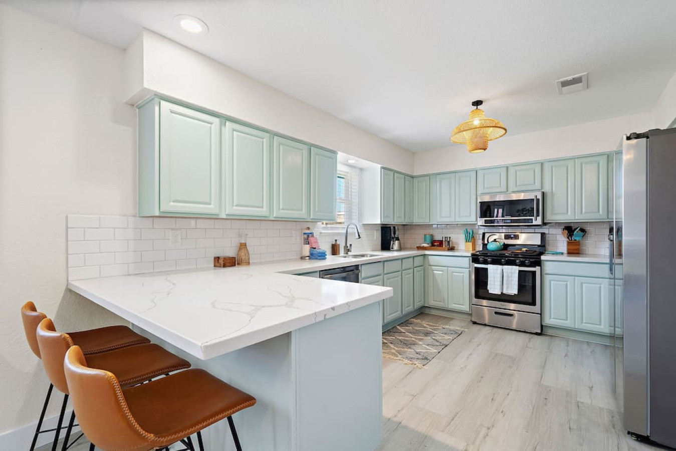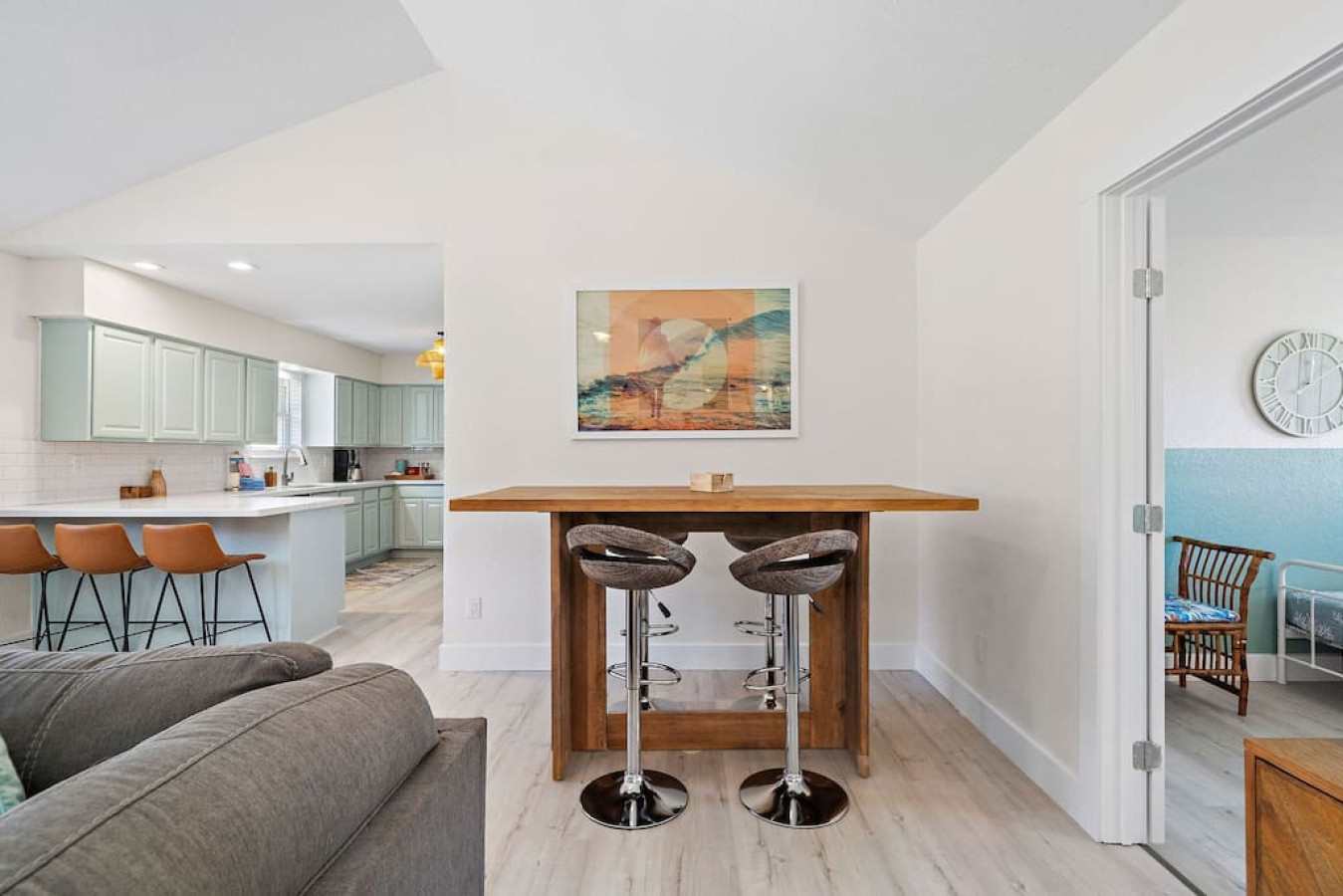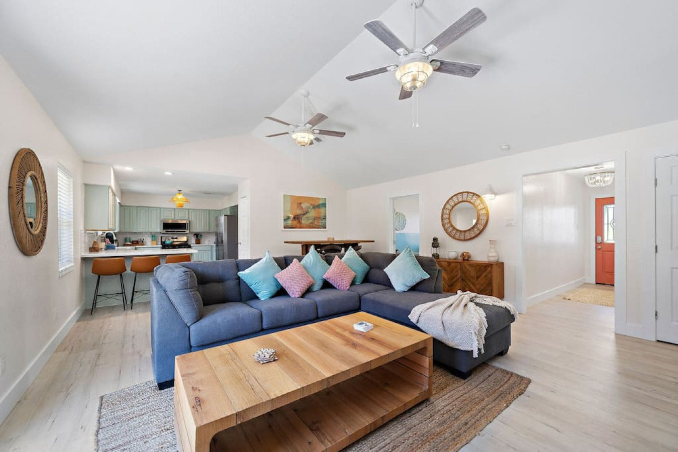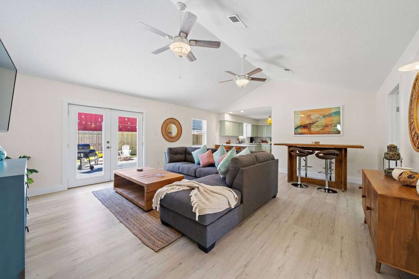 As you step into the home, you’ll be greeted by a spacious living room featuring a comfortable sectional sofa and a flat-screen TV. Adjacent to the living room is a well-equipped kitchen with a breakfast bar for dining. This kitchen has everything you need to prepare and enjoy delicious meals.