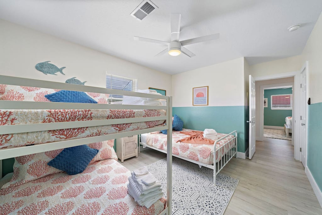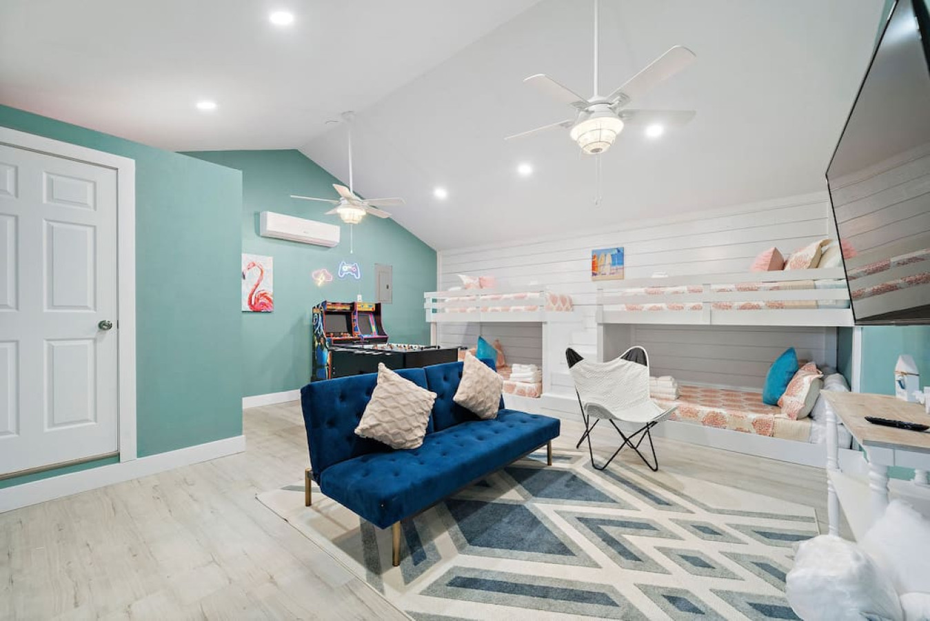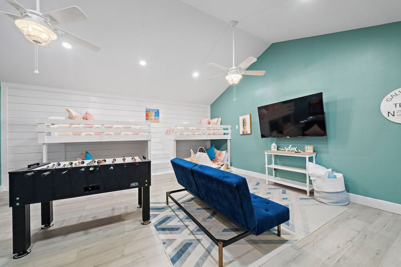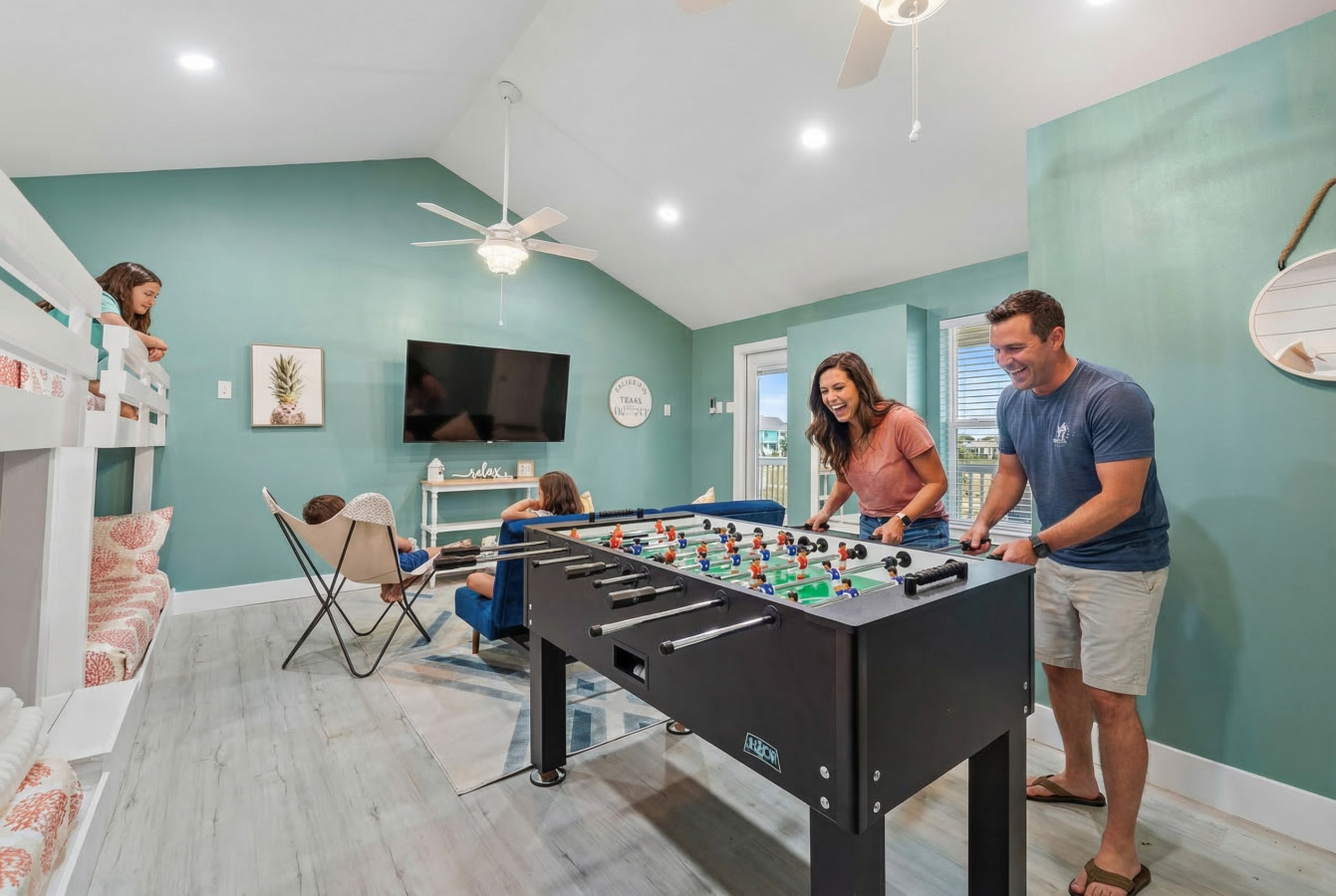 Continuing down the hallway, you’ll find three more bedrooms. One boasts another king-sized bed, offering ample space and comfort. Another room is furnished with two queen-sized beds, accommodating larger groups. And for the ultimate entertainment experience, the bunk room features two full-over-full bunk beds, a TV, a foosball table, and arcade games, making it a favorite spot for kids and adults alike.