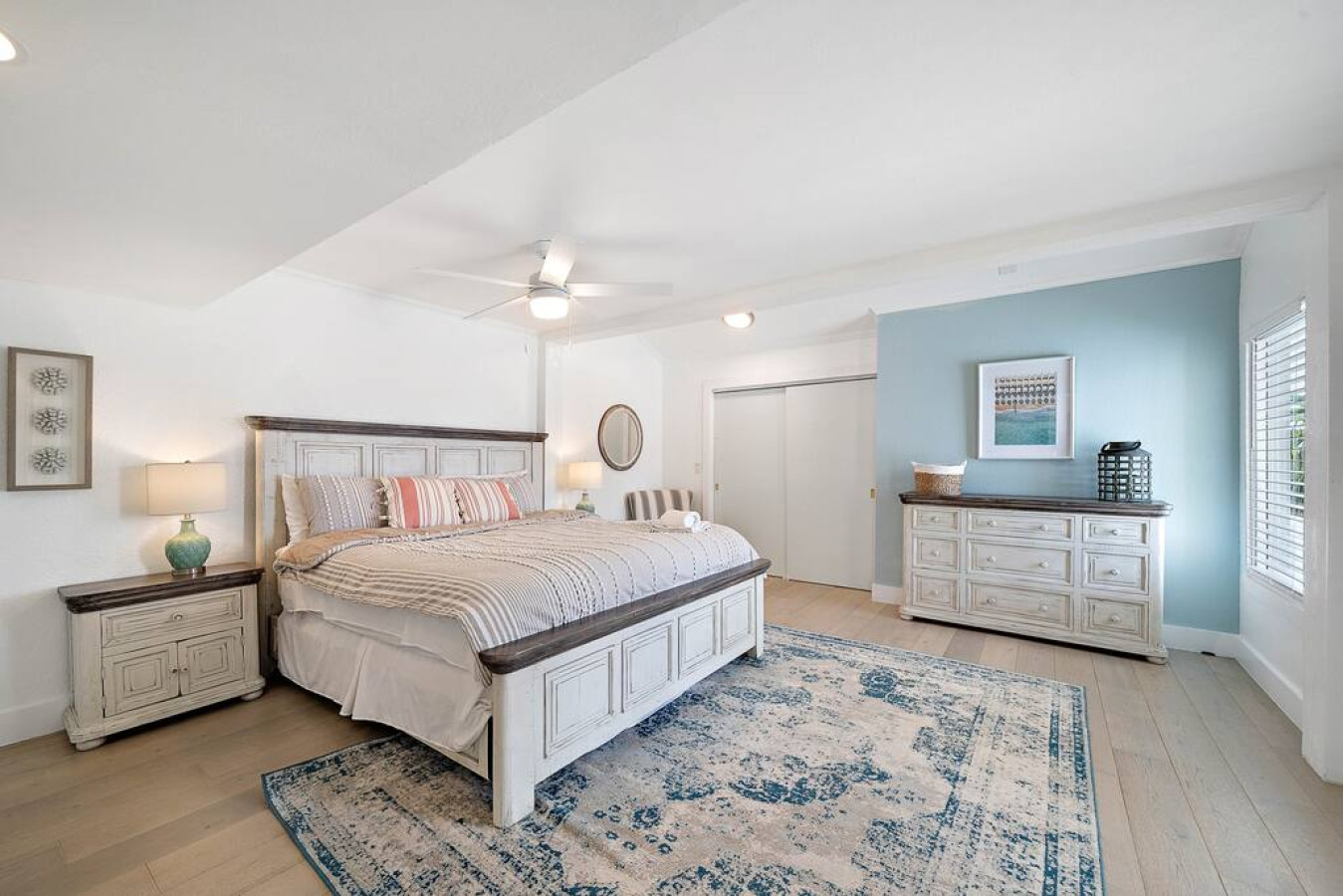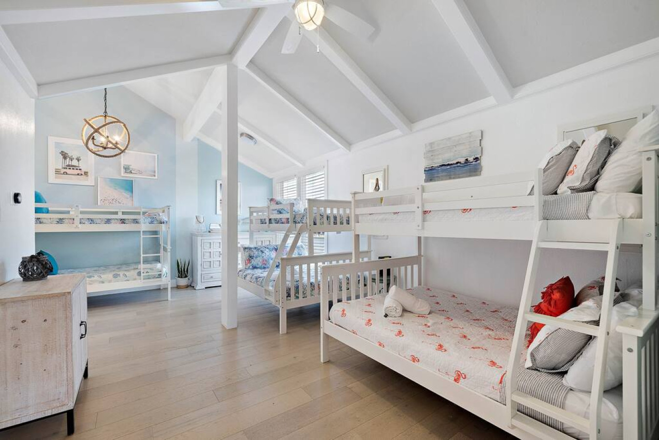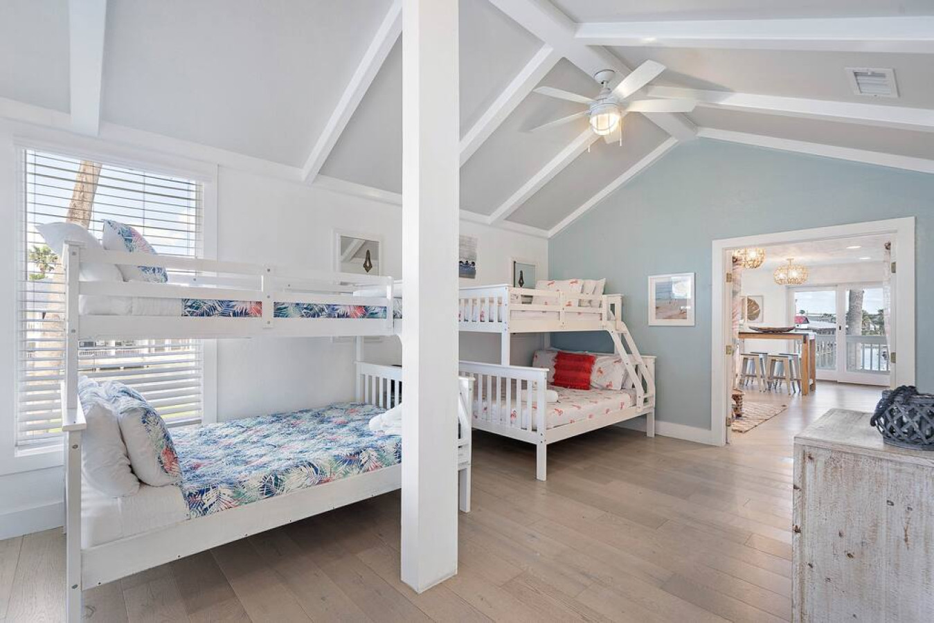 French doors open to a versatile bunk room with one twin bunk bed and two twin-over-full bunk beds, ideal for kids or additional guests. Two other bedrooms on the main floor offer comfortable king-size beds and calming canal views. The private penthouse suite on the third floor provides a luxurious escape. A sumptuous king-size bed, seating area, and private balcony with panoramic views create a tranquil atmosphere. The ensuite bathroom features a spacious walk-in shower and a separate soaking tub, perfect for relaxation after a day at the beach.