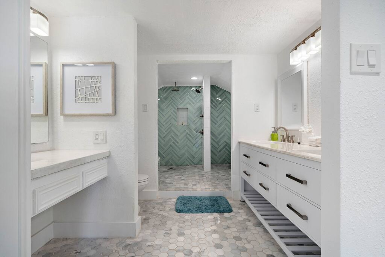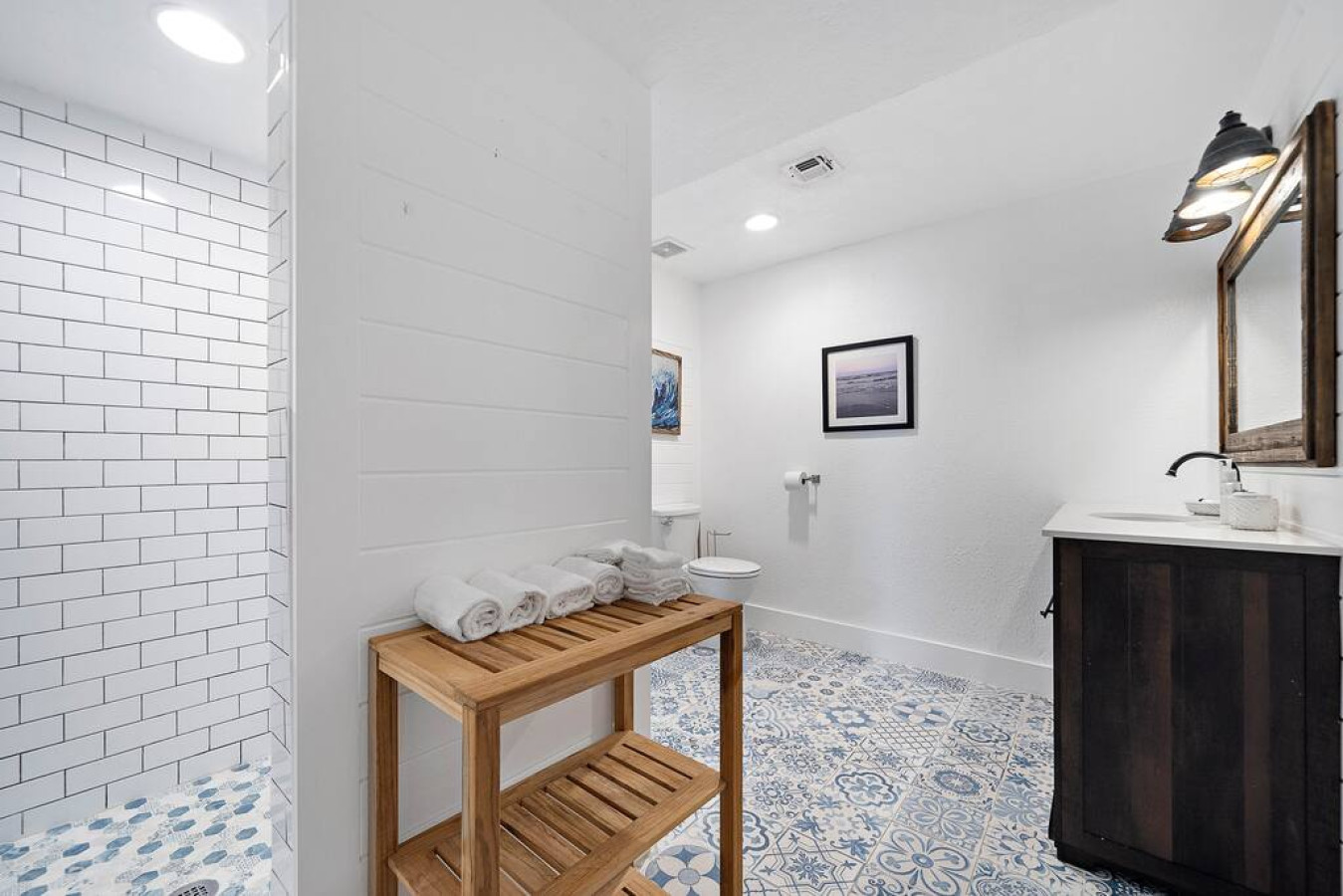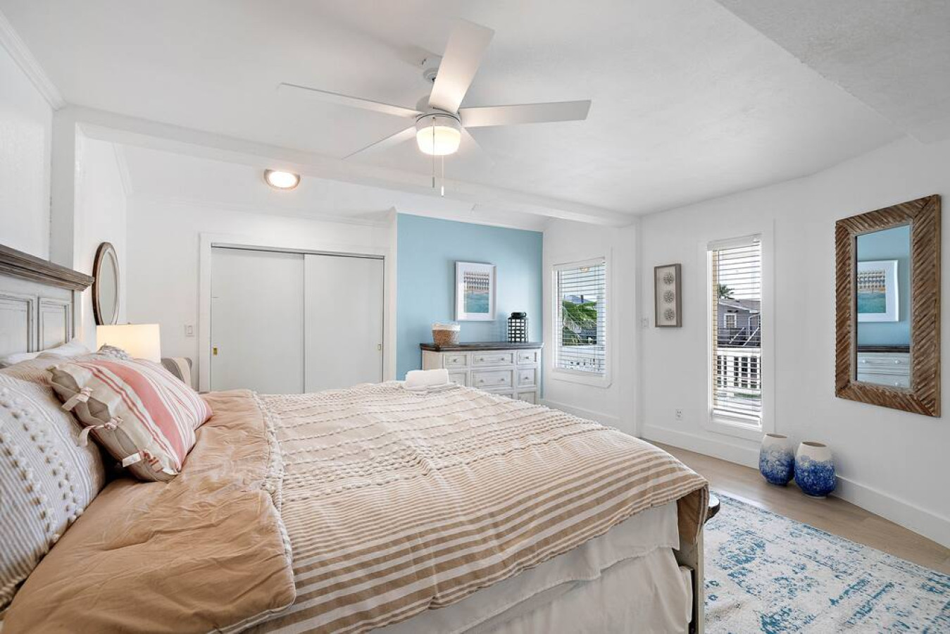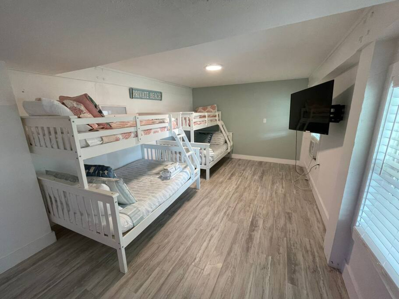 French doors open to a versatile bunk room with one twin bunk bed and two twin-over-full bunk beds, ideal for kids or additional guests. Two other bedrooms on the main floor offer comfortable king-size beds and calming canal views. The private penthouse suite on the third floor provides a luxurious escape. A sumptuous king-size bed, seating area, and private balcony with panoramic views create a tranquil atmosphere. The ensuite bathroom features a spacious walk-in shower and a separate soaking tub, perfect for relaxation after a day at the beach.