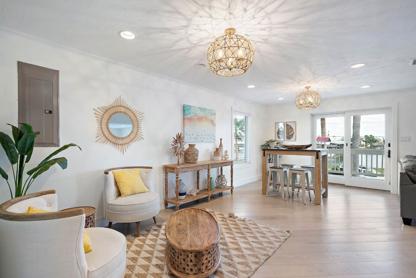 The main living area boasts a spacious layout with a large sectional sofa perfect for movie nights or game nights. A mounted flat-screen TV provides entertainment, while a separate seating area with armchairs and a high-top table offers additional space to relax or enjoy board games. Glass doors lead out to a sunny deck overlooking the canal, creating a seamless flow between indoor and outdoor living. The bright and modern kitchen is well-equipped for preparing delicious meals. Ample storage and counter space make cooking a breeze, while a peninsula bar with seating allows for casual meals or social gatherings.