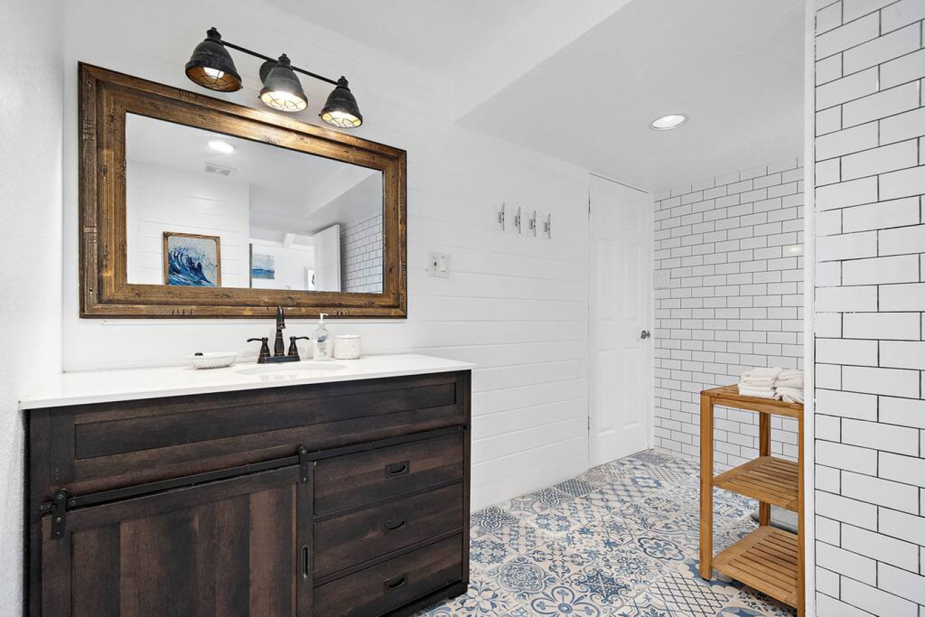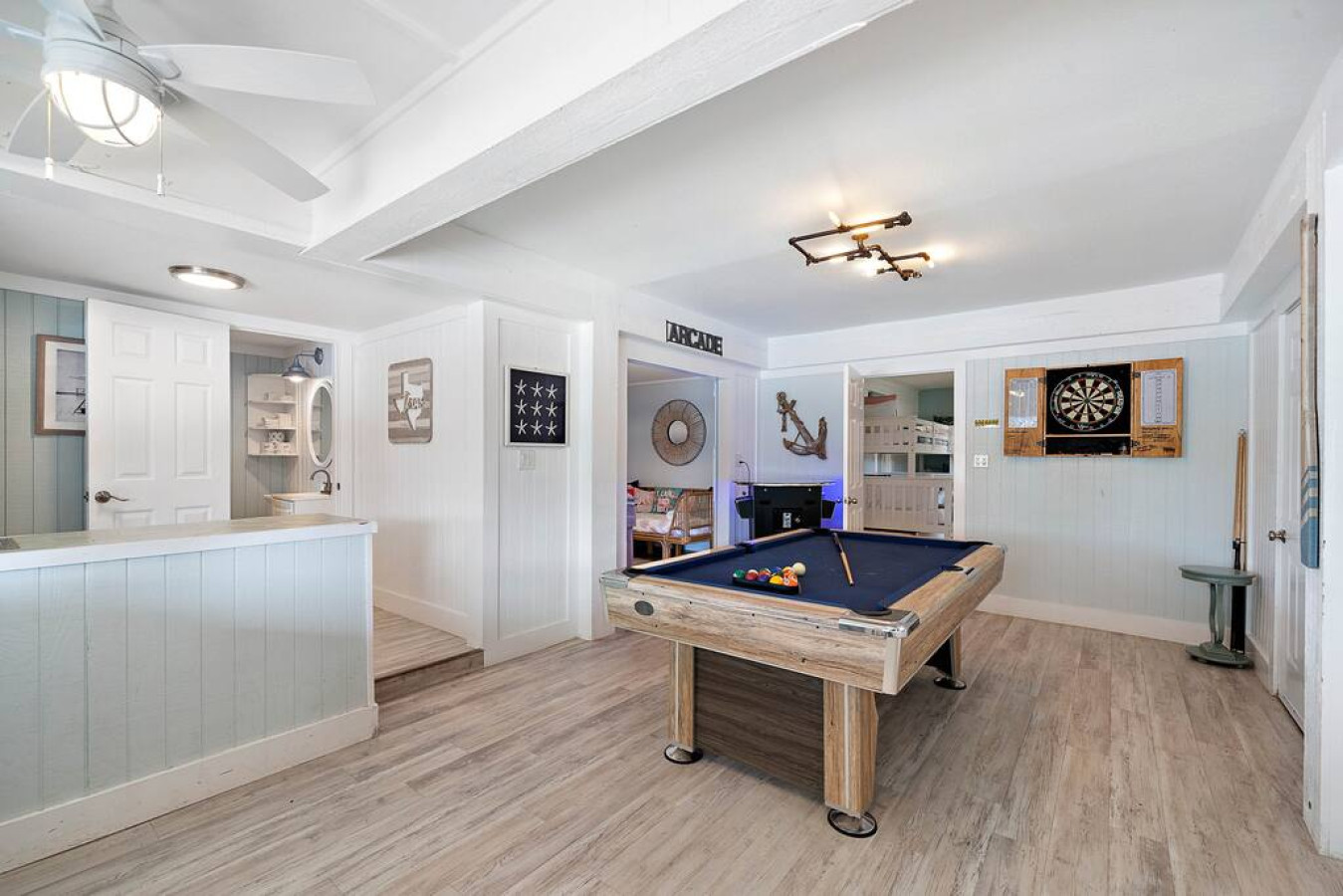 The ground floor offers a separate living space with a twin daybed, perfect for extended families or multi-generational groups. A kitchenette provides basic amenities, while a pass-through window connects to the outdoor barbecue area. The highlight of this floor is the epic game room, featuring arcade games, a pool table, and a dartboard, ensuring endless entertainment for all ages. A bedroom with two twin-over-full bunks and another full bathroom complete this self-contained space.