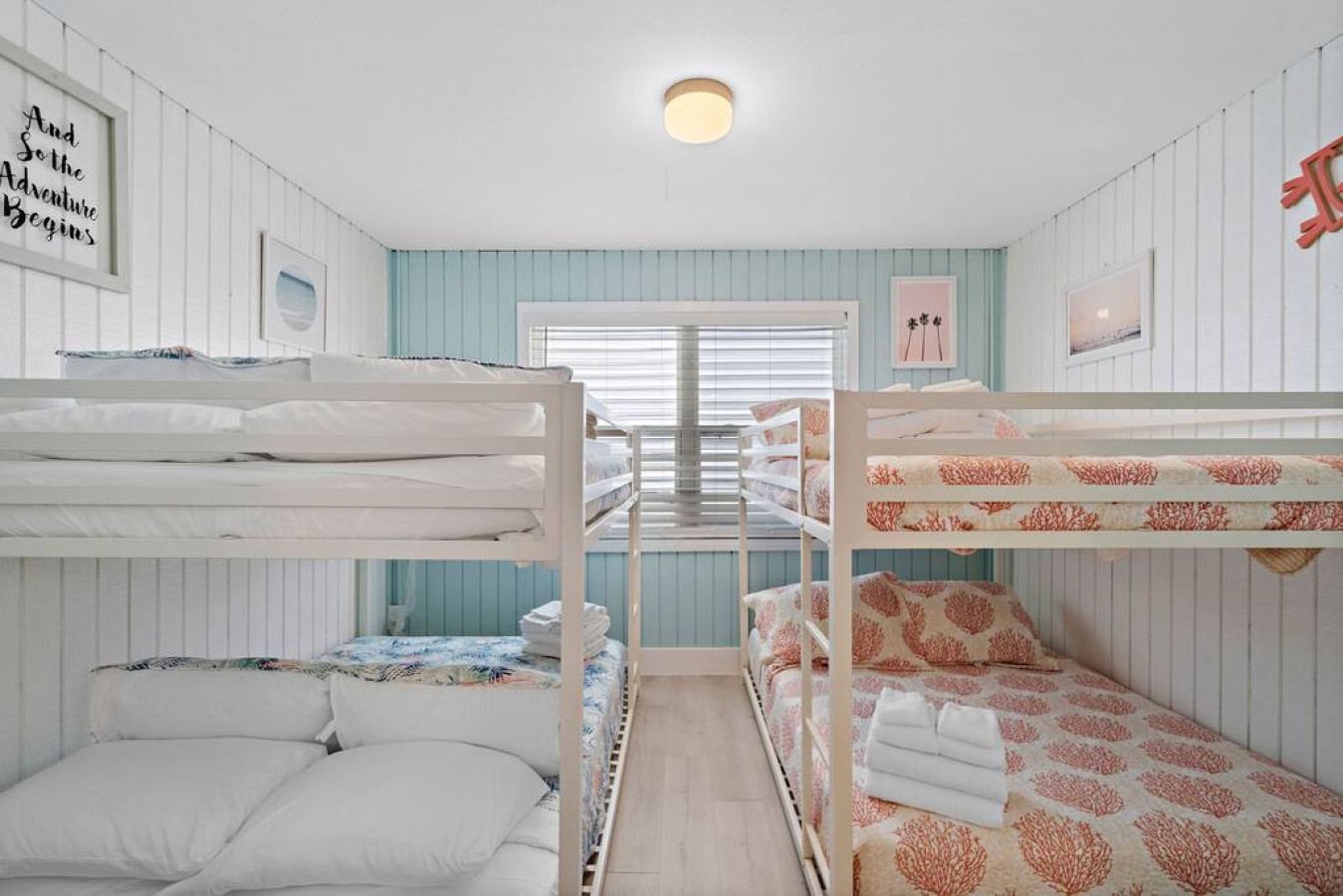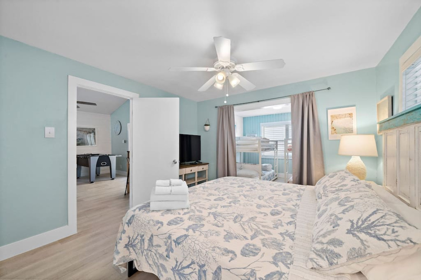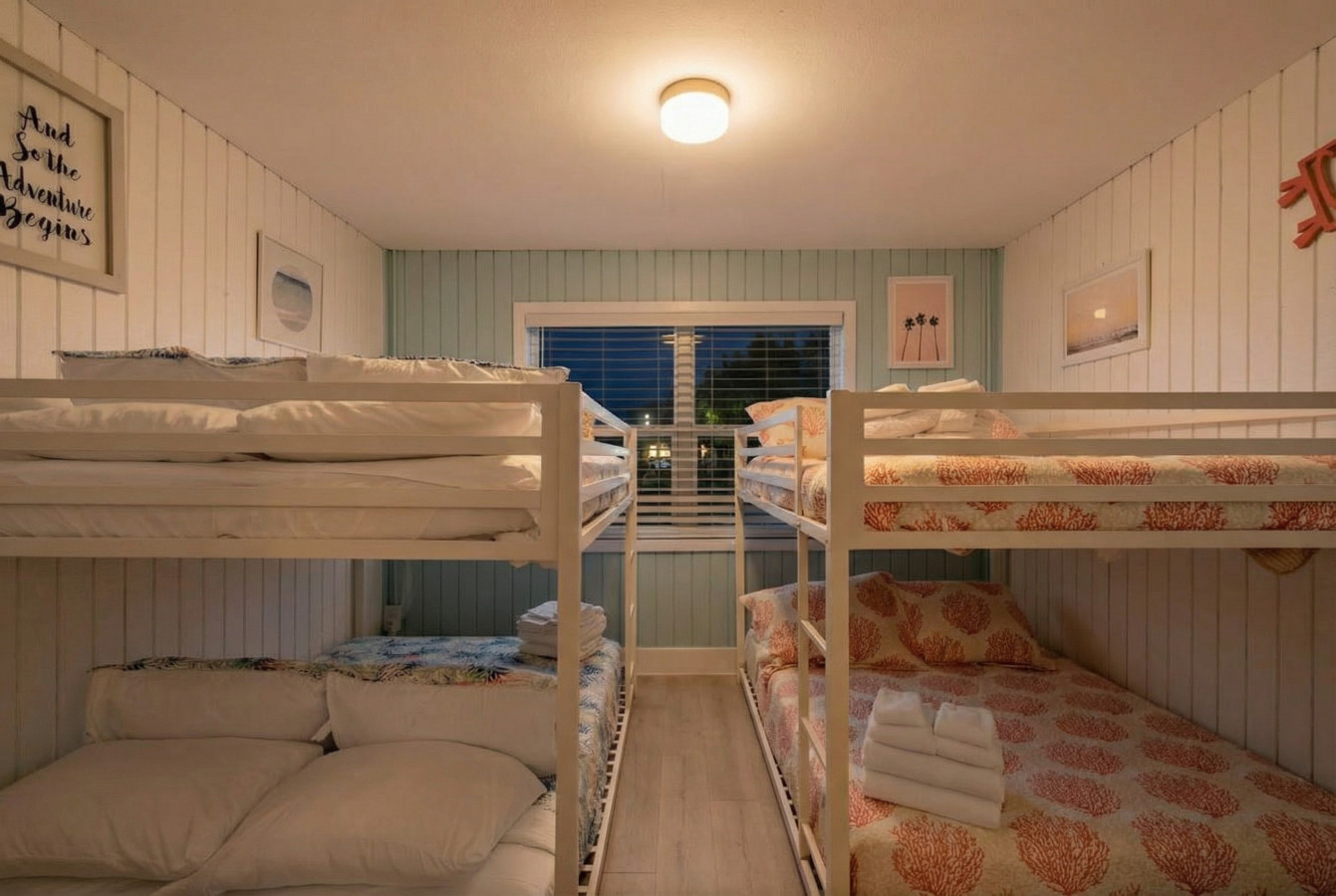 The main level master suite boasts a king-size bed and en suite bathroom, with a connected area with two full-over-full bunk beds for the kids. Two additional bedrooms with king-sized beds and a beachy vibe complete the upstairs sleeping quarters. There is also a full bathroom that serves both guest bedrooms and the living area. For additional bedrooms, head on downstairs. There are two bunk rooms each with a full-over-full bunk bed that share a jack-and-jill bathroom.