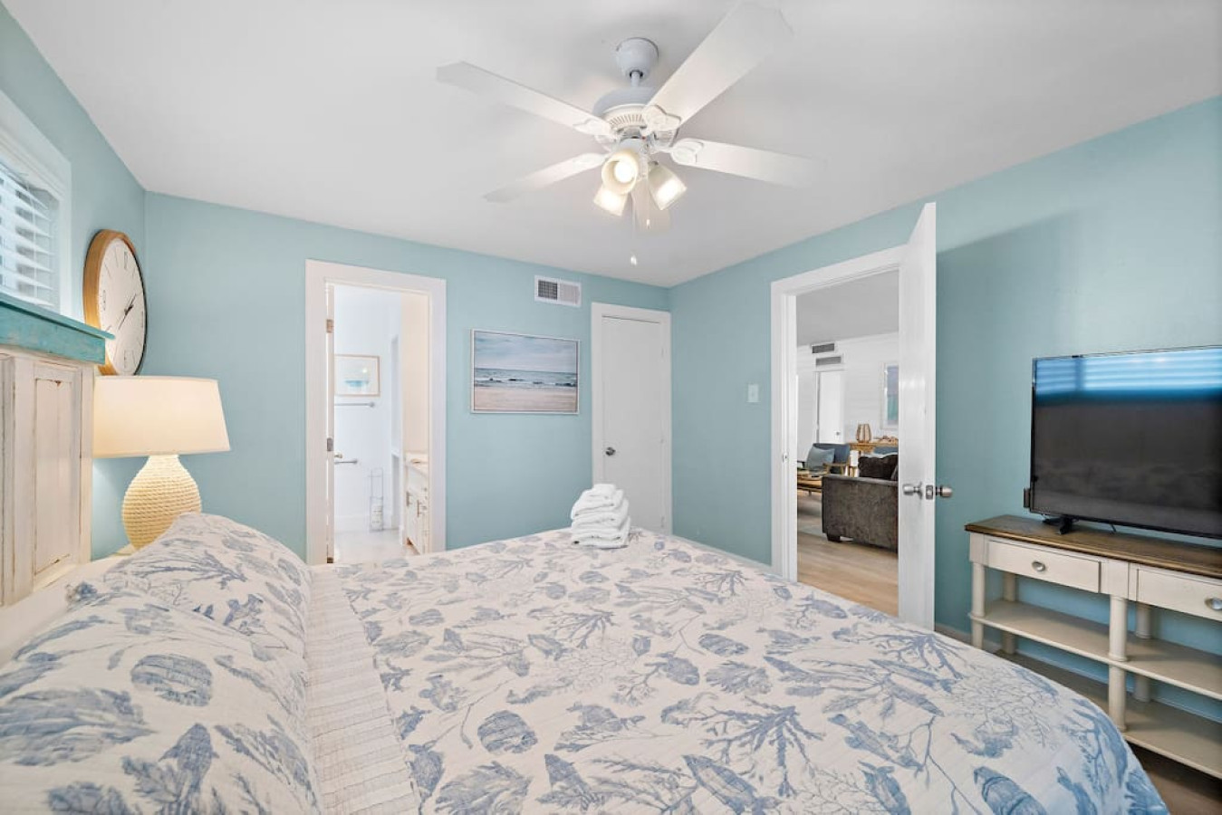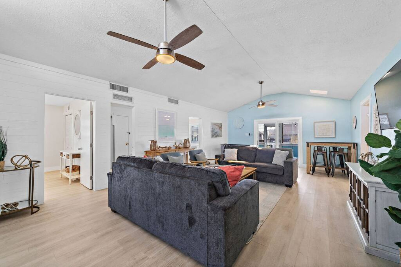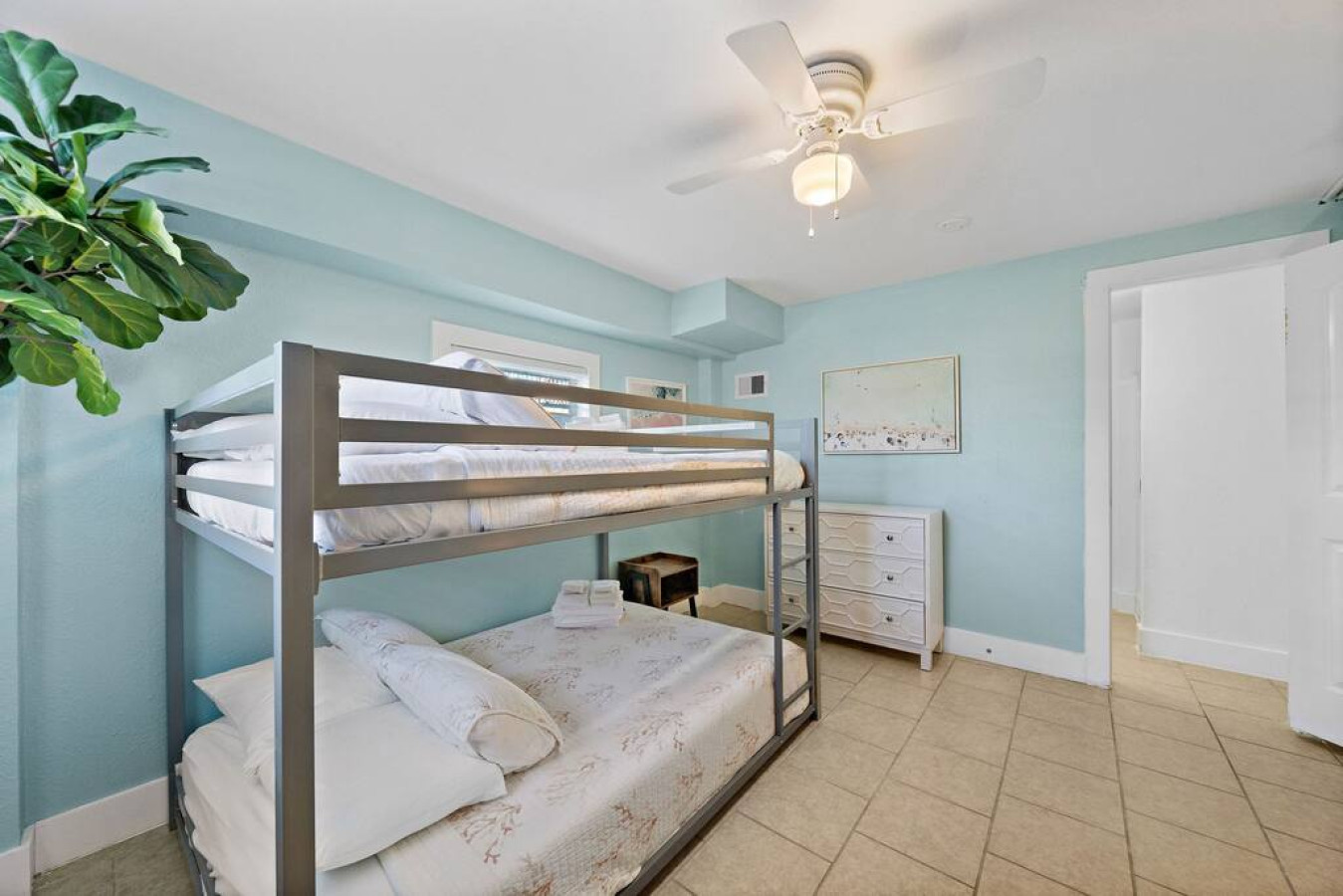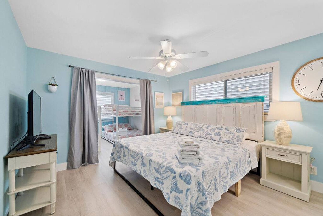 The main level master suite boasts a king-size bed and en suite bathroom, with a connected area with two full-over-full bunk beds for the kids. Two additional bedrooms with king-sized beds and a beachy vibe complete the upstairs sleeping quarters. There is also a full bathroom that serves both guest bedrooms and the living area. For additional bedrooms, head on downstairs. There are two bunk rooms each with a full-over-full bunk bed that share a jack-and-jill bathroom.