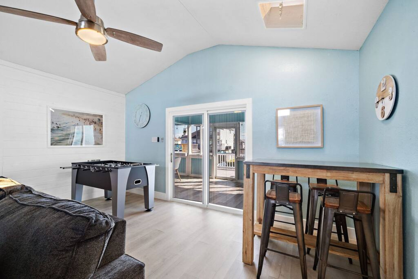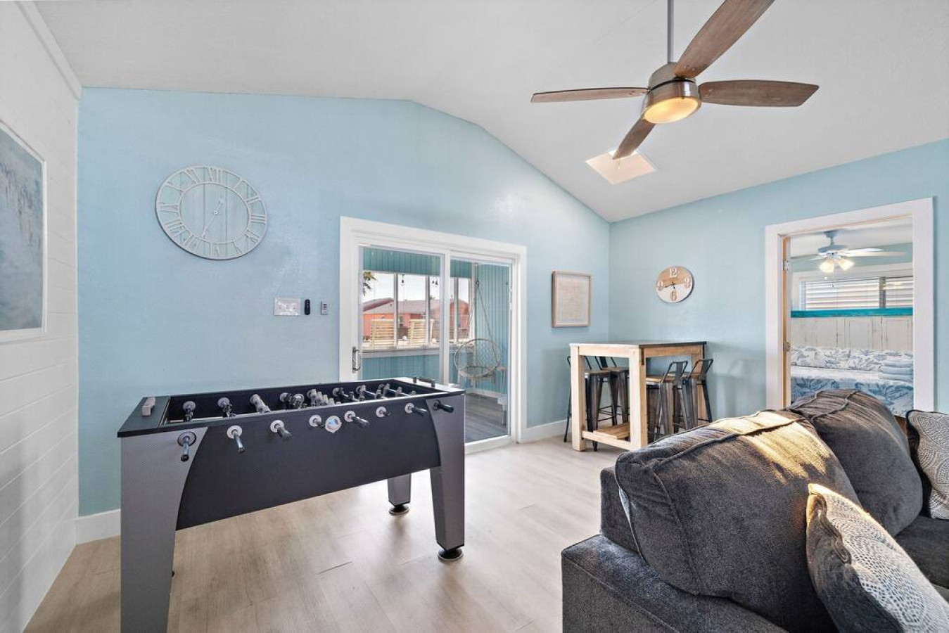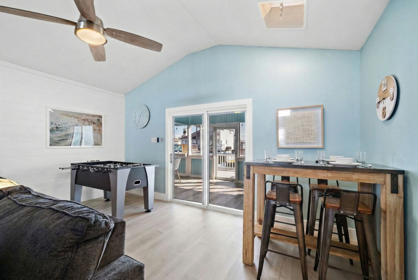 Welcome to Jamaica Cove! Upstairs, a spacious living area boasts plush seating and a large TV – perfect for movie nights with popcorn and laughter. Located in the living room, a foosball table and a bar area set the stage for friendly competitions and fun.