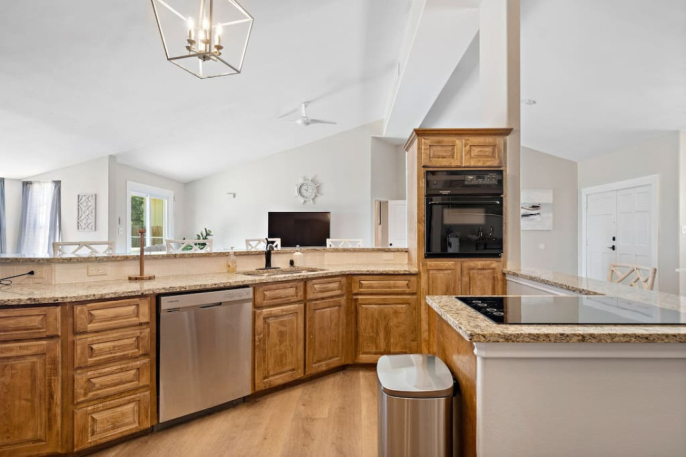 Lakefront Landing boasts a spacious layout, perfect for families or groups of friends. The main living area is open and inviting, leading out to a large deck overlooking the lake. The living room is open to the dining area as well as the kitchen. The kitchen is equipped with everything you’ll need to prepare delicious meals.