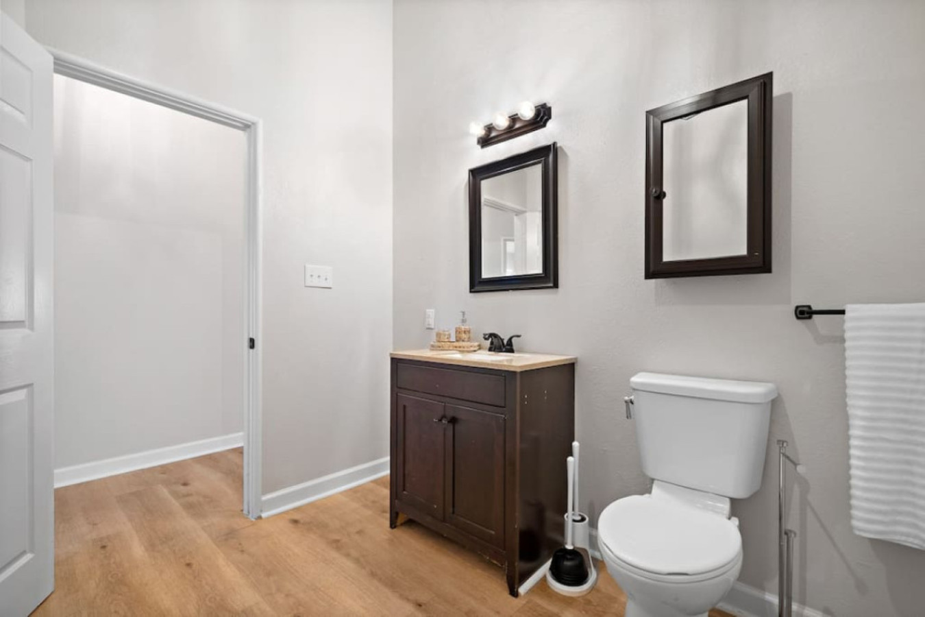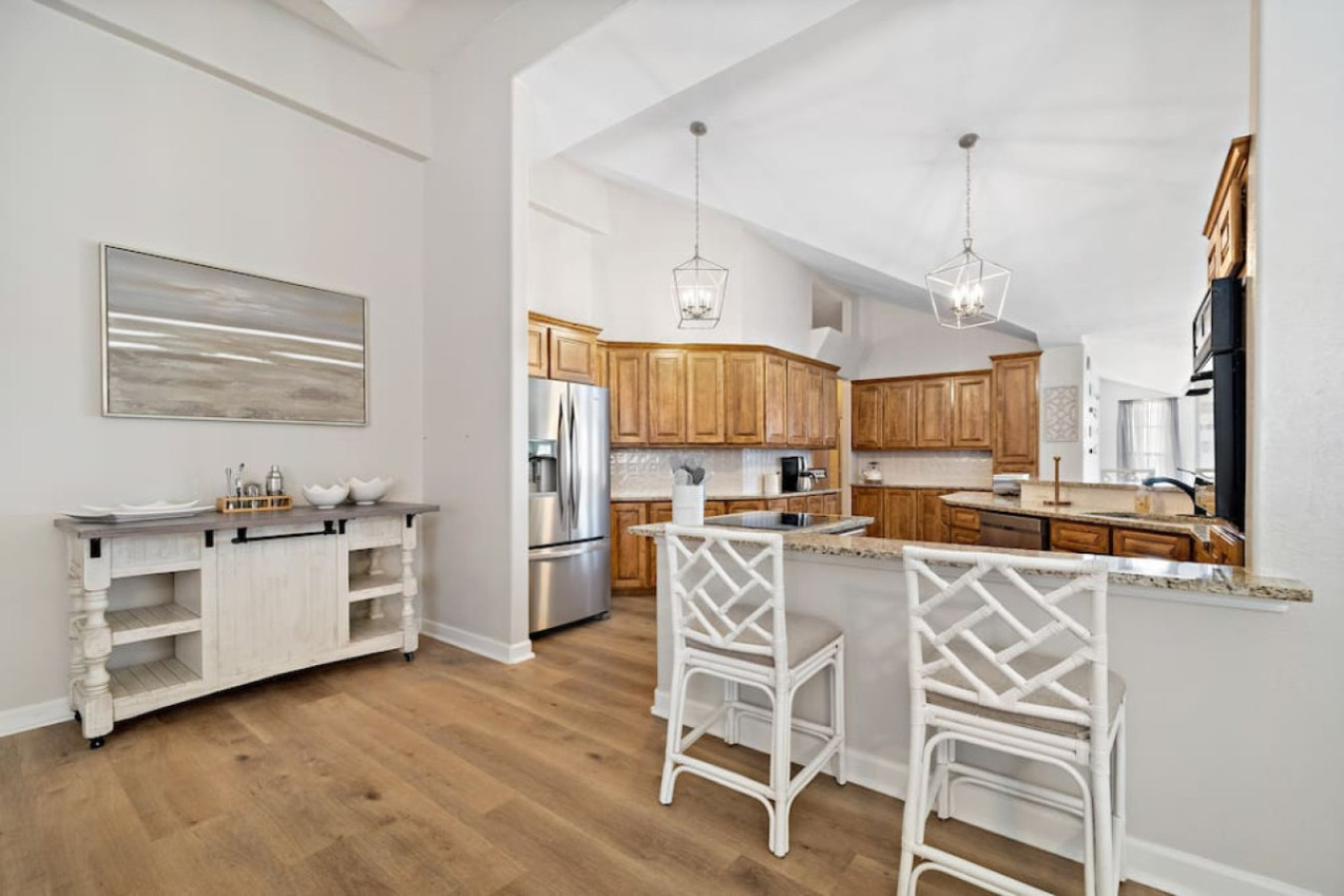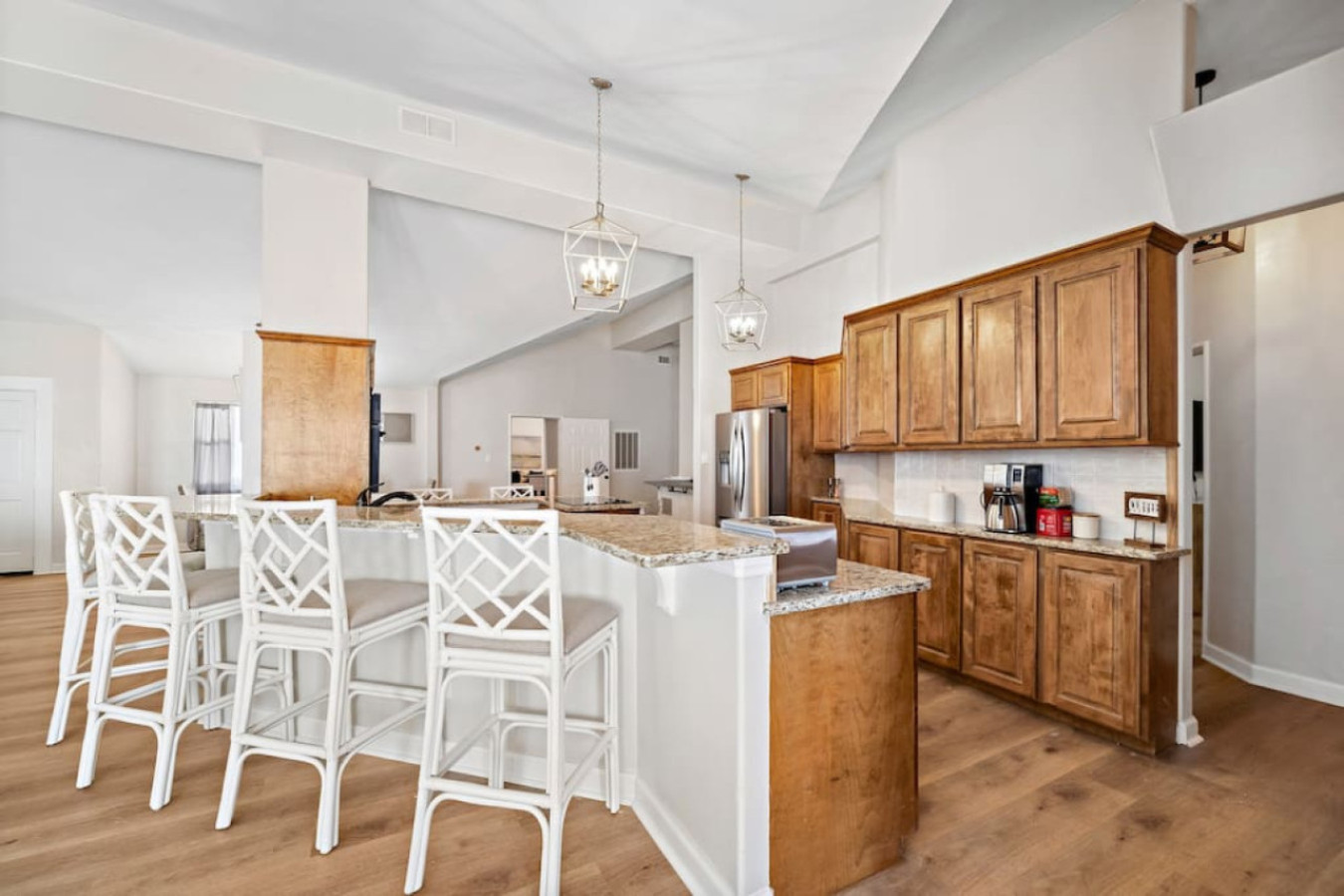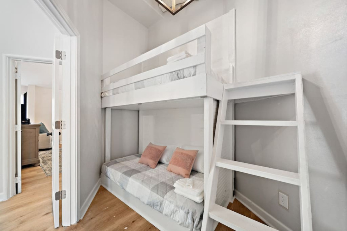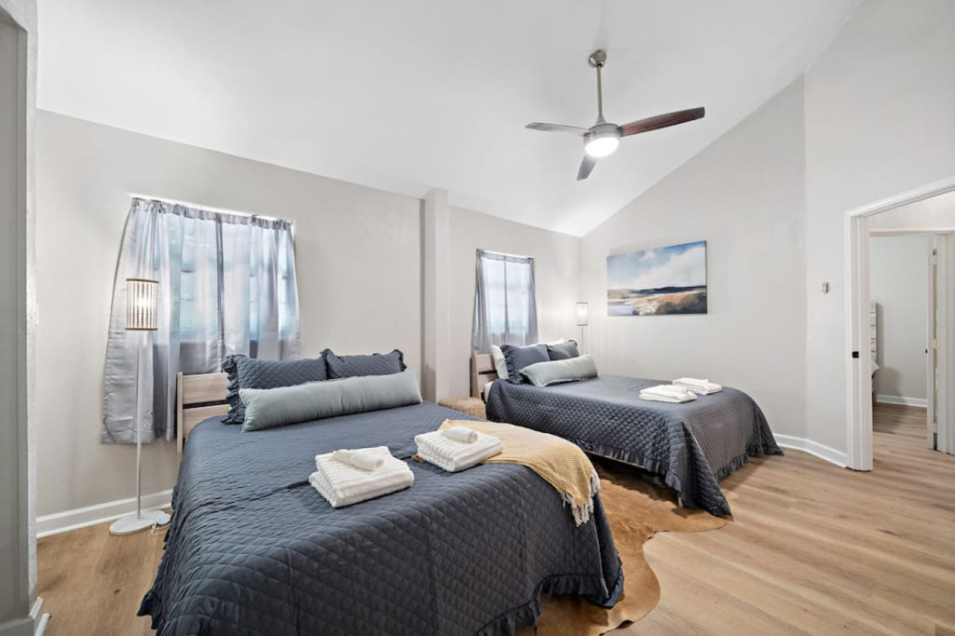 Off the kitchen is a hallway that leads to the other bedrooms. The first one you’ll find is a comfortable bedroom with two queen-sized beds. Next door to that one, another bedroom offers a king-sized bed for a restful night’s sleep.