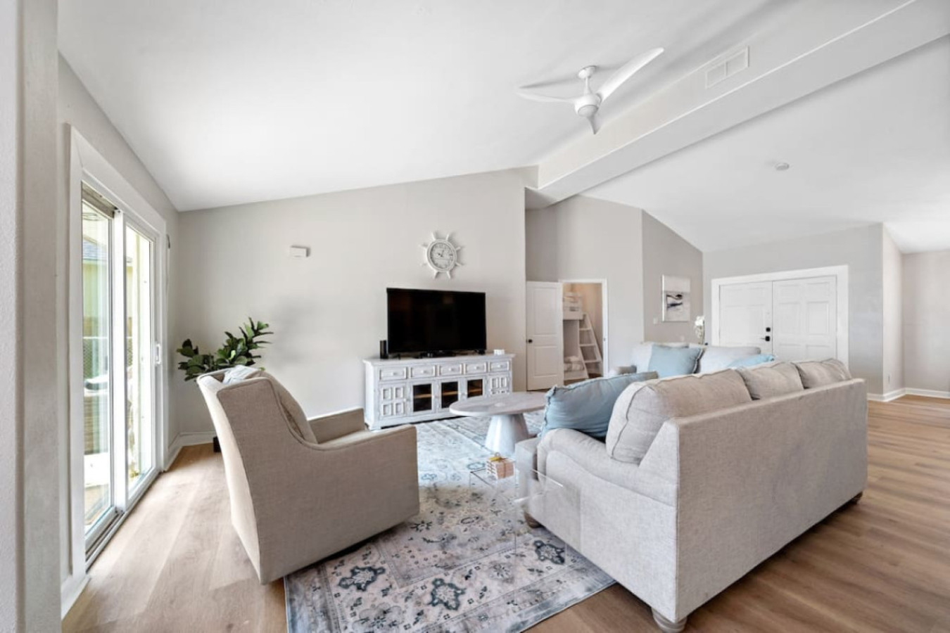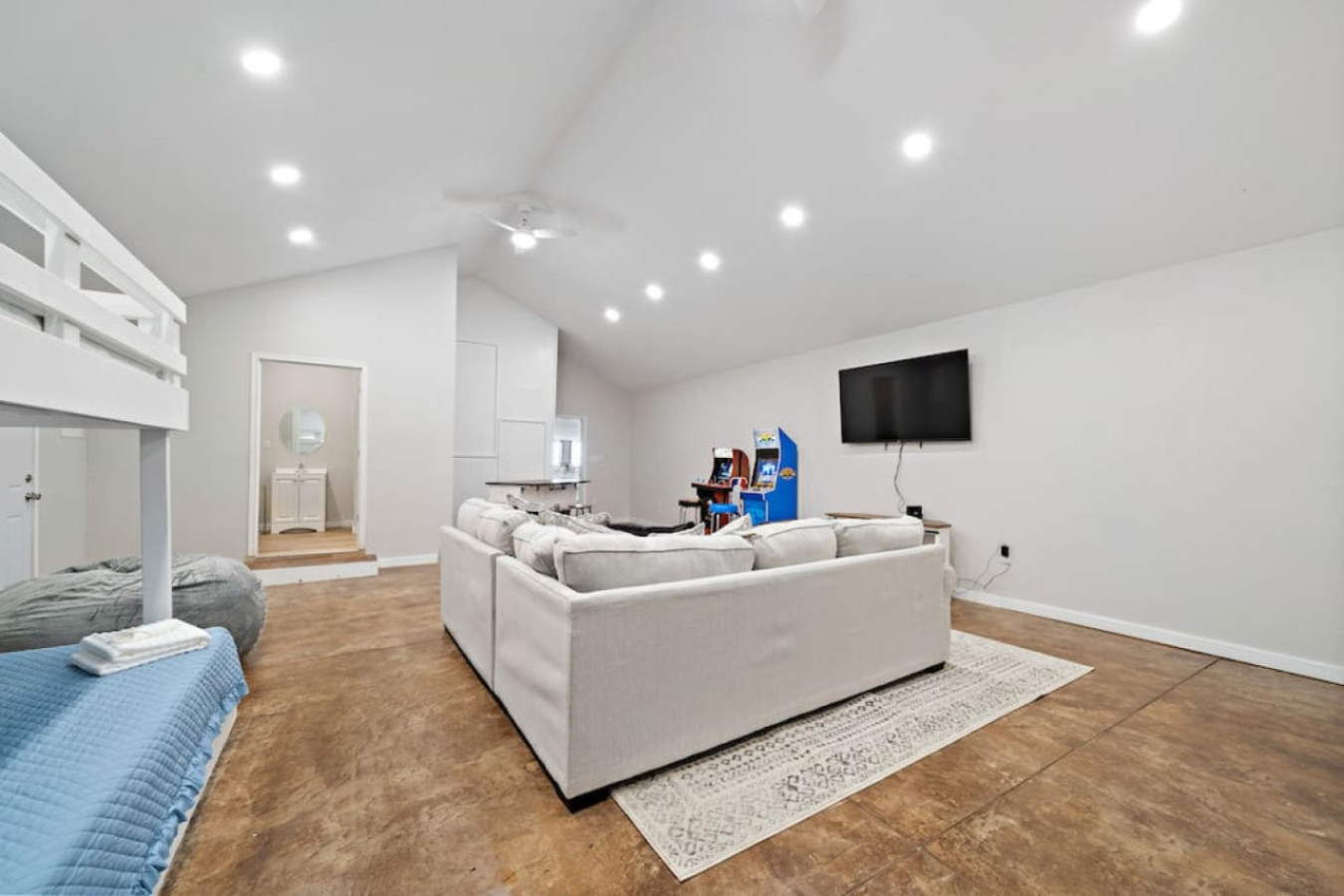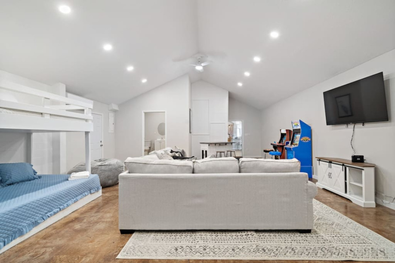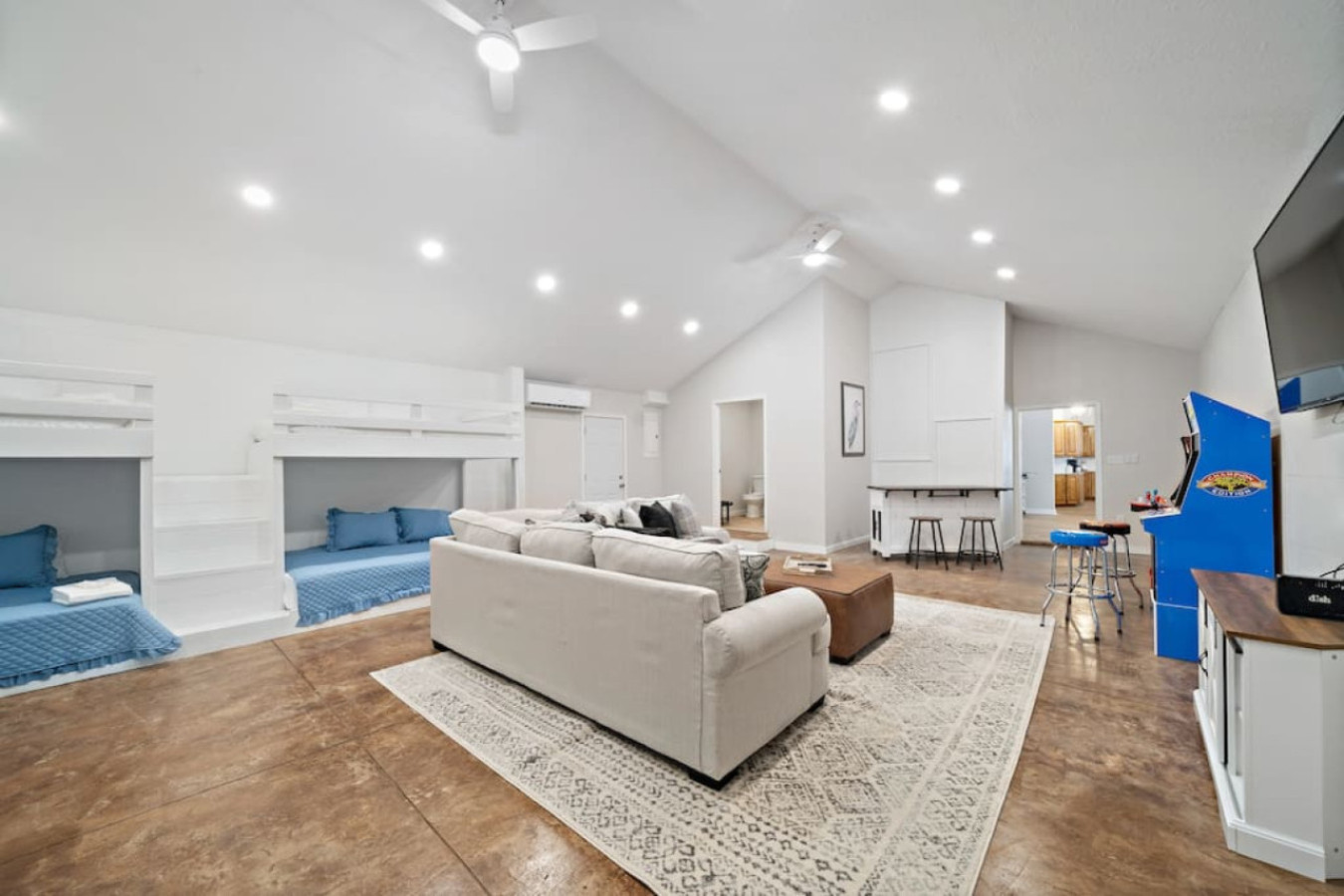 Off the dining room, you’ll find a unique space that serves double duty. This large room features three queen-over-queen bunk beds, creating a fun and functional bunk room. During the day, it transforms into the perfect spot for friendly competition as a game room, complete with arcade games, a big-screen TV for movie nights, and a dry bar area for whipping up refreshments.