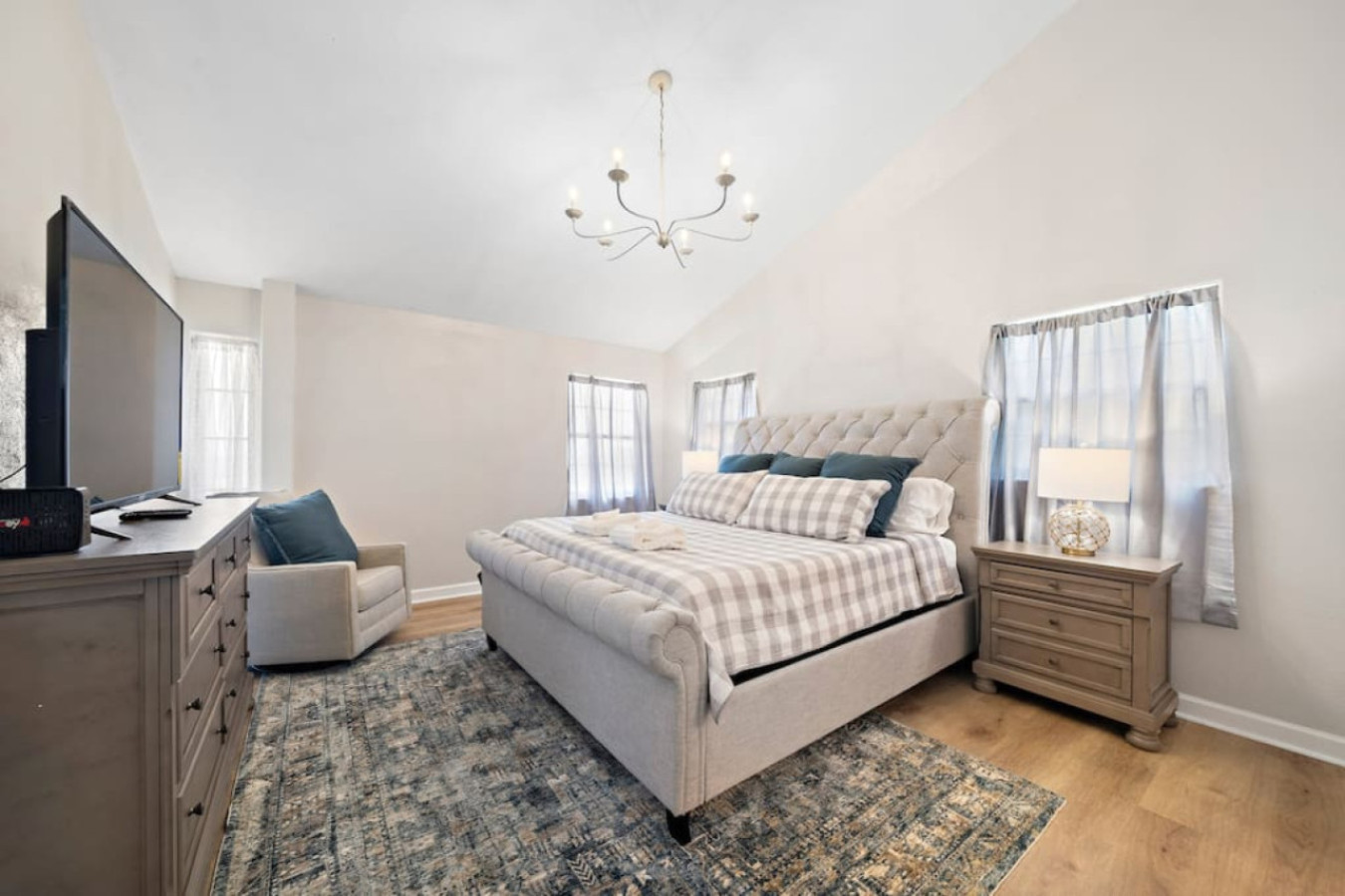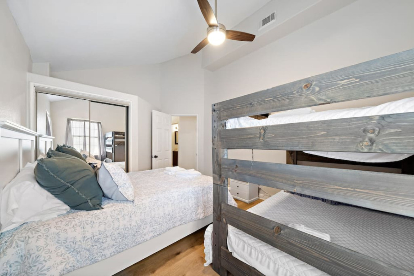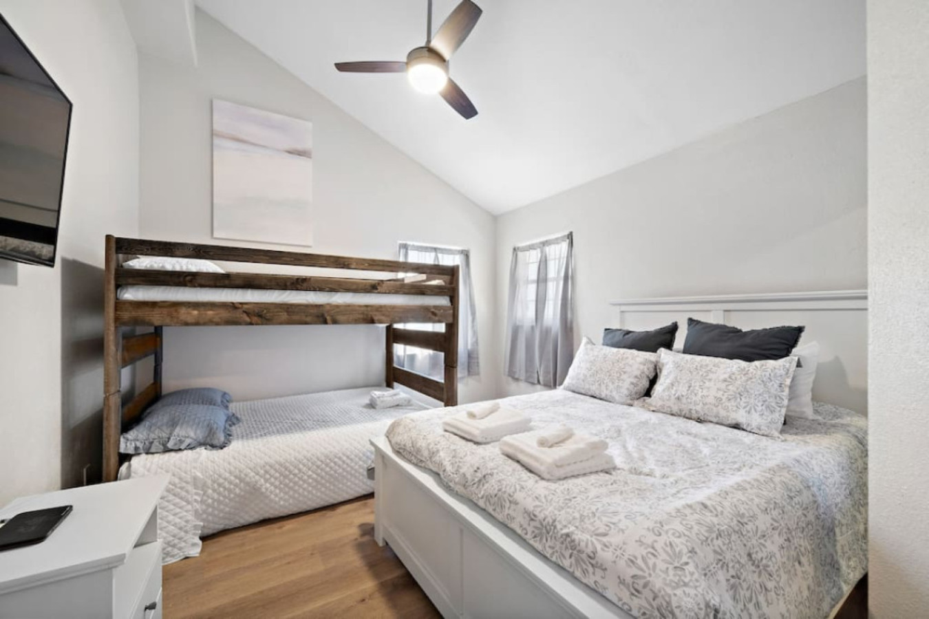 The two bedrooms on the lakeside of the home provide additional options. One features a king-sized bed, while the other offers a queen-sized bed with a full-over-full bunk bed, perfect for accommodating extra guests. With this variety of sleeping arrangements, Lakefront Landing can comfortably host your entire group.