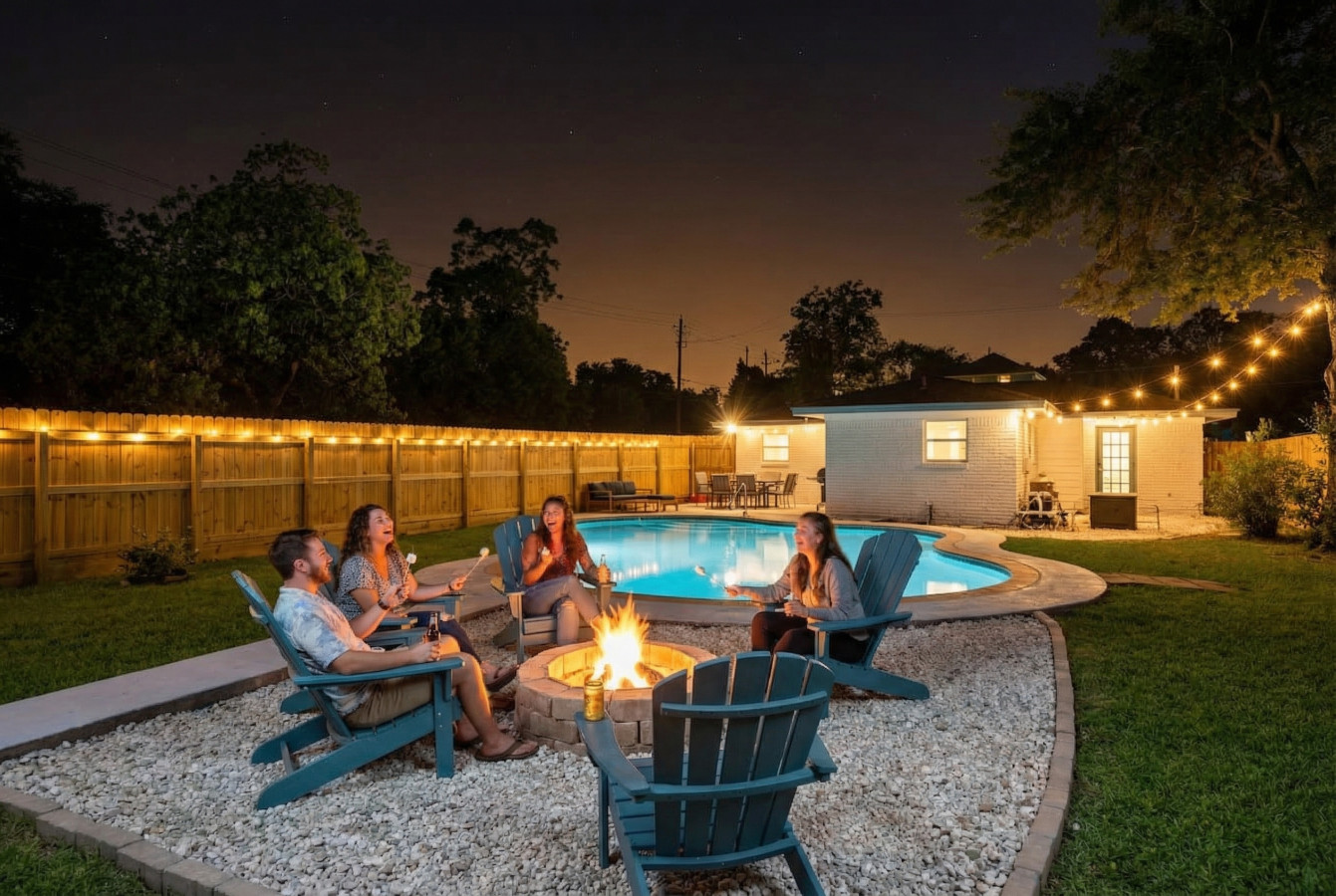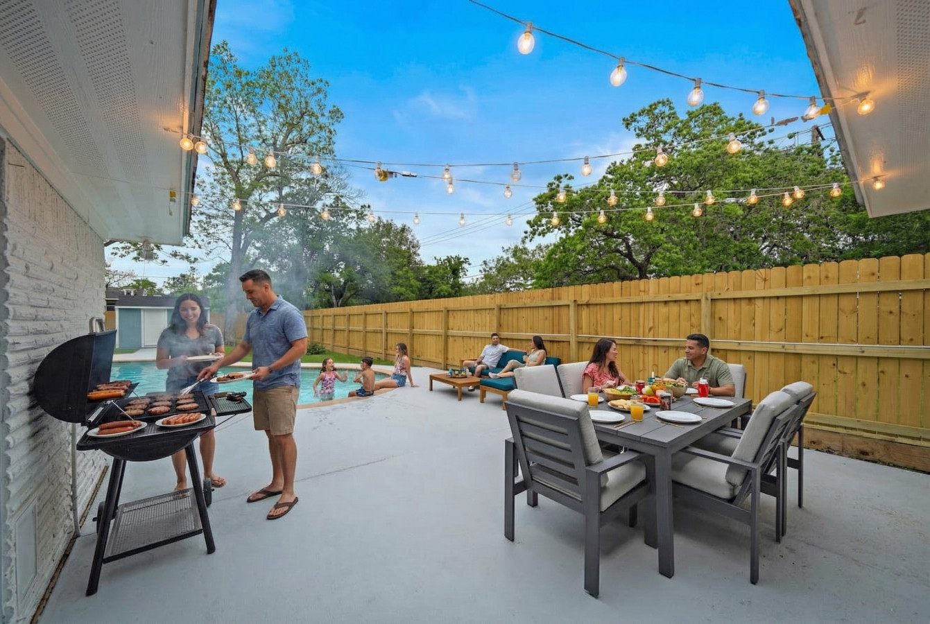 The glass french doors off the living room open up to the patio and pool area, with twinkling string lights and an outdoor table and lounge seating. Beyond the pool is an outdoor fire pit and large grassy area for lawn games and space for your pups to run free. When you’re ready to go exploring, restaurants, shops and fun at the Kemah Boardwalk are a short walk away!