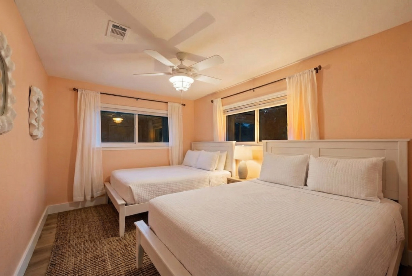 The master suite is off the kitchen and features a comfy king size bed, glass french doors leading out to the patio and pool, and a full bathroom with a standing shower. The third bedroom is off the living room with vibrant pink walls and two queen beds. The second full bathroom is next door with a beautiful tiled shower and built-in shelves.